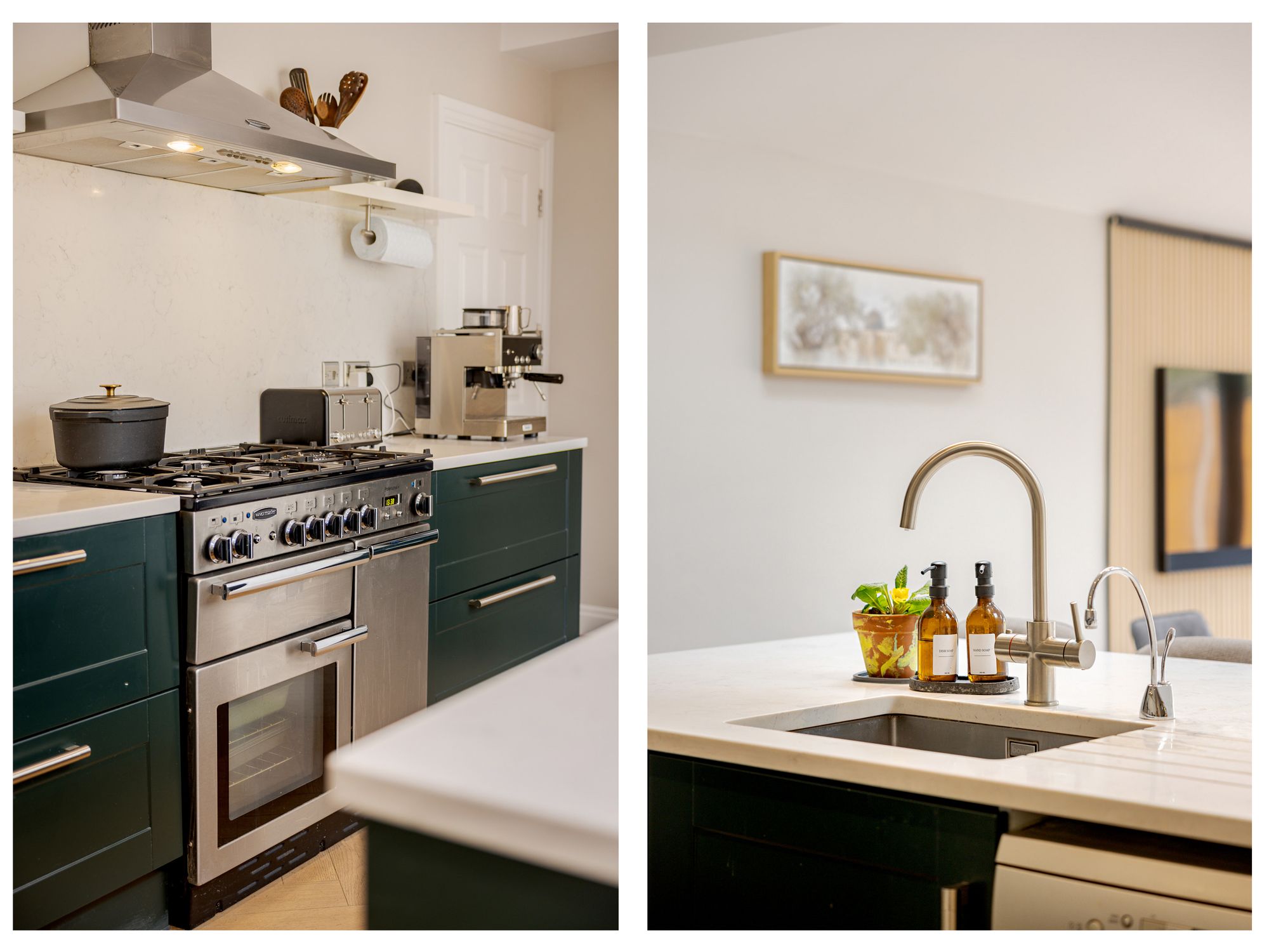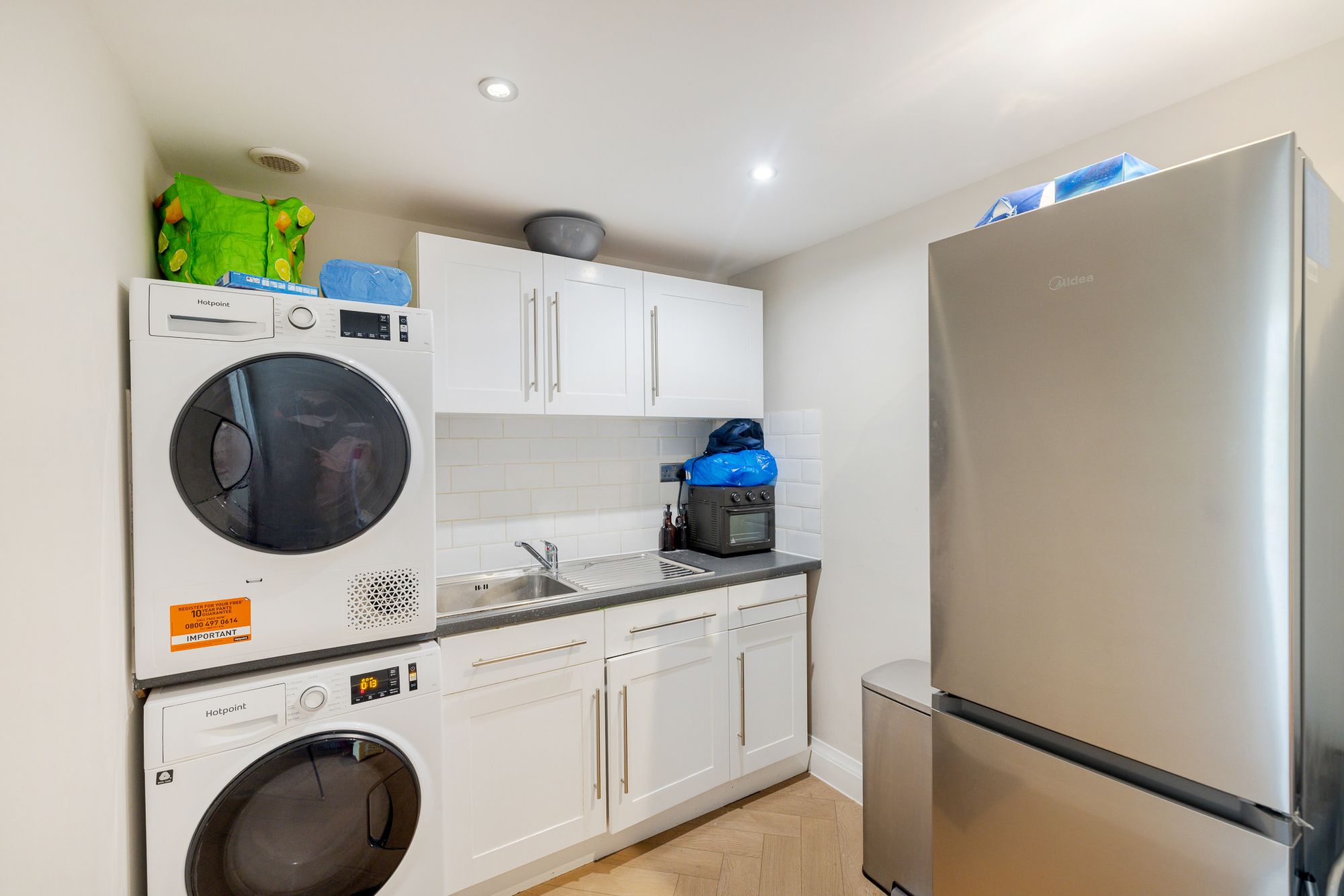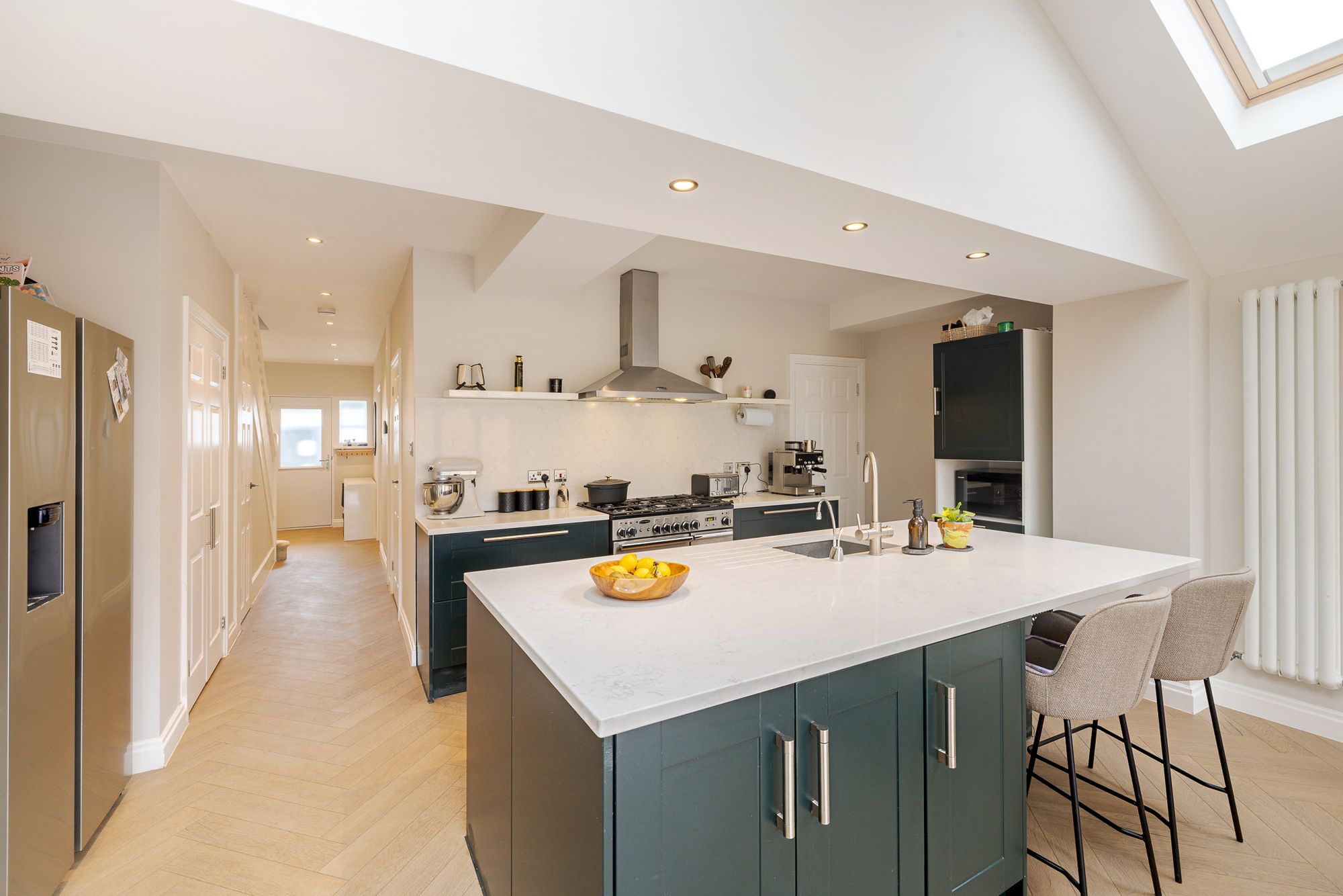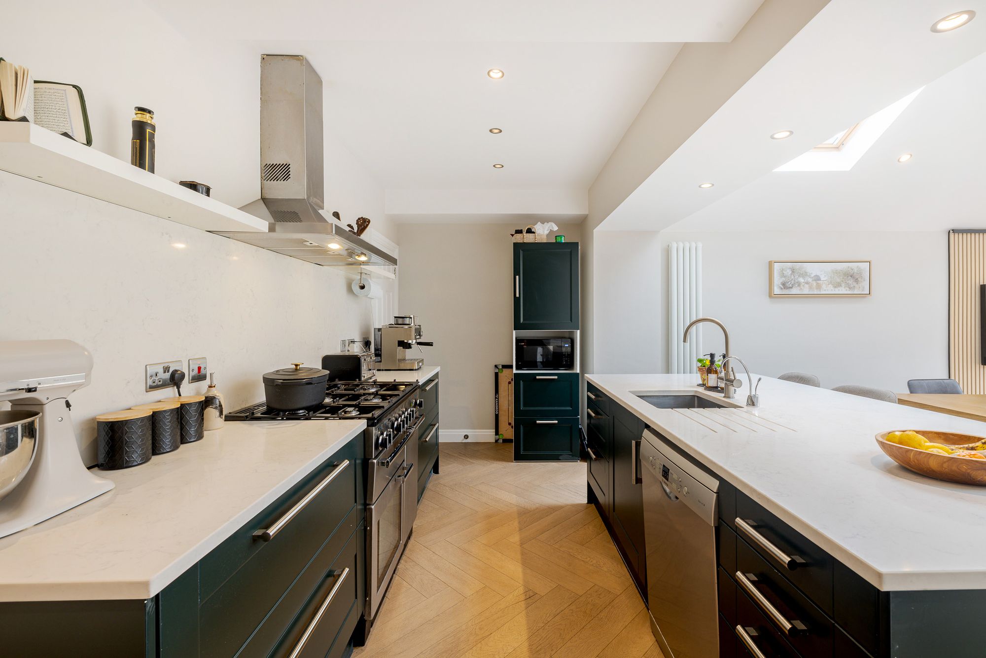 To the rear, the property truly comes into its own with an impressive open-plan kitchen/family room, designed with both style and functionality in mind. The shaker style kitchen is complemented by quartz worktops, a feature island, and an abundance of natural light from skylights above. Bifolding doors open seamlessly onto the garden, making this an ideal space for entertaining and everyday family life, with ample room for both dining and relaxing. Herringbone flooring runs throughout the entire ground floor, adding a touch of elegance and continuity.