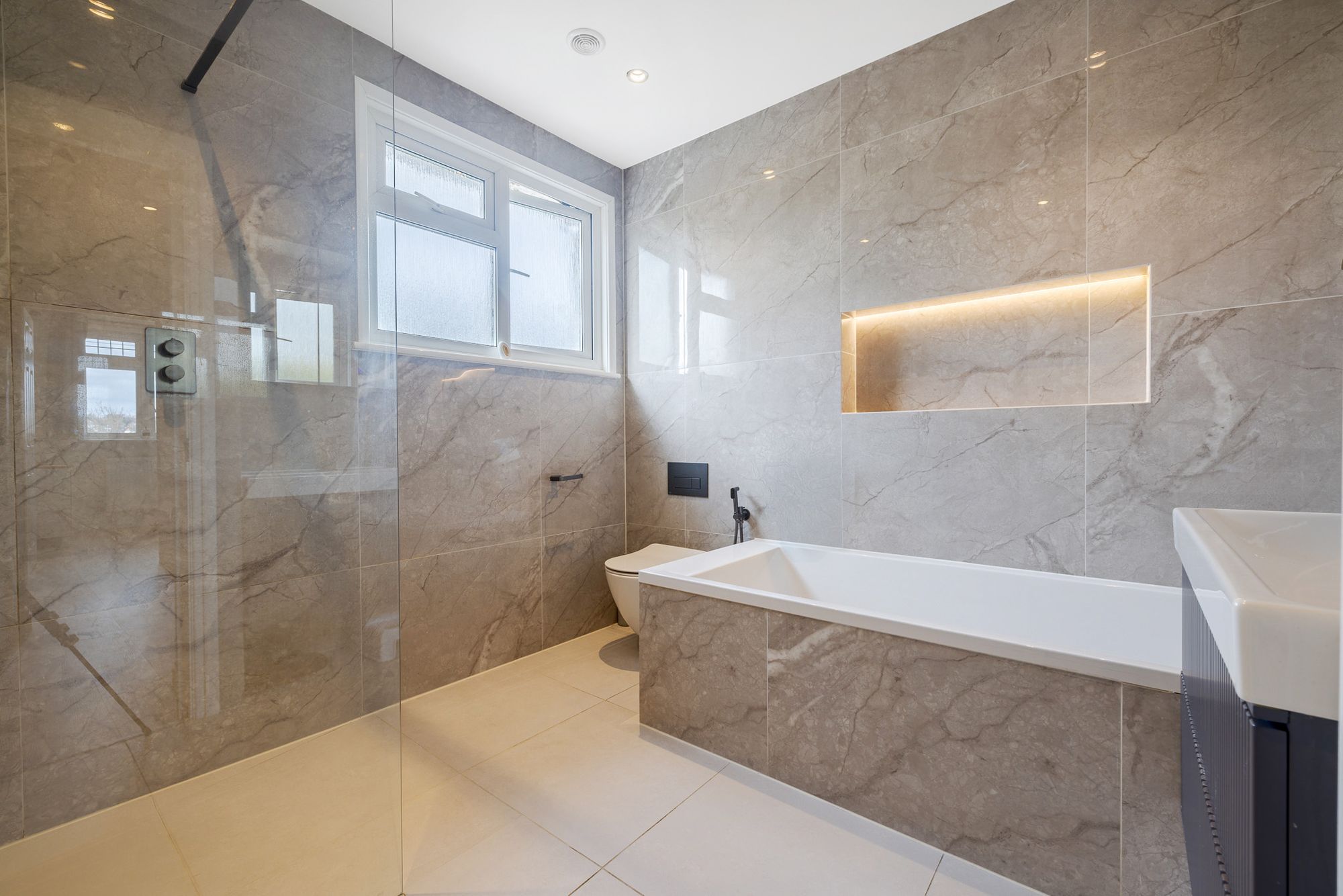 Upstairs, there are two generously sized double bedrooms and a third, smaller bedroom, ideal as a nursery, home office, or guest room. The recently refurbished family bathroom is finished to a high standard and features a four piece suite, including a walk in shower.