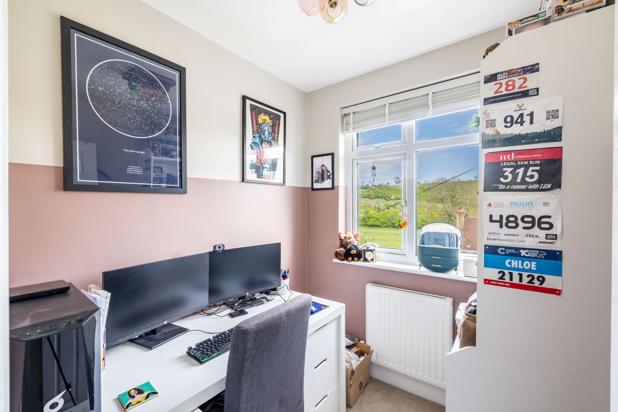 The first floor benefits three bedrooms, two of which are generous size doubles and third is currently used as a home office. A family bathroom completes this floor with bath and overhead shower.