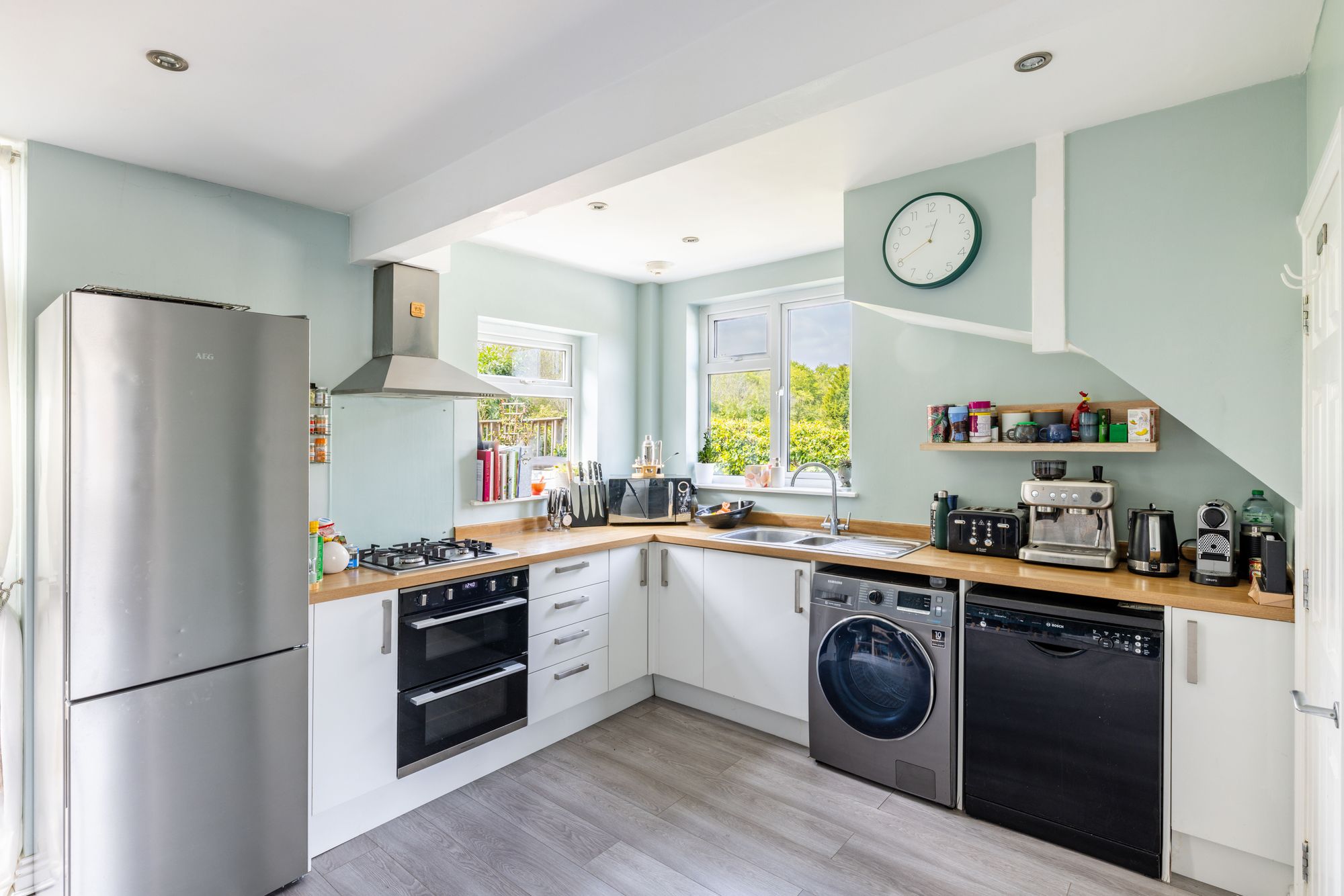 As you enter the front door you are welcomed into a spacious entrance hall with space to hang coats and store shoes. This leads through to the dual aspect L shaped kitchen, dining and living space which is filled with natural light through the front and rear windows. The kitchen is equipped with base level units, plenty of worktop area and space for fridge/freezer, washing machine and dishwasher. French doors lead out onto the rear patio area.