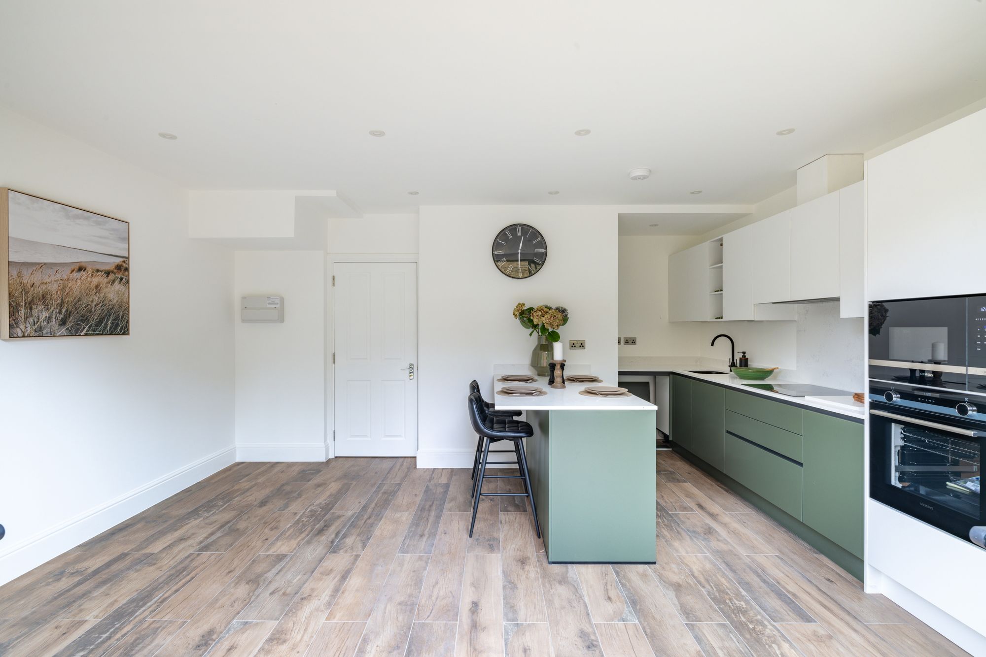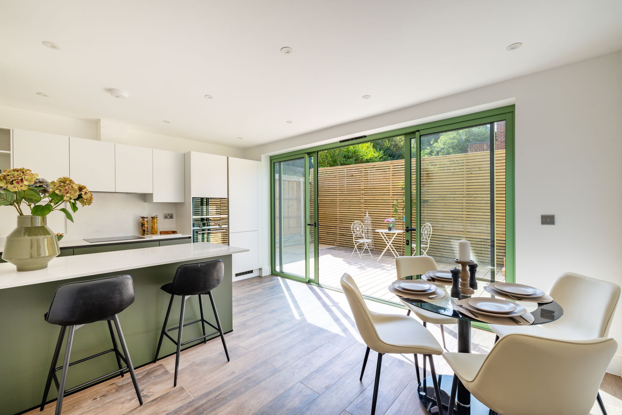 Designed with modern living in mind, each home boasts open-plan layouts, underfloor heating, and high-spec interiors. The welcoming entrance hallway leads through to a stunning open-plan kitchen and dining area at the rear of the home, naturally illuminated by large sliding doors opening onto a private landscaped garden, ideal for seamless indoor-outdoor entertaining.