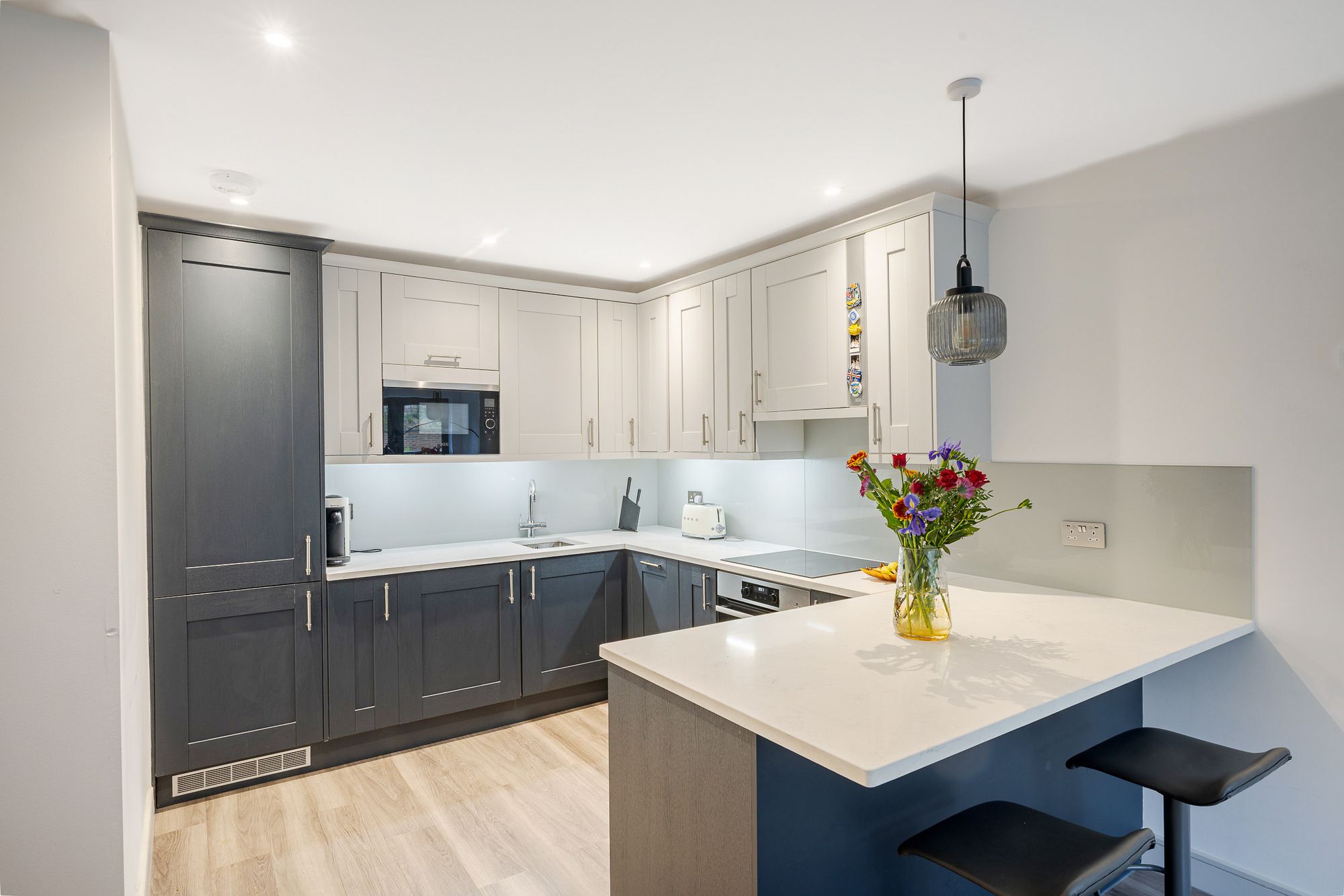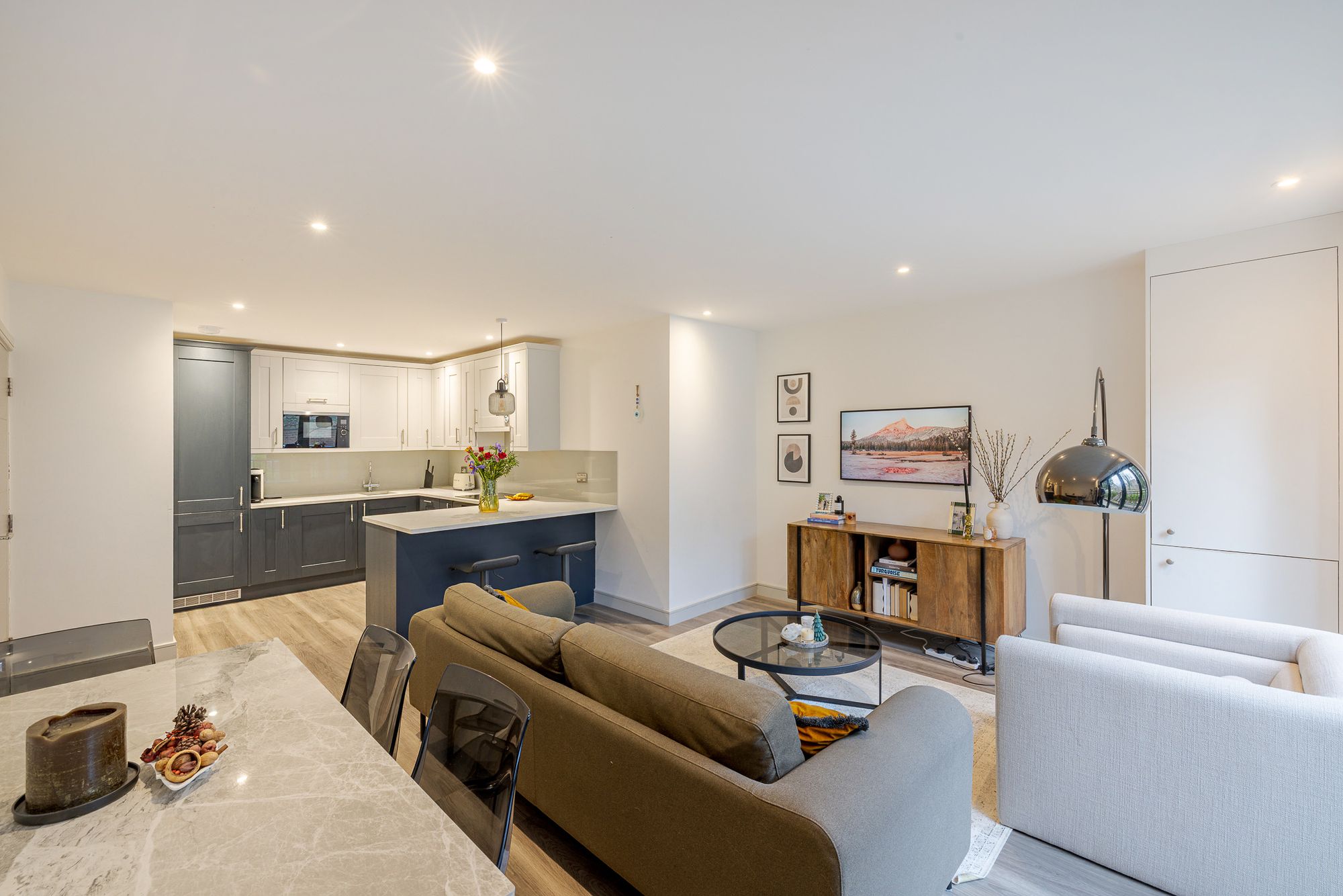 The accommodation briefly comprises a welcoming entrance hall leading to an open-plan kitchen/reception room, featuring fully integrated appliances, a stylish breakfast bar peninsula, and a boiling water tap. Bi-folding doors open onto a private balcony, enhancing the sense of space and natural light. The generous reception area is ideal for entertaining, comfortably accommodating both living and dining areas.