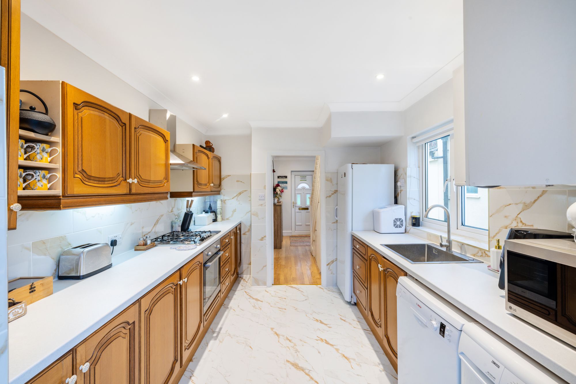 The property welcomes you with an entrance hall leading through to a large open plan living and dining room, flooded with natural light from a generous front facing window, creating a bright and inviting space for both relaxing and entertaining. A separate galley kitchen provides ample storage and workspace and leads through to an additional reception room at the rear of the house. Currently used as a TV room, this flexible space would also make an excellent home office or children’s playroom. A rear door opens directly onto the garden.