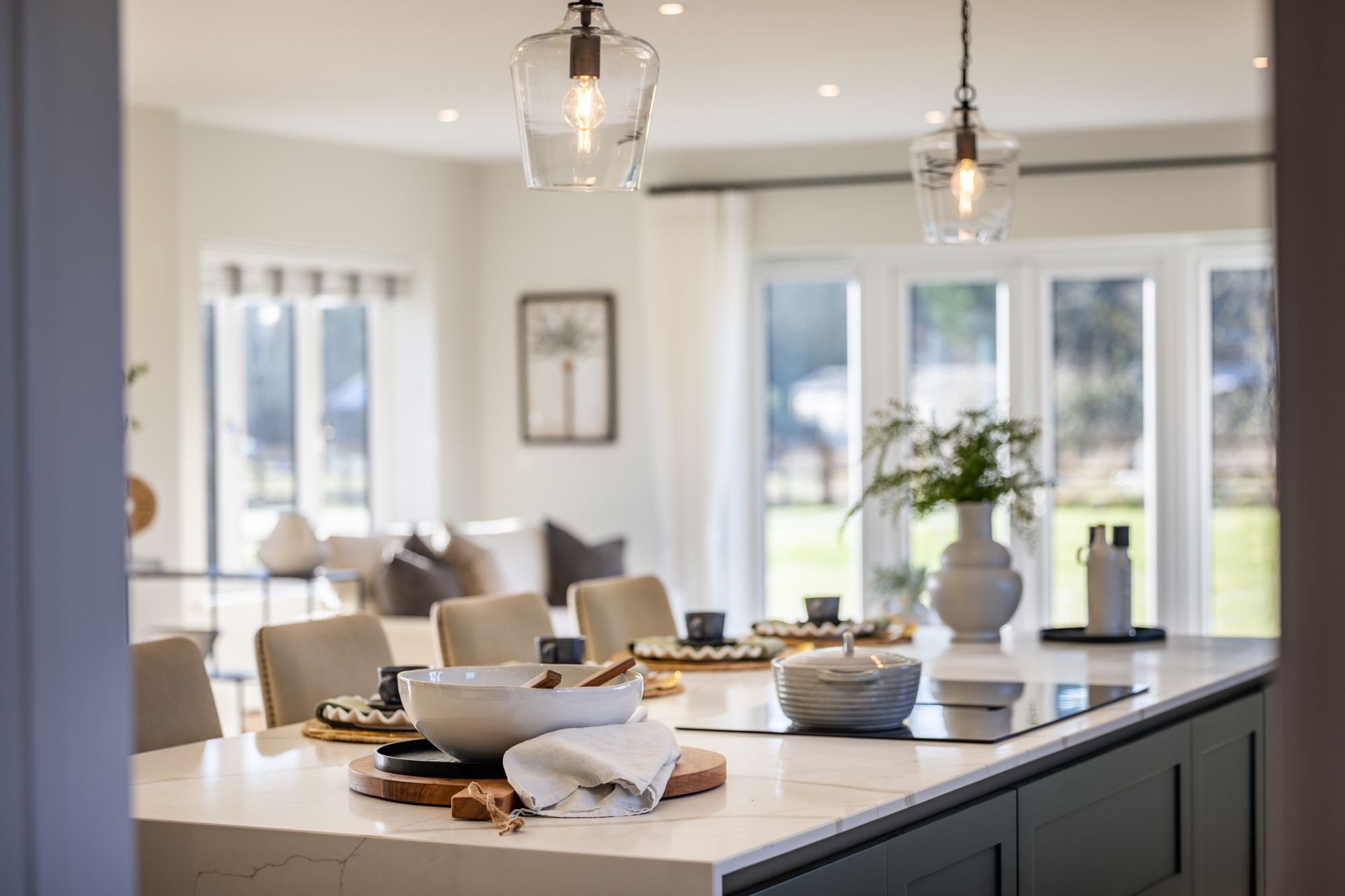 At you move from the hall to the back of the house you enter the bright open plan kitchen/dining/living room (one of four reception rooms), bathed in natural light from the dual aspect windows and doors that offer stunning views of the adjacent garden and surrounding countryside. The impressive custom kitchen features shaker style cabinetry, highlighted by a striking waterfall island/breakfast bar, beautifully paired with Quartz composite stone worktops and stylish glass splashbacks behind the hob. High quality Neff or Siemens appliances are seamlessly integrated, including a combination oven, single oven, fridge/freezer, dishwasher, and an induction hob (excluding plots 19-22), along with a built-in stainless steel extractor hood, depending on the layout.