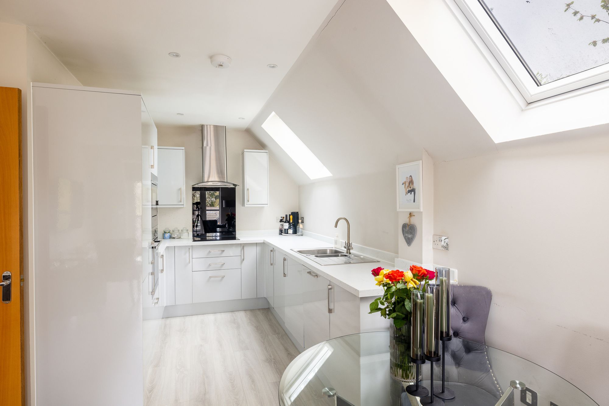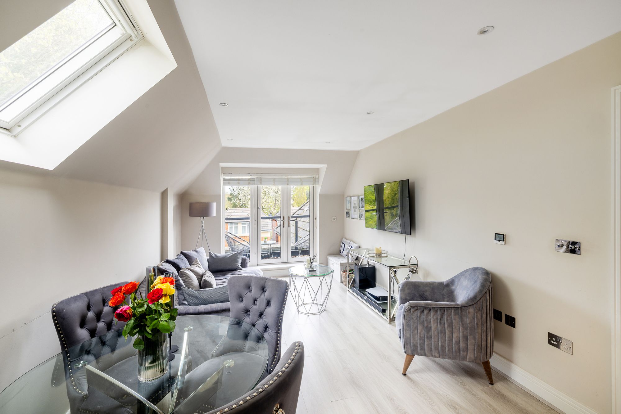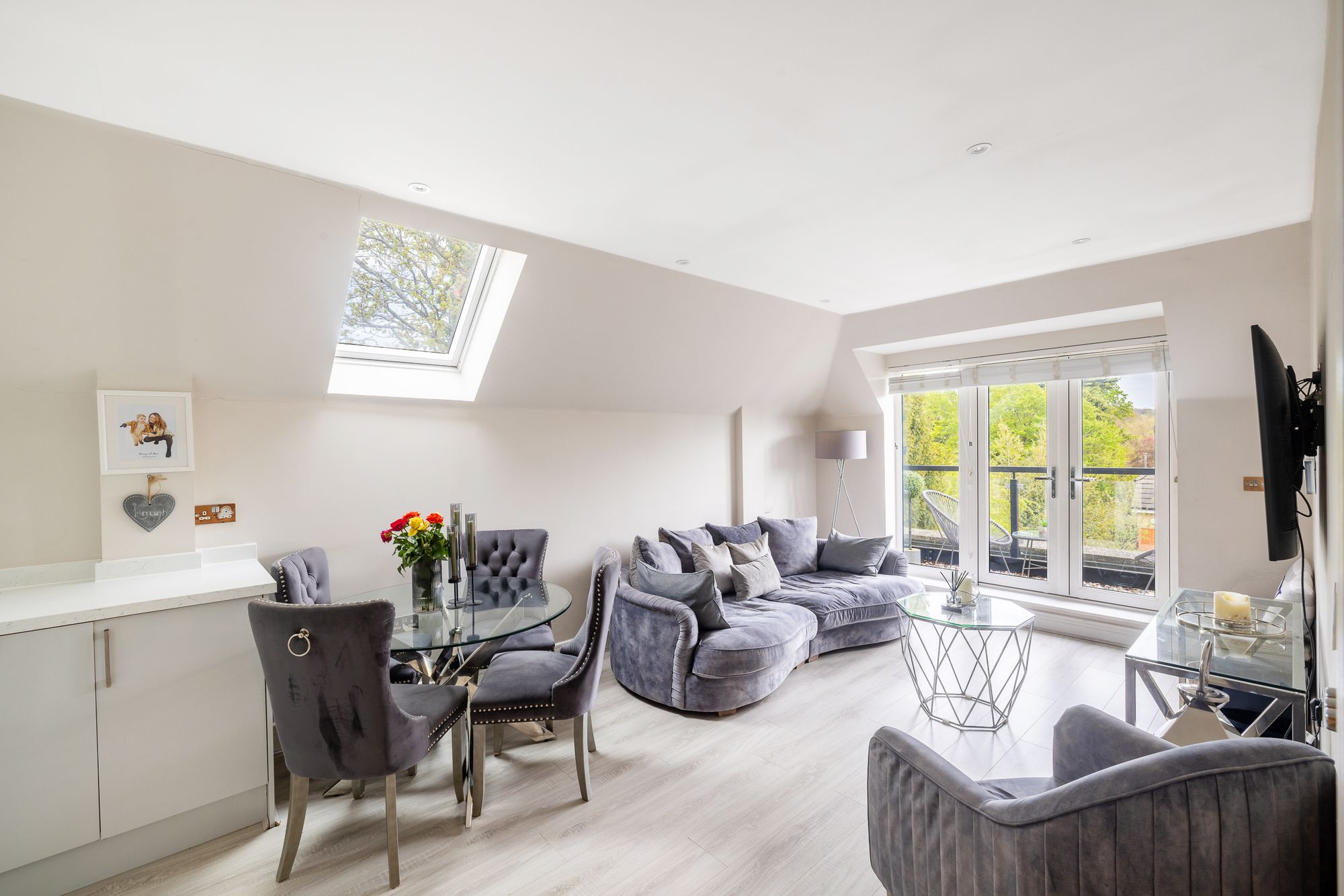 This impressive two-bedroom flat offers contemporary living within a sought-after modern development, presenting an ideal opportunity for professionals, couples, or small families. Situated on the top floor and accessed via a lift, the apartment extends over 800 square feet, ensuring a generous sense of space and light throughout. The property’s well-designed layout features a spacious open-plan living and dining area, seamlessly connected to a sleek, fully fitted kitchen that boasts integrated AEG appliances and ample storage. Both bedrooms are well-proportioned doubles, with the principal bedroom benefiting from a stylish en suite shower room, while the second bedroom is served by a modern family bathroom, finished with high-quality fixtures and fittings. Large windows and glazed doors allow natural light to flood the living spaces, creating a bright and inviting atmosphere. The private balcony, accessed from the main living area, provides a tranquil setting for relaxation or entertaining guests, with room for seating or a small table. Additional features include a secure allocated parking space (ideal for those commuting or requiring convenience), underfloor heating throughout, and double glazing throughout, ensuring comfort and energy efficiency year-round. The property is located within easy reach of local amenities, shops, and transport links, providing excellent connectivity to the surrounding area and beyond. The apartment has been finished to a high standard, with neutral décor that will appeal to a wide range of tastes and allows for personalisation. Whether you are looking for a low-maintenance home or a sound investment, this top floor flat combines modern design, practical features, and a desirable location. Early viewing is highly recommended to fully appreciate the space, quality, and lifestyle this exceptional property has to offer.