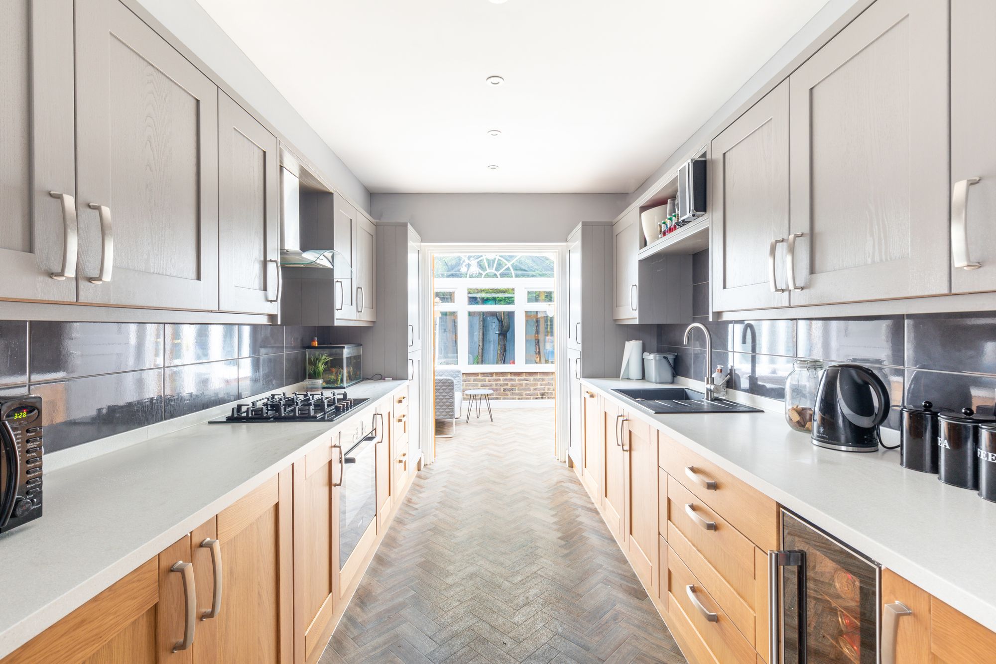 The new contemporary family bathroom comprised of a bath, separate shower, vanity unit and W/C. Finished with grey slate effect tiles and plenty of natural. The modern kitchen offers excellent workspace, built in appliances and room for a breakfast table. This leads out onto a sunny conservatory, which would make an additional lounge or dining space.