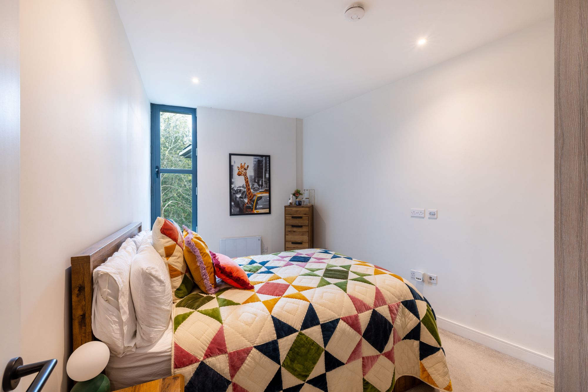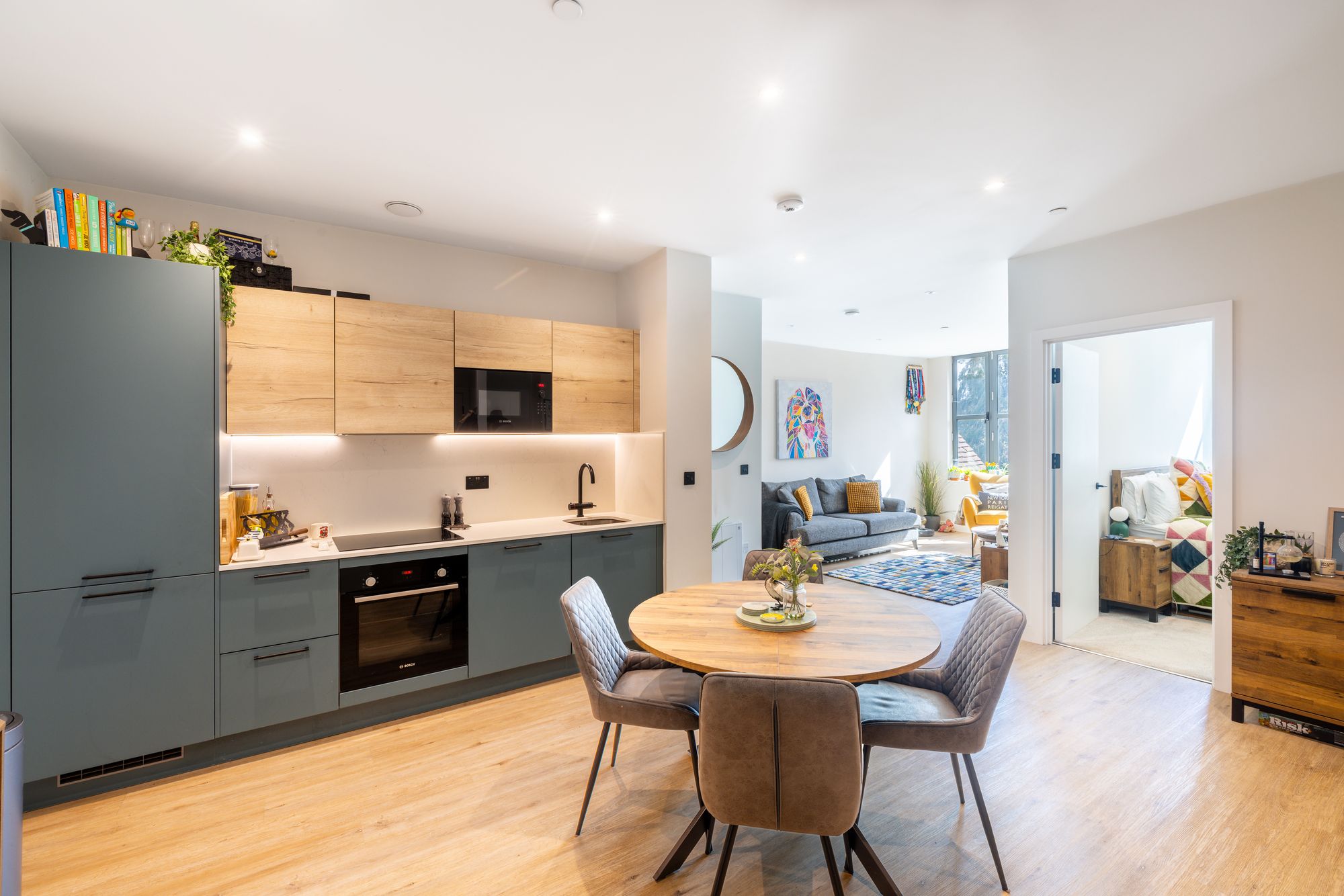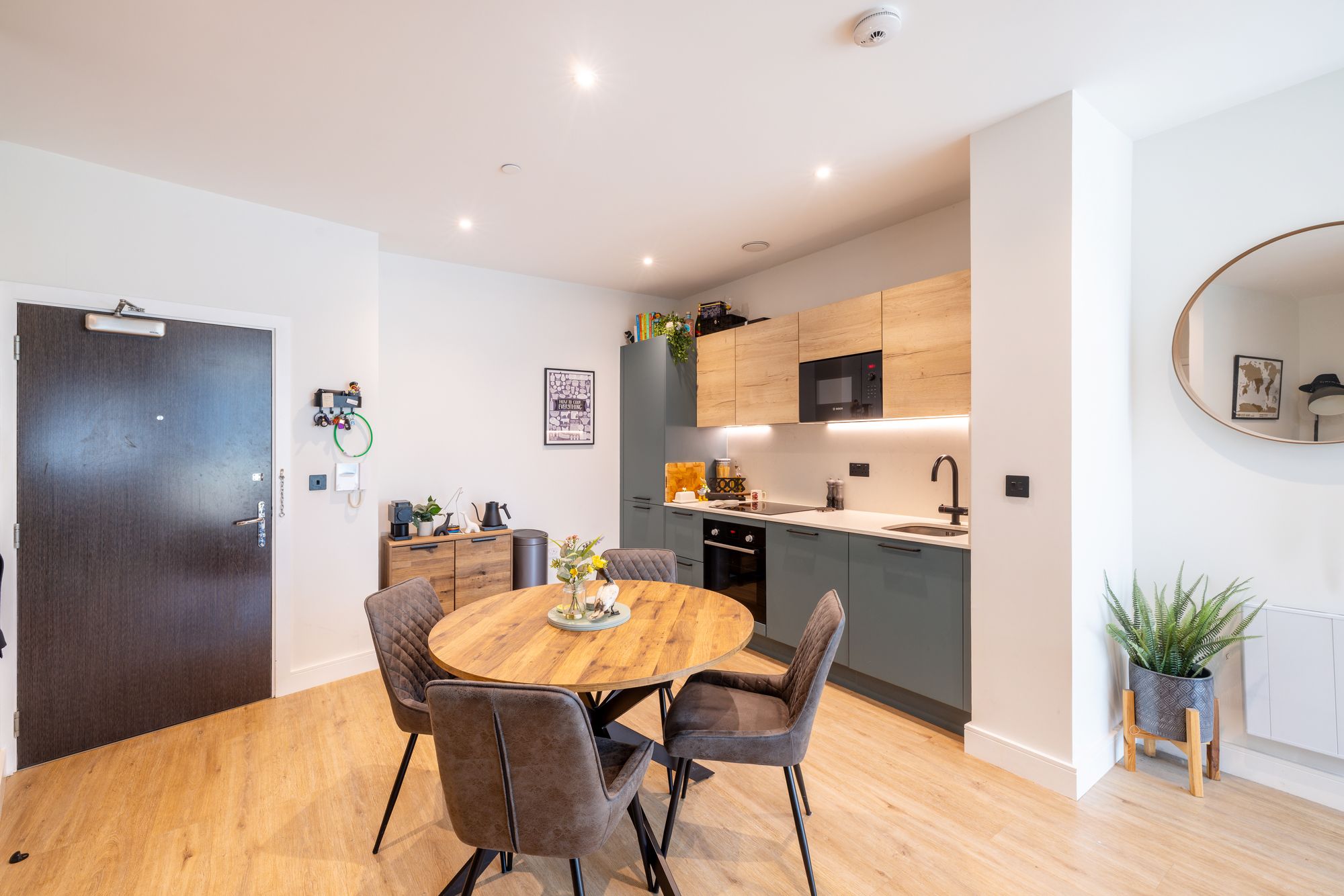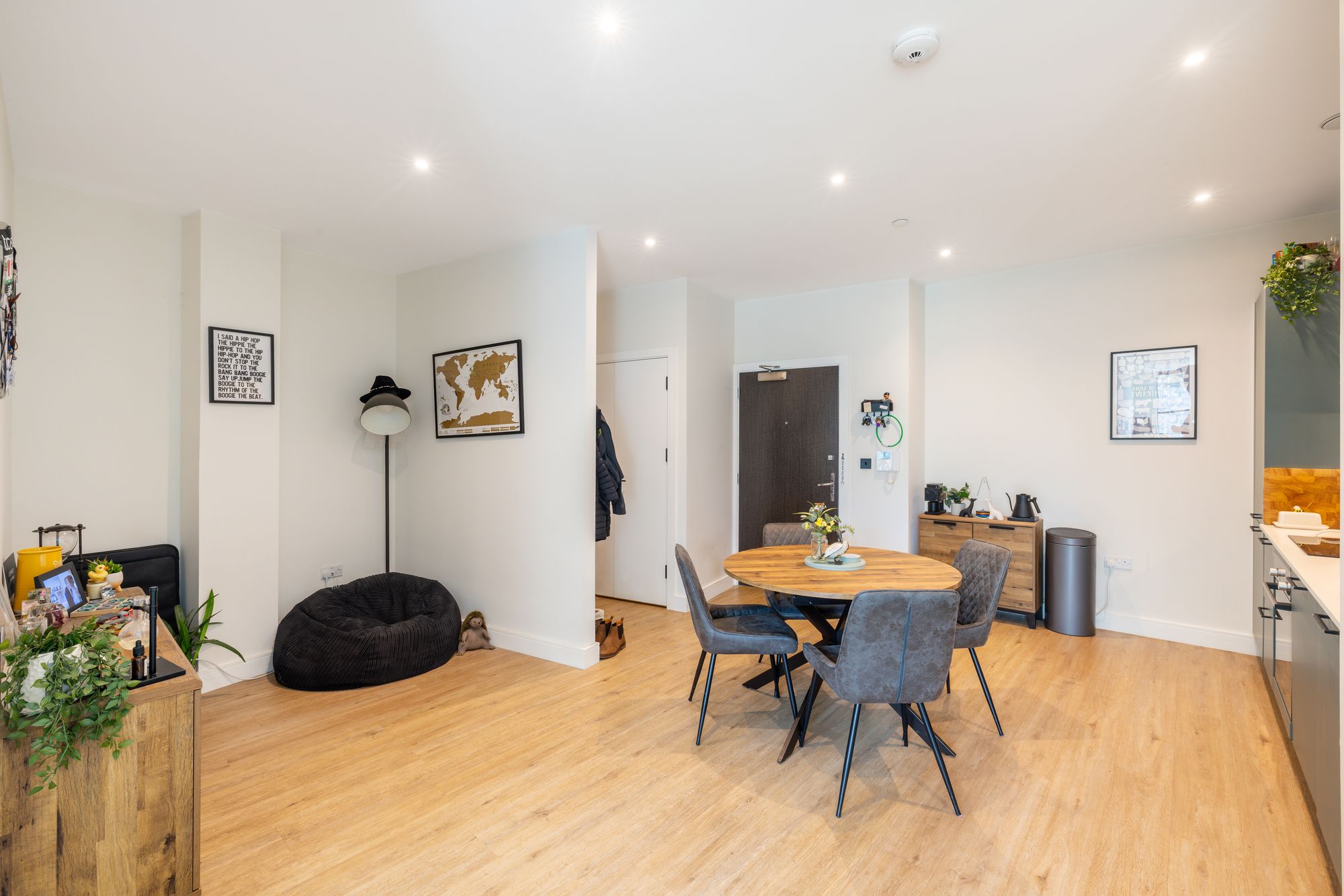 Accessed via lift and benefiting from well-presented communal areas, the property boasts high ceilings and large double-glazed windows, creating a bright and airy atmosphere throughout. The spacious open-plan kitchen, dining, and living area is thoughtfully designed, featuring a stunning modern kitchen with quartz worktops and integrated appliances. The living area is subtly set back, providing a cosy yet versatile space, with additional room ideal for a home office or reading corner.