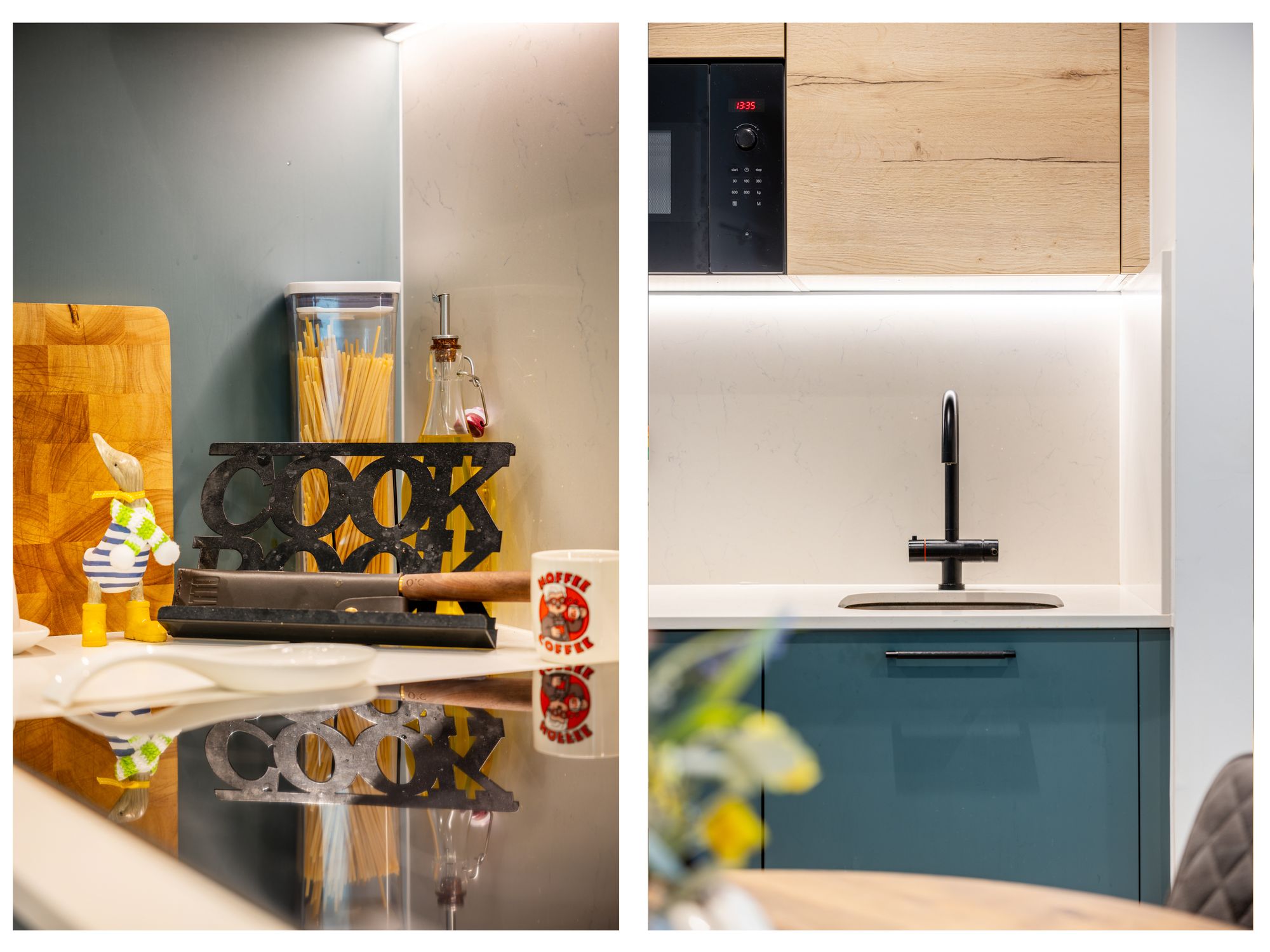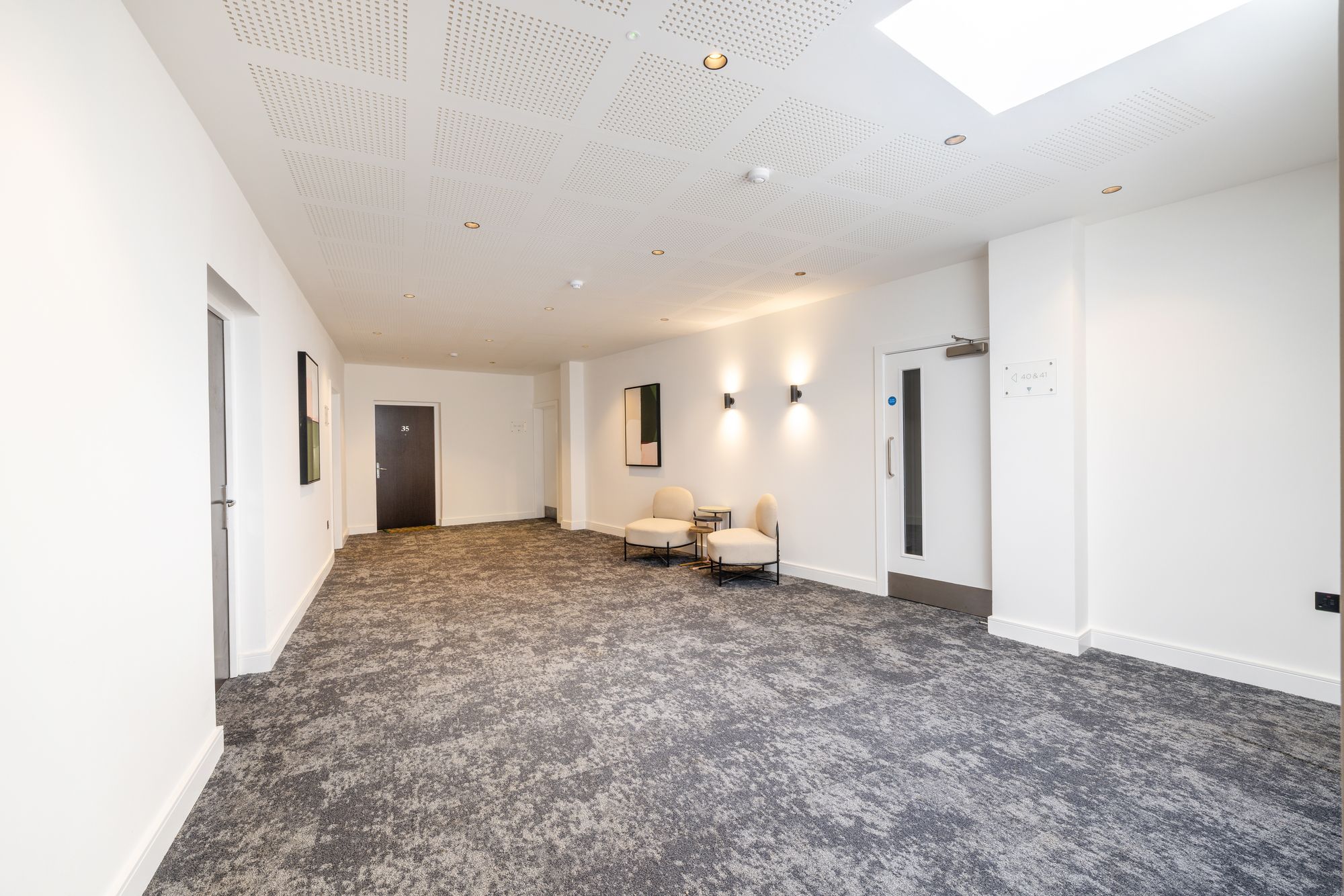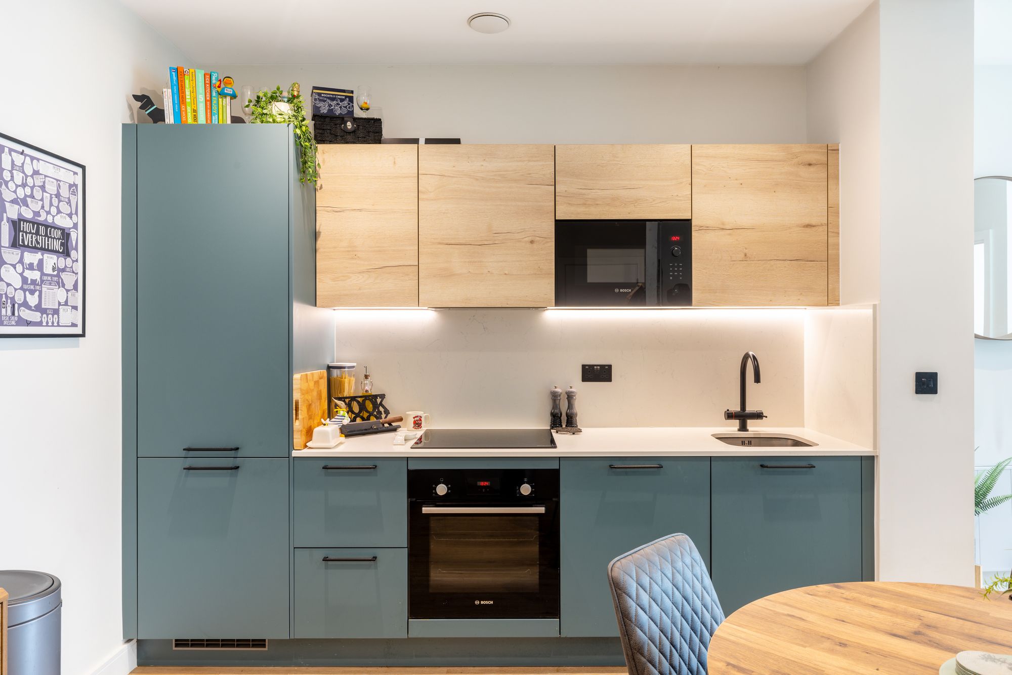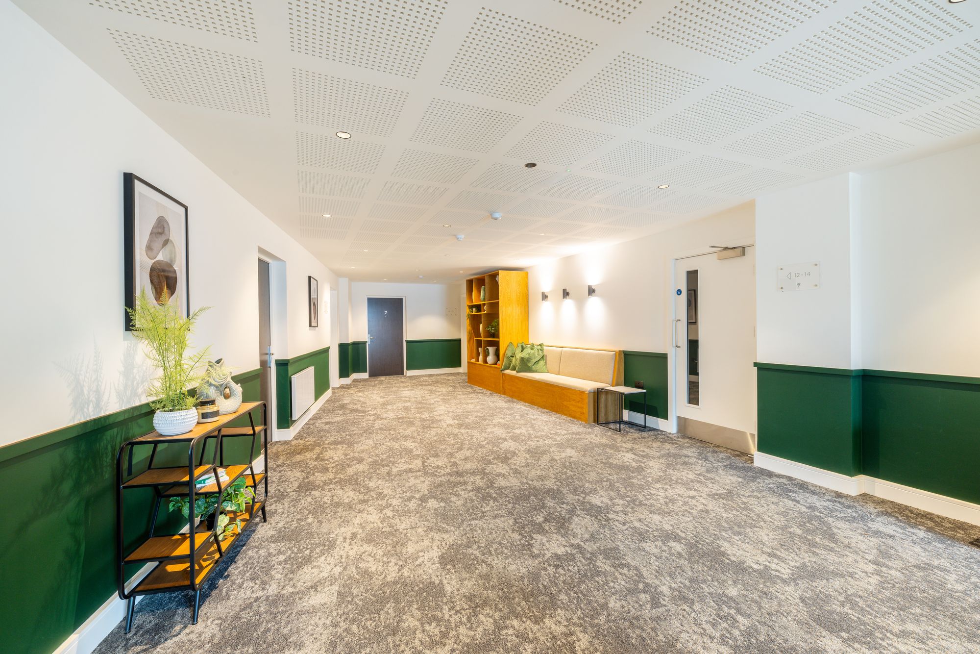 Accessed via lift and benefiting from well-presented communal areas, the property boasts high ceilings and large double-glazed windows, creating a bright and airy atmosphere throughout. The spacious open-plan kitchen, dining, and living area is thoughtfully designed, featuring a stunning modern kitchen with quartz worktops and integrated appliances. The living area is subtly set back, providing a cosy yet versatile space, with additional room ideal for a home office or reading corner.