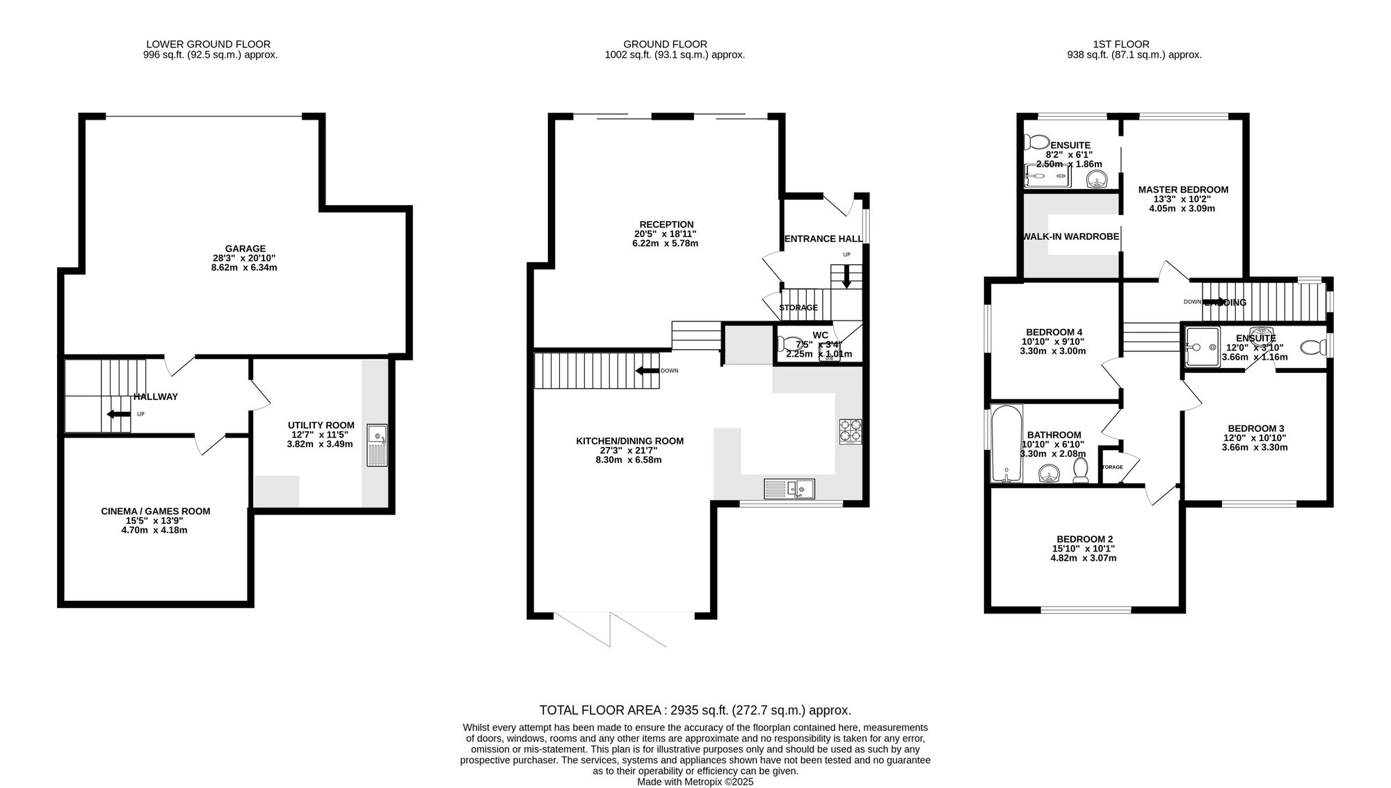 Upstairs, the first floor hosts four well-proportioned double bedrooms, all with radiator heating. The master suite benefits from a luxury en-suite shower room and a walk-in wardrobe, while the second bedroom also enjoys its own stylish en-suite.