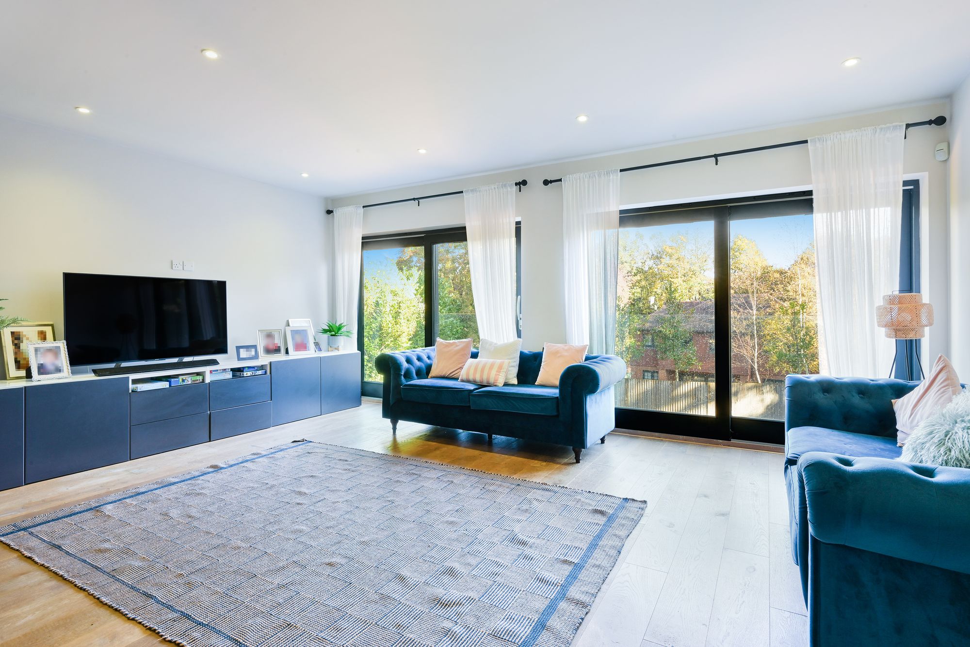 To the front, the bright and spacious living room enjoys superb natural light and features double Juliet balconies, creating an airy and elevated atmosphere.