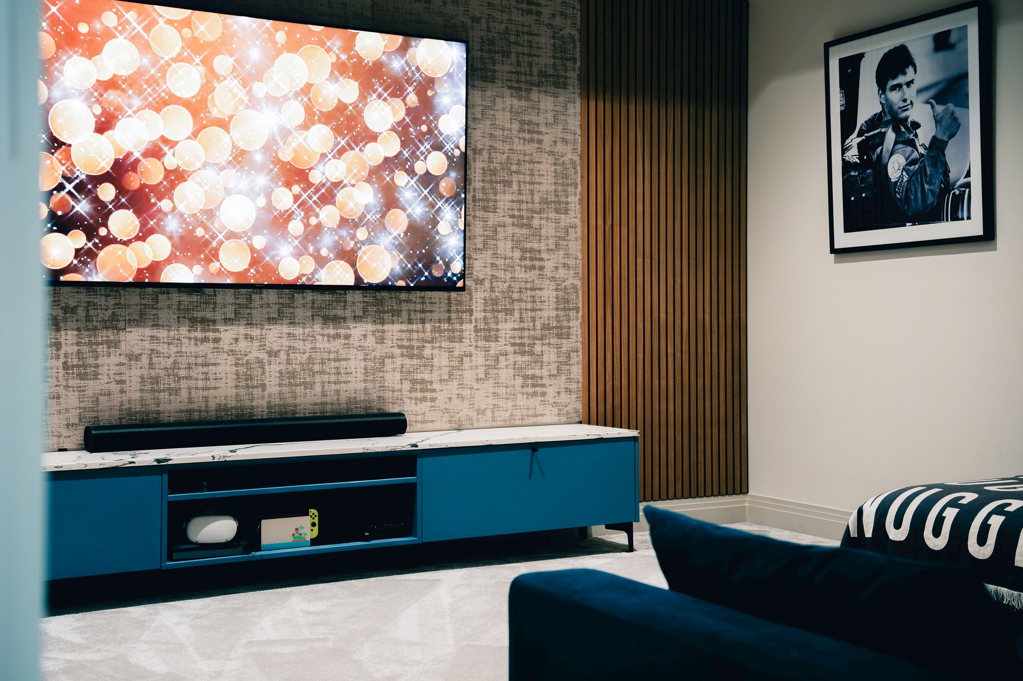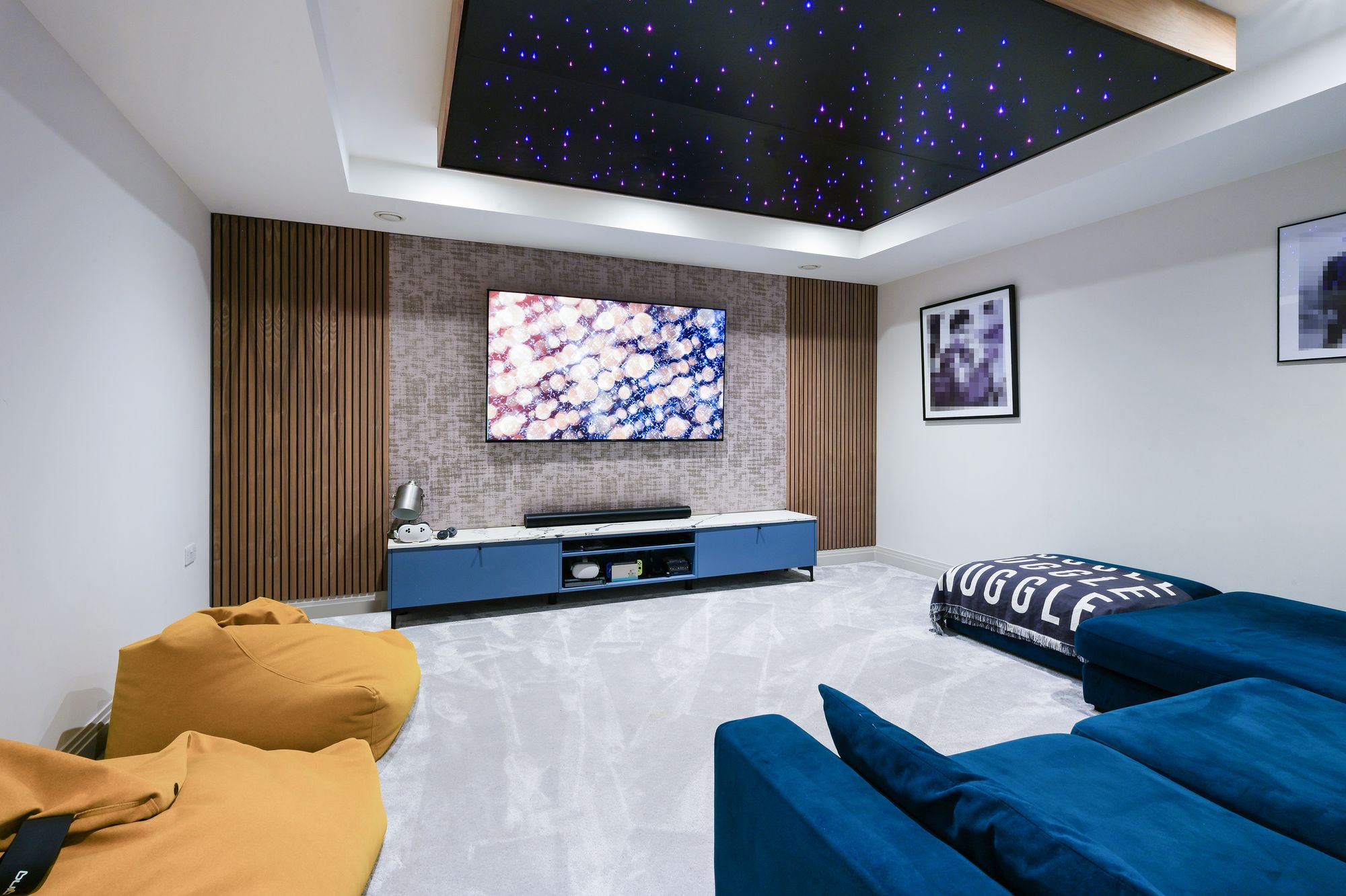 A highlight of this level is the custom home cinema room, complete with a bespoke media wall and ambient lighting, perfect for family movie nights.
