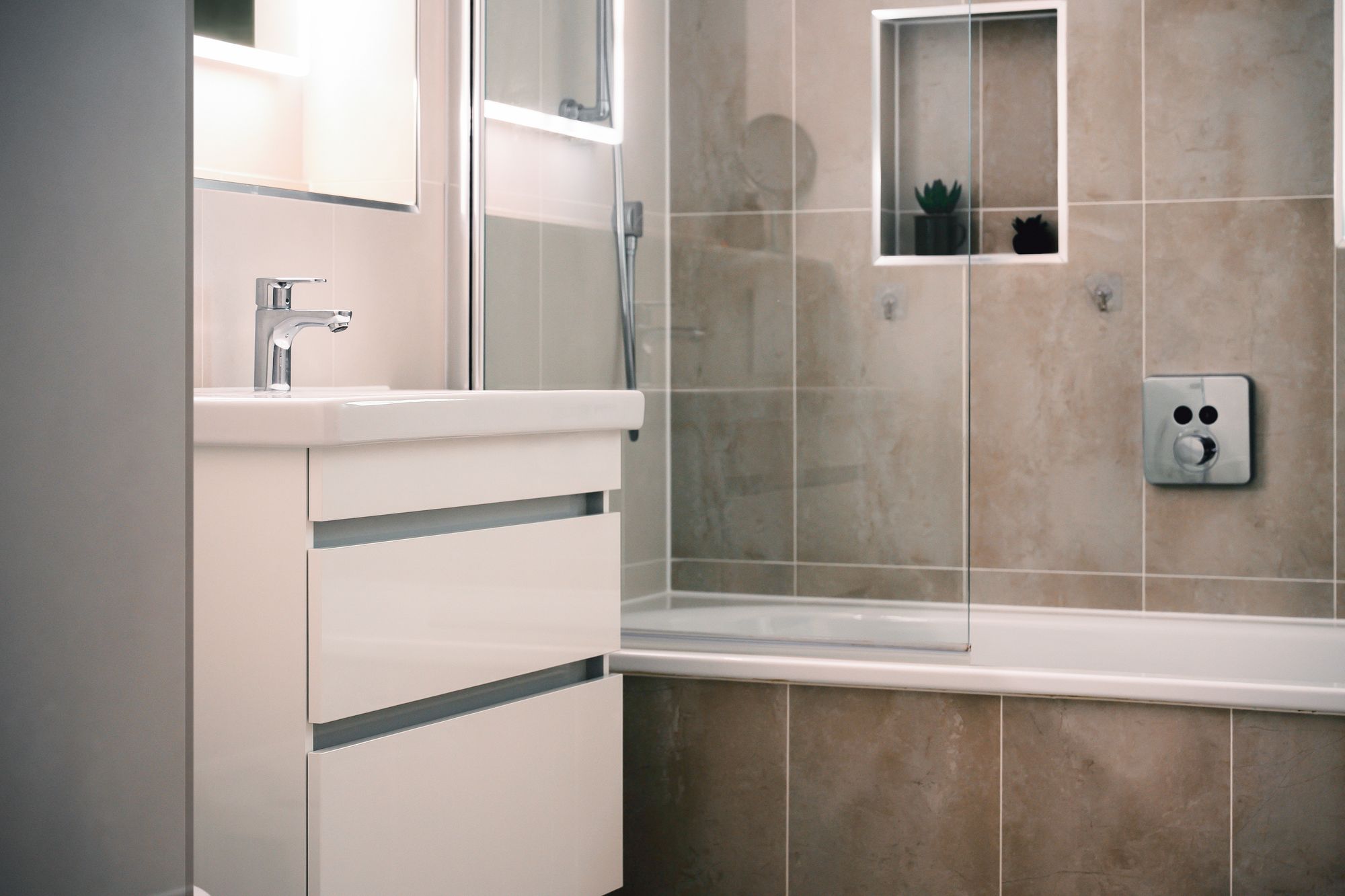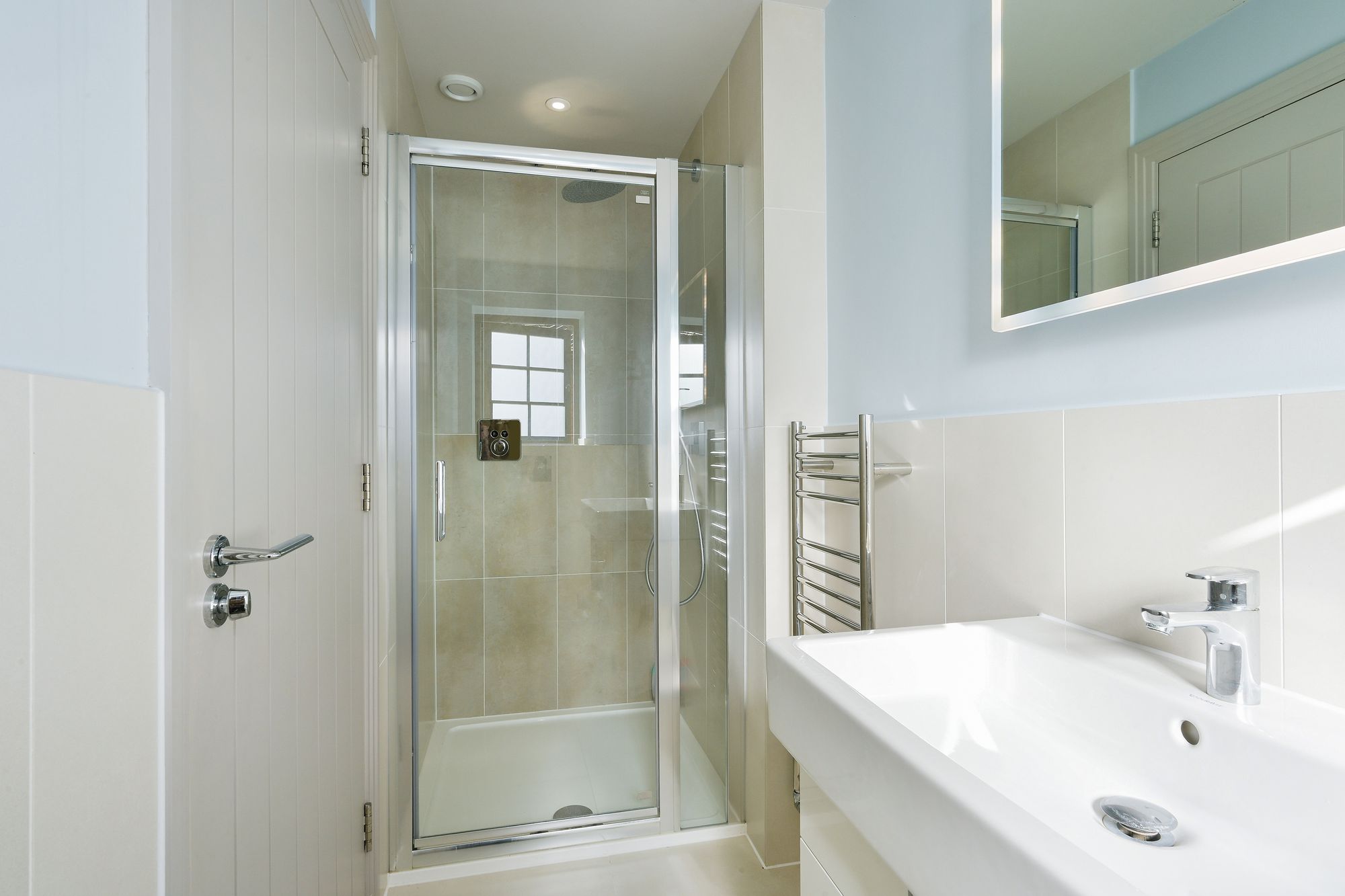 A contemporary family bathroom with elegant tiling and underfloor heating completes this floor, along with a convenient guest w/c off the stairway.