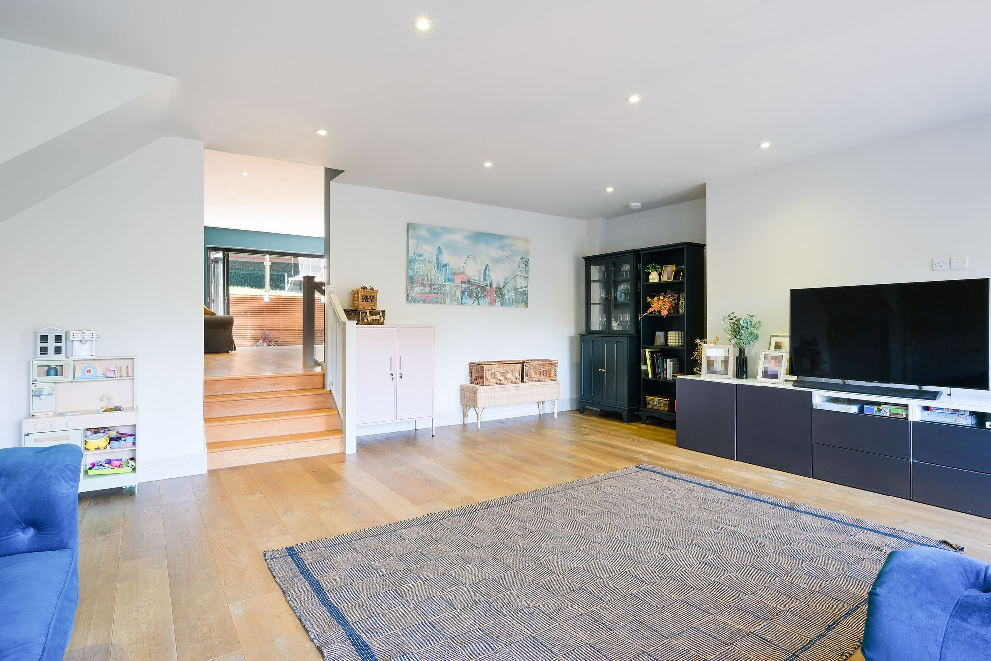 The home is approached via beautiful limestone steps leading to the front door. A welcoming entrance hall with space for coats and shoes introduces the home’s contemporary feel. The mezzanine-style layout and engineered hardwood flooring with underfloor heating set the tone for the quality throughout.