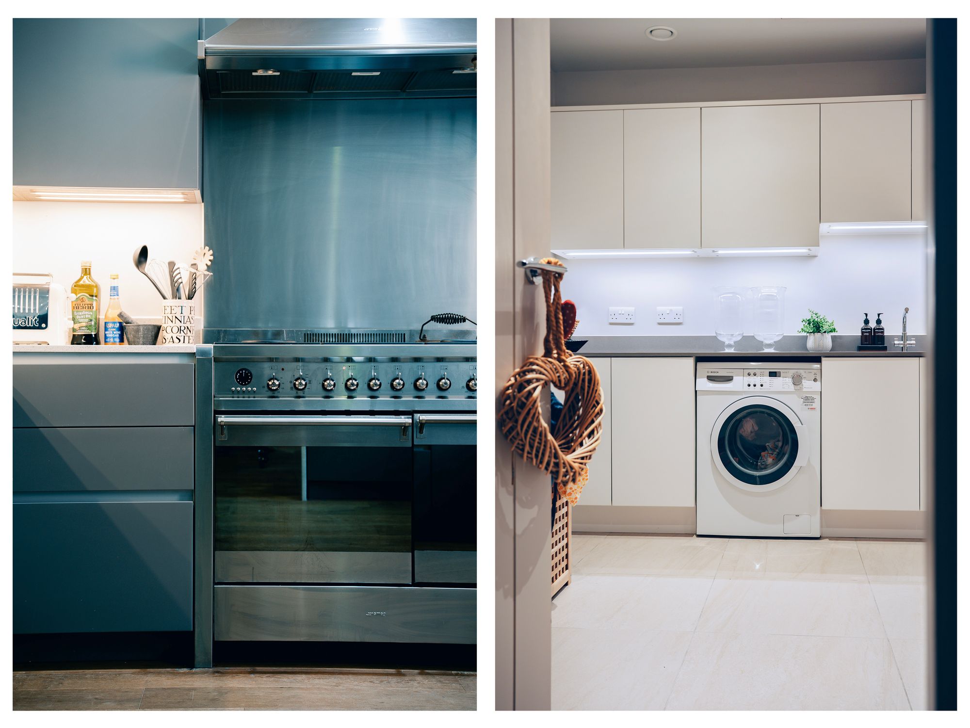 The stairs from the dining space lead to the lower ground floor, which offers excellent versatility. A spacious utility room is fully equipped with a sink, washer, dryer, and generous storage, all finished with tiled flooring and underfloor heating.