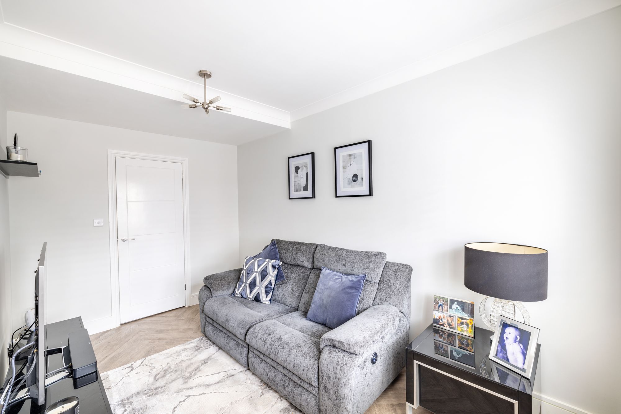 Inside, the property continues to delight with a welcoming entrance hall and striking herringbone LVT flooring that flows seamlessly throughout the downstairs living space, adding both sophistication and practicality. The generous living room is the only room on the ground floor with premium quality fitted carpet. The room is bathed in natural light from the characterful bay window, creating the perfect space for relaxed evenings and family time.