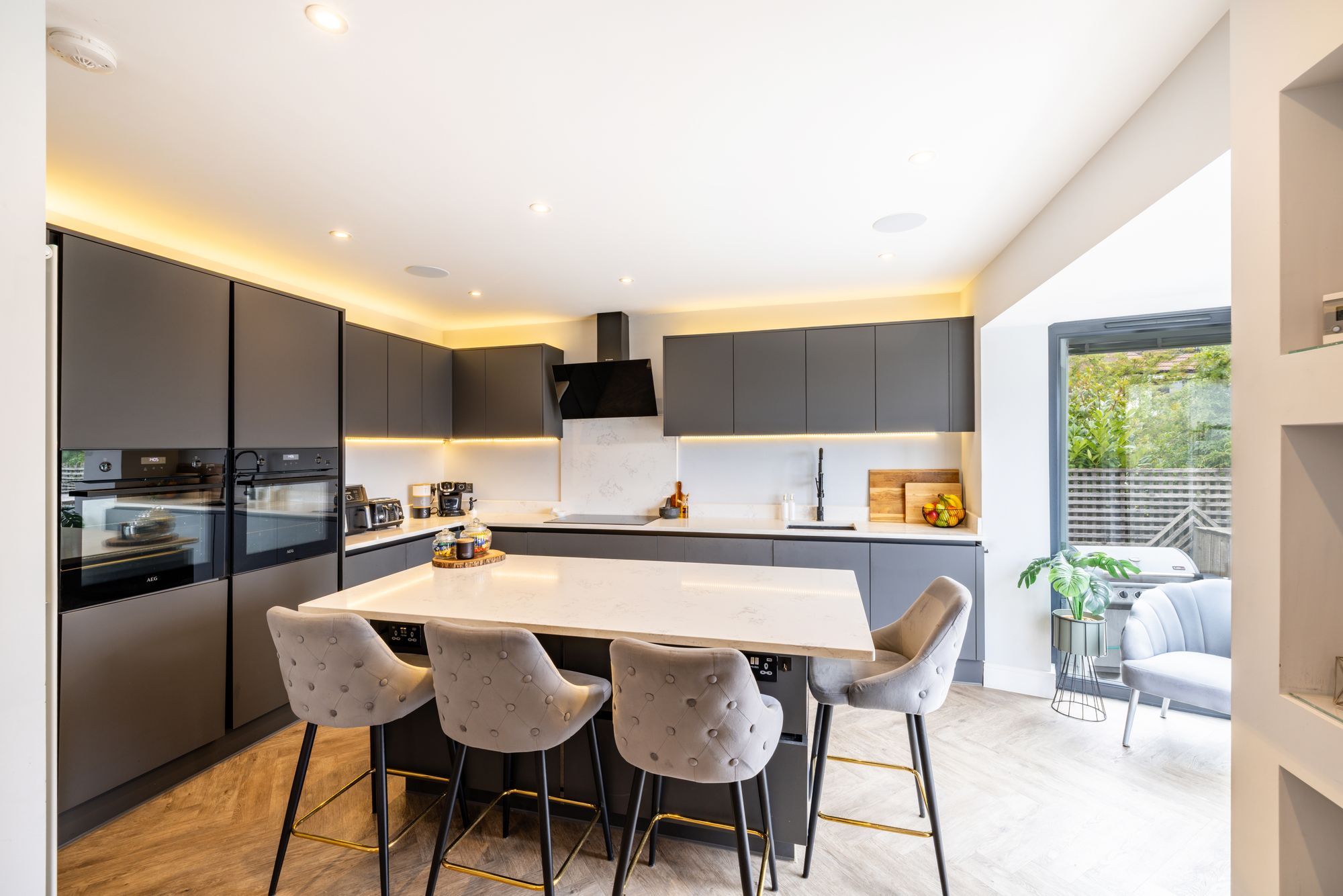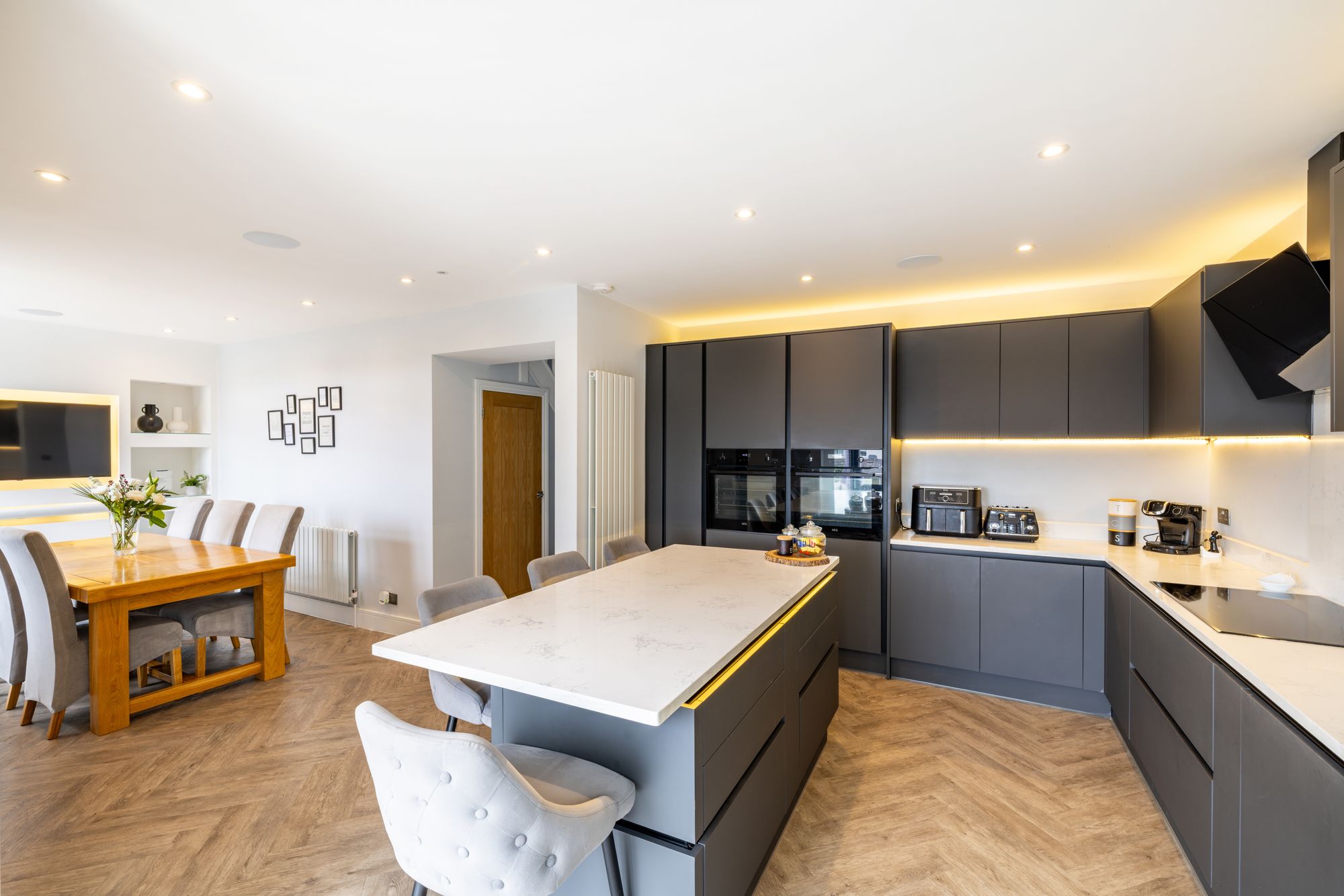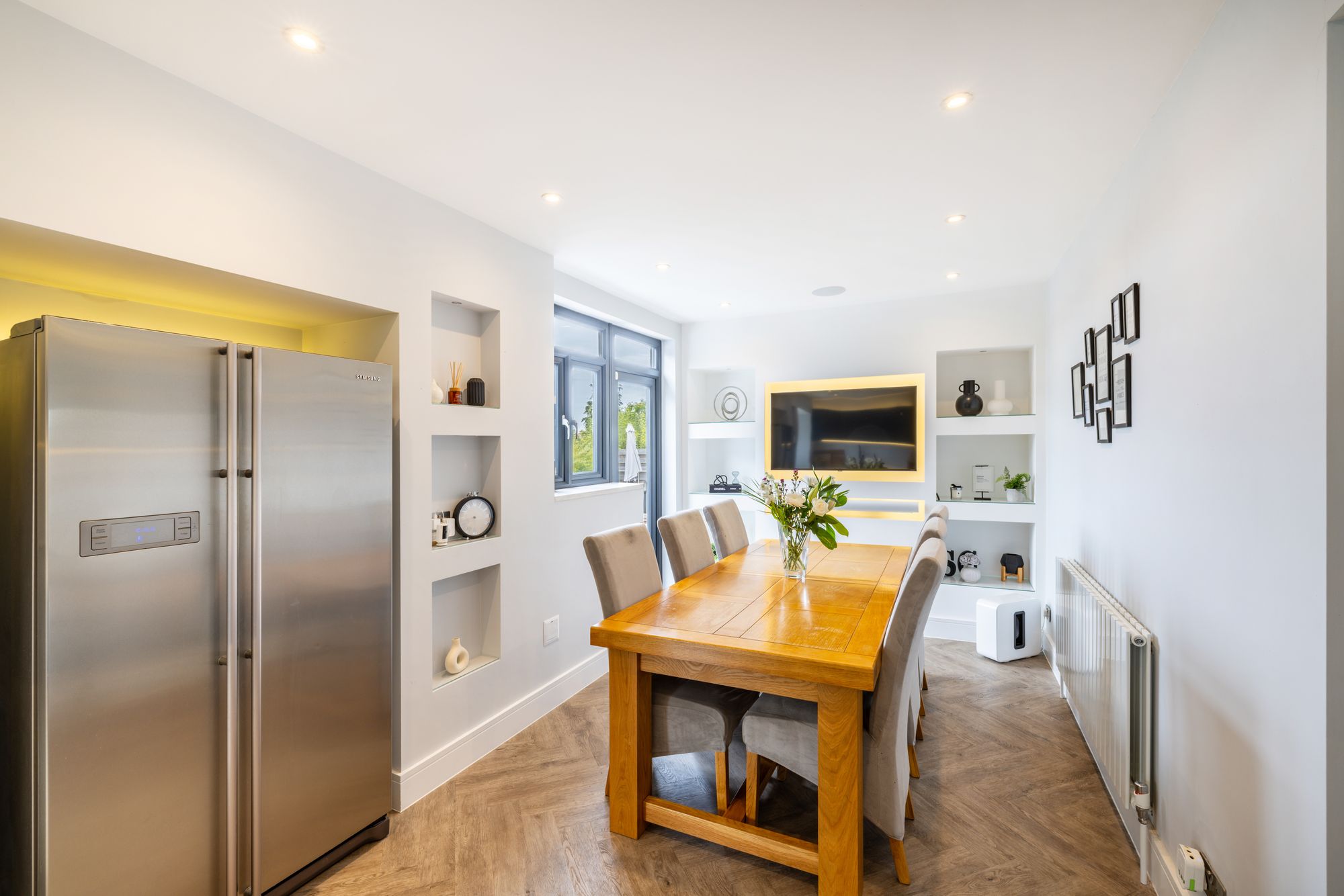 The heart of the home is undoubtedly the stunning open-plan kitchen and dining area which spans the entire width of the back of the house. This space has been meticulously reconfigured and designed with both style and functionality in mind. At its centre is a large kitchen island with breakfast bar seating, perfect for casual family meals, morning coffee, or socialising while cooking. The layout creates a natural flow for entertaining, with plenty of workspace and storage, complemented by high-quality finishes and fittings throughout and features a bespoke media wall.