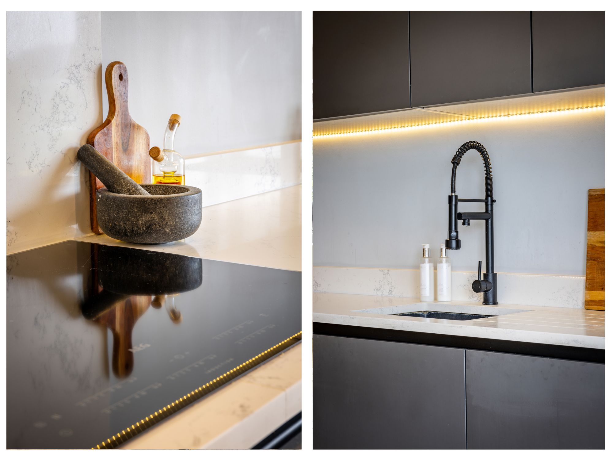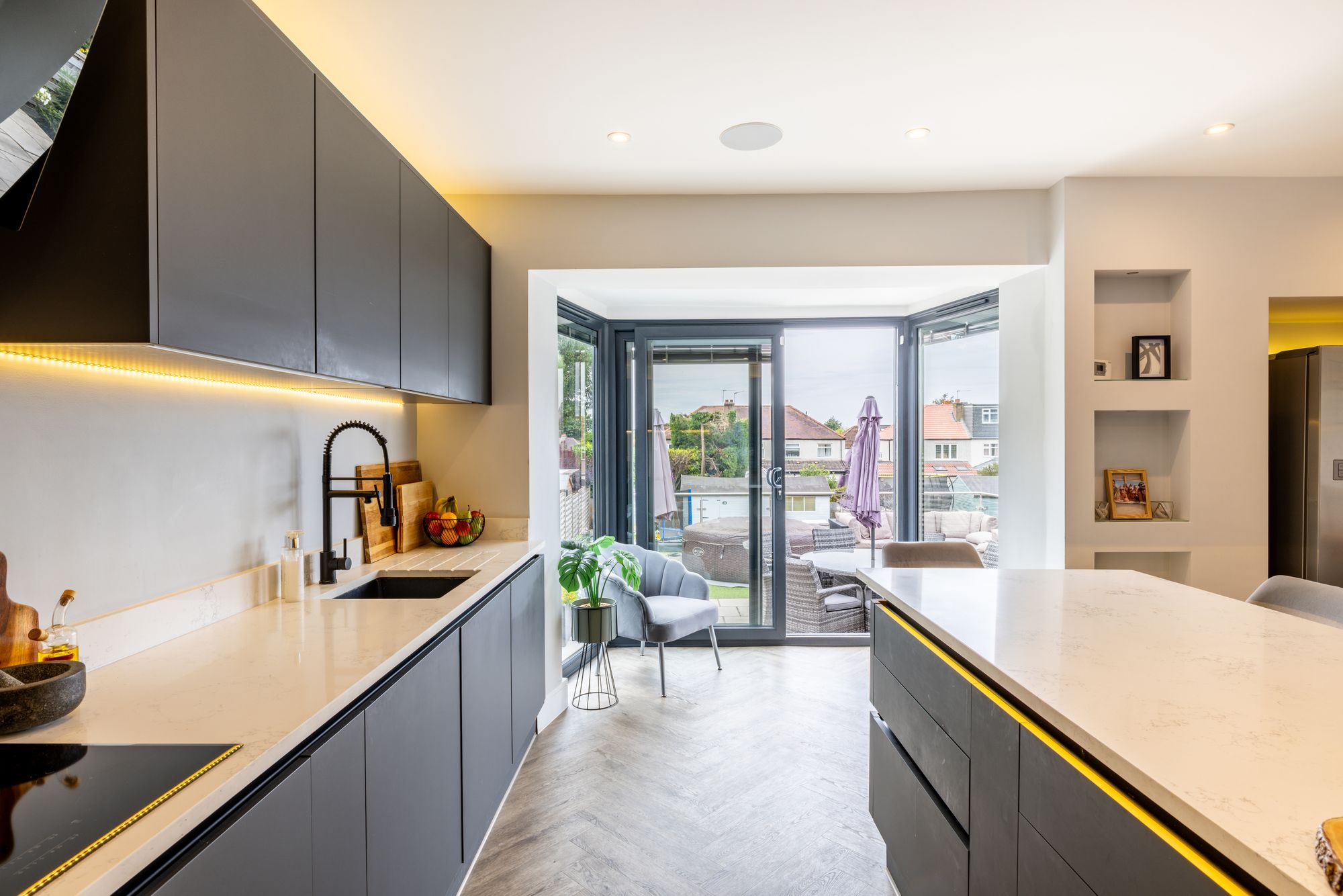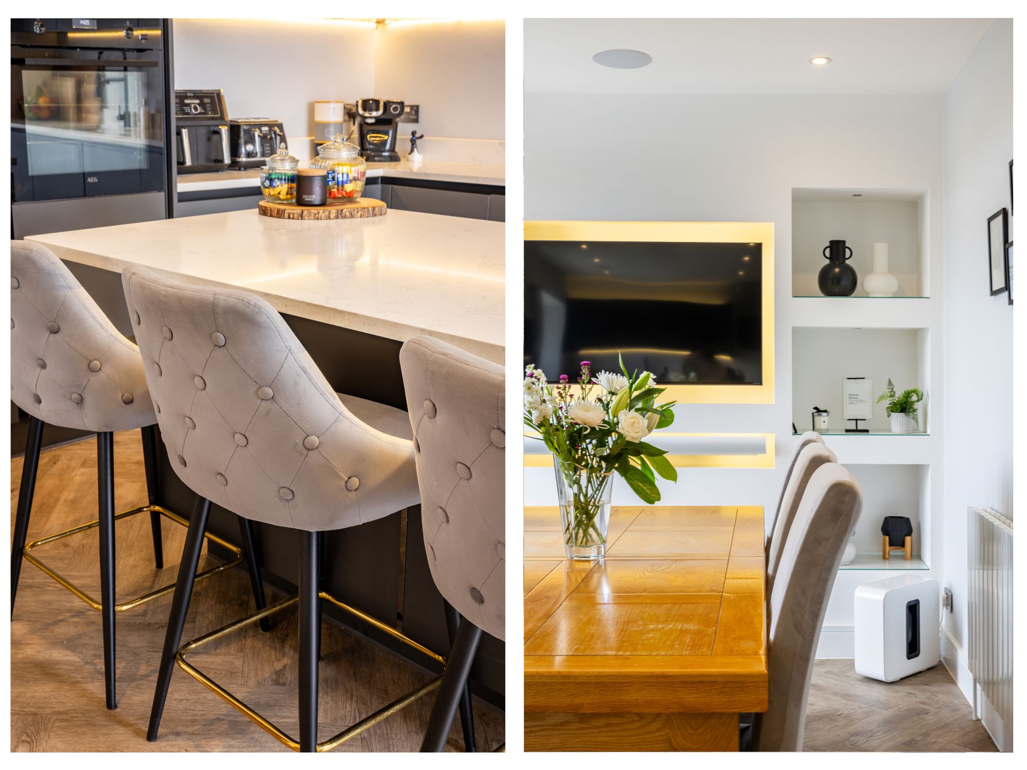 The heart of the home is undoubtedly the stunning open-plan kitchen and dining area which spans the entire width of the back of the house. This space has been meticulously reconfigured and designed with both style and functionality in mind. At its centre is a large kitchen island with breakfast bar seating, perfect for casual family meals, morning coffee, or socialising while cooking. The layout creates a natural flow for entertaining, with plenty of workspace and storage, complemented by high-quality finishes and fittings throughout and features a bespoke media wall.