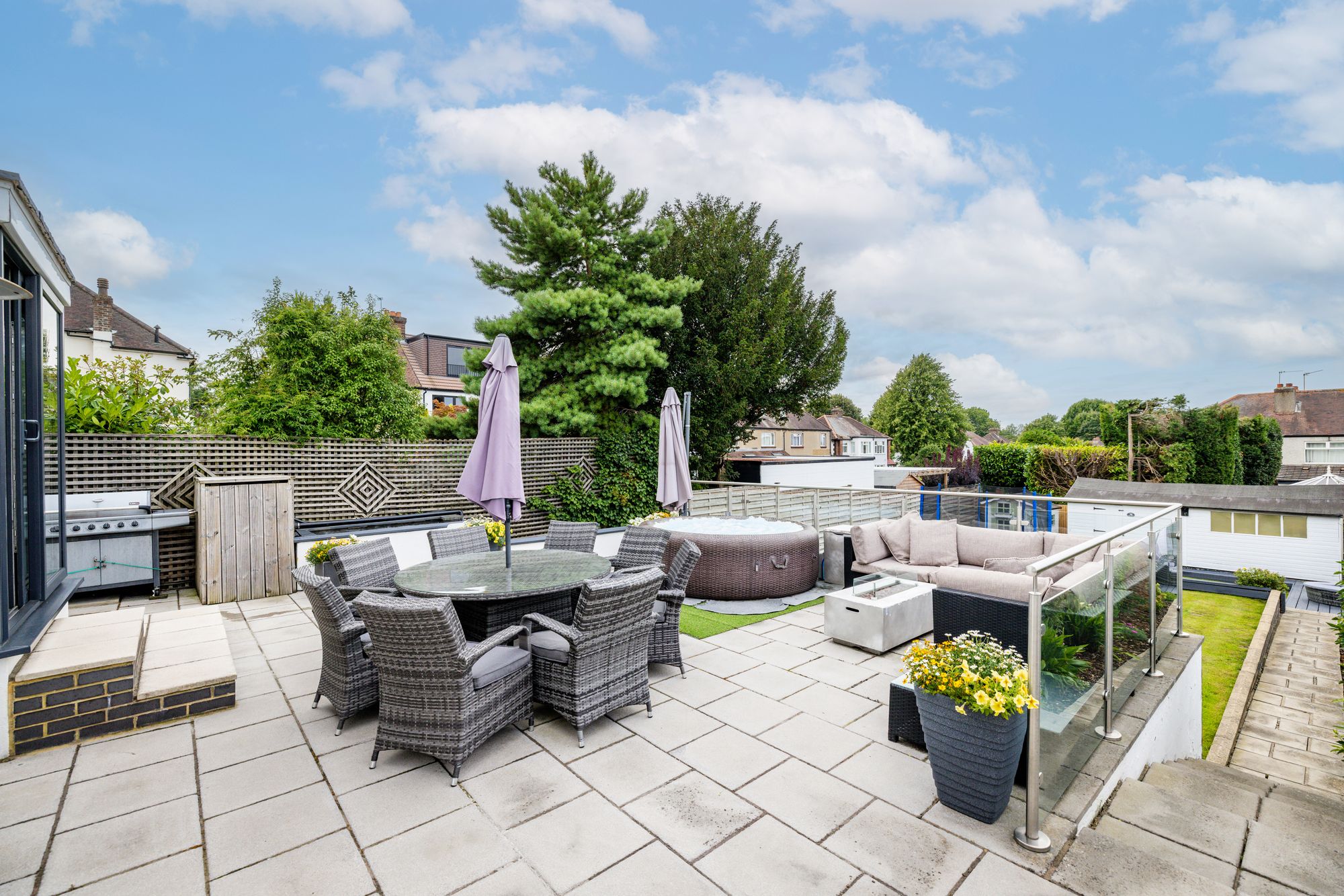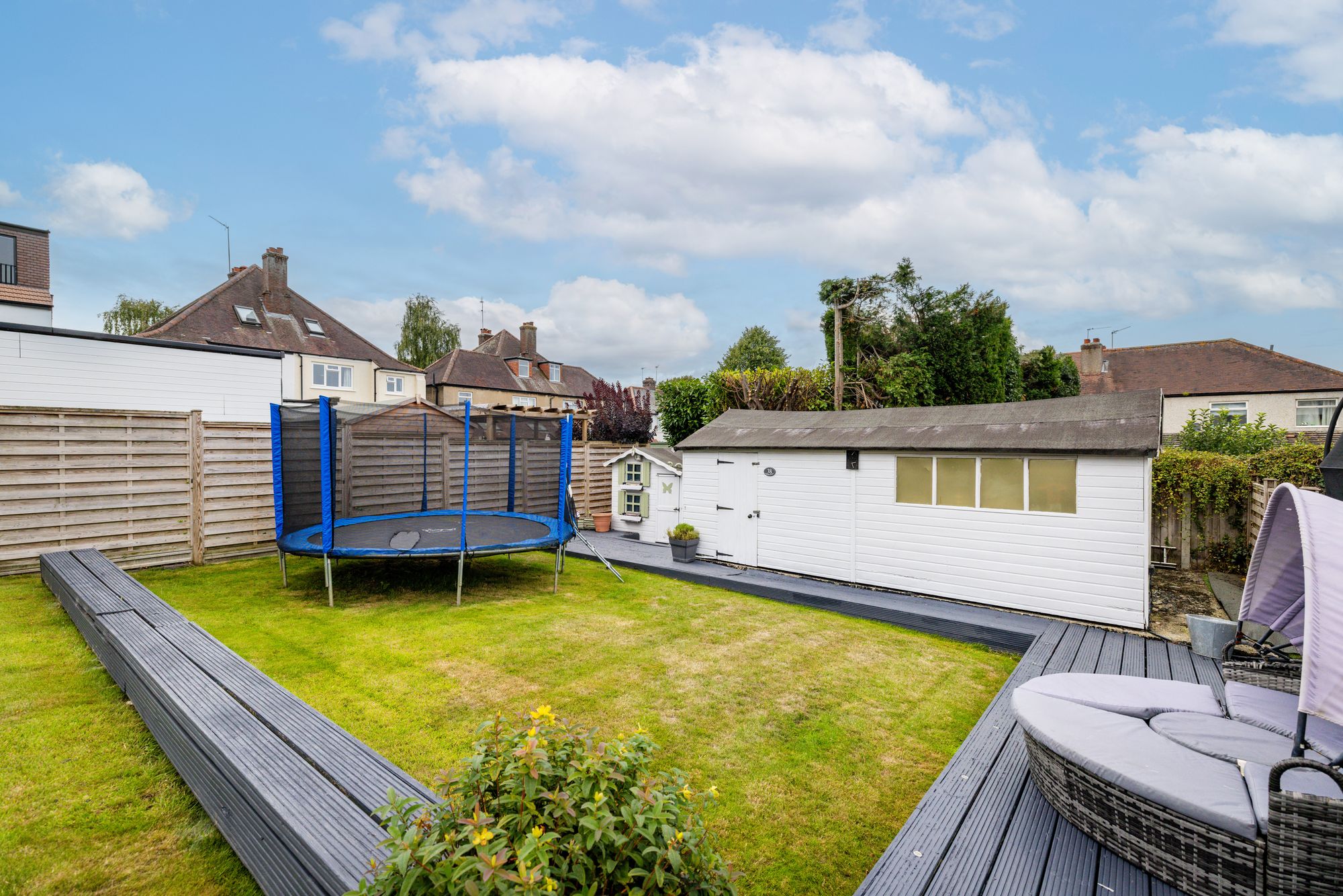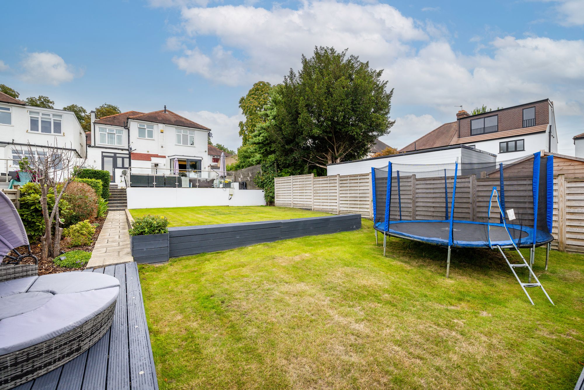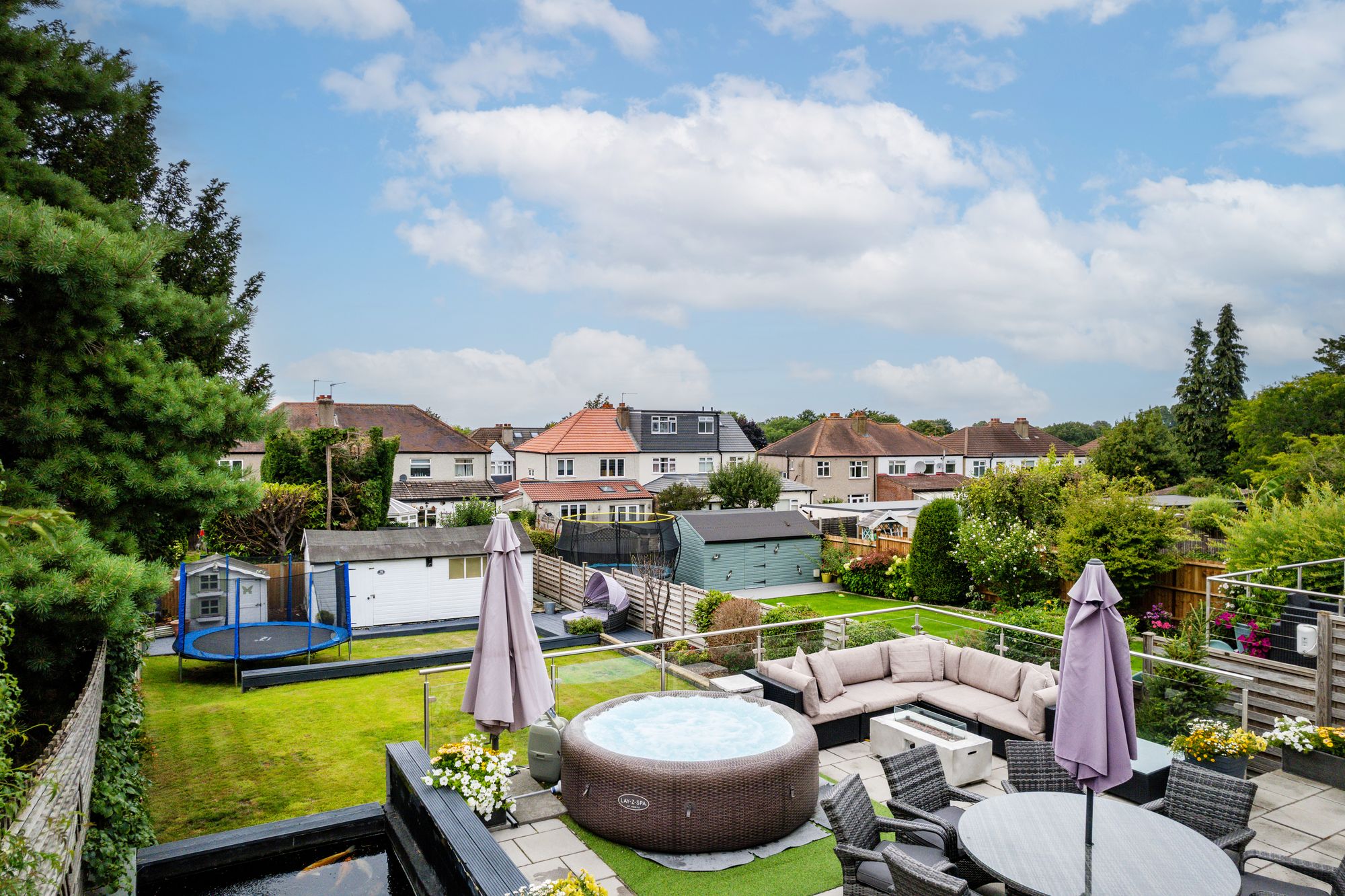 Outside, the garden is a true standout feature. Arranged over multiple levels, it offers a perfect blend of practicality and tranquillity. A spacious raised terrace provides an impressive setting for family dining or evening gatherings, while steps lead down to a beautifully maintained lawn surrounded by mature planting. At the lower level, a peaceful koi carp pond with a cascading waterfall creates a serene retreat. An additional feature includes a large outbuilding with lighting and power, ideal as a gym, or creative studio.