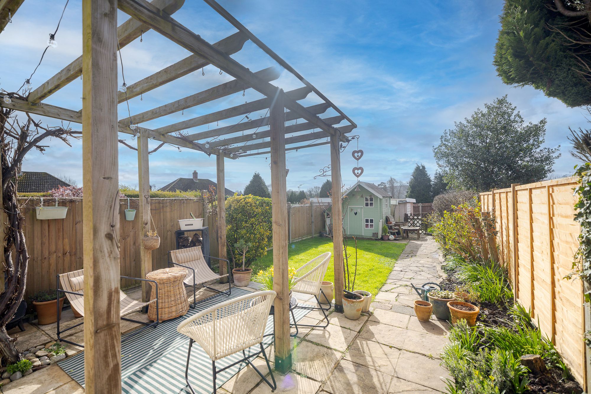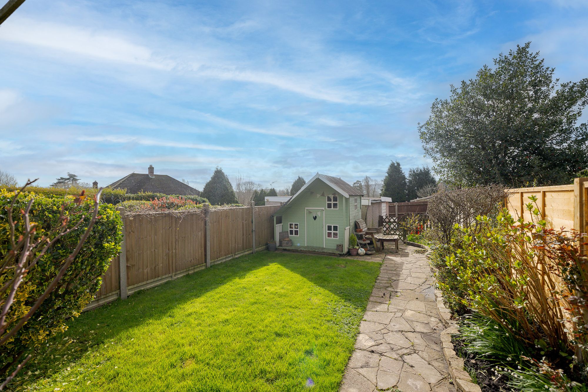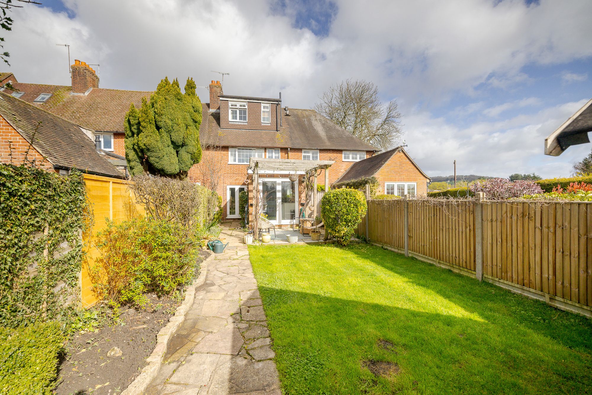 Three bedroom terraced house extending to 1,045 sq ft with south facing garden and detached garage in Godstone village