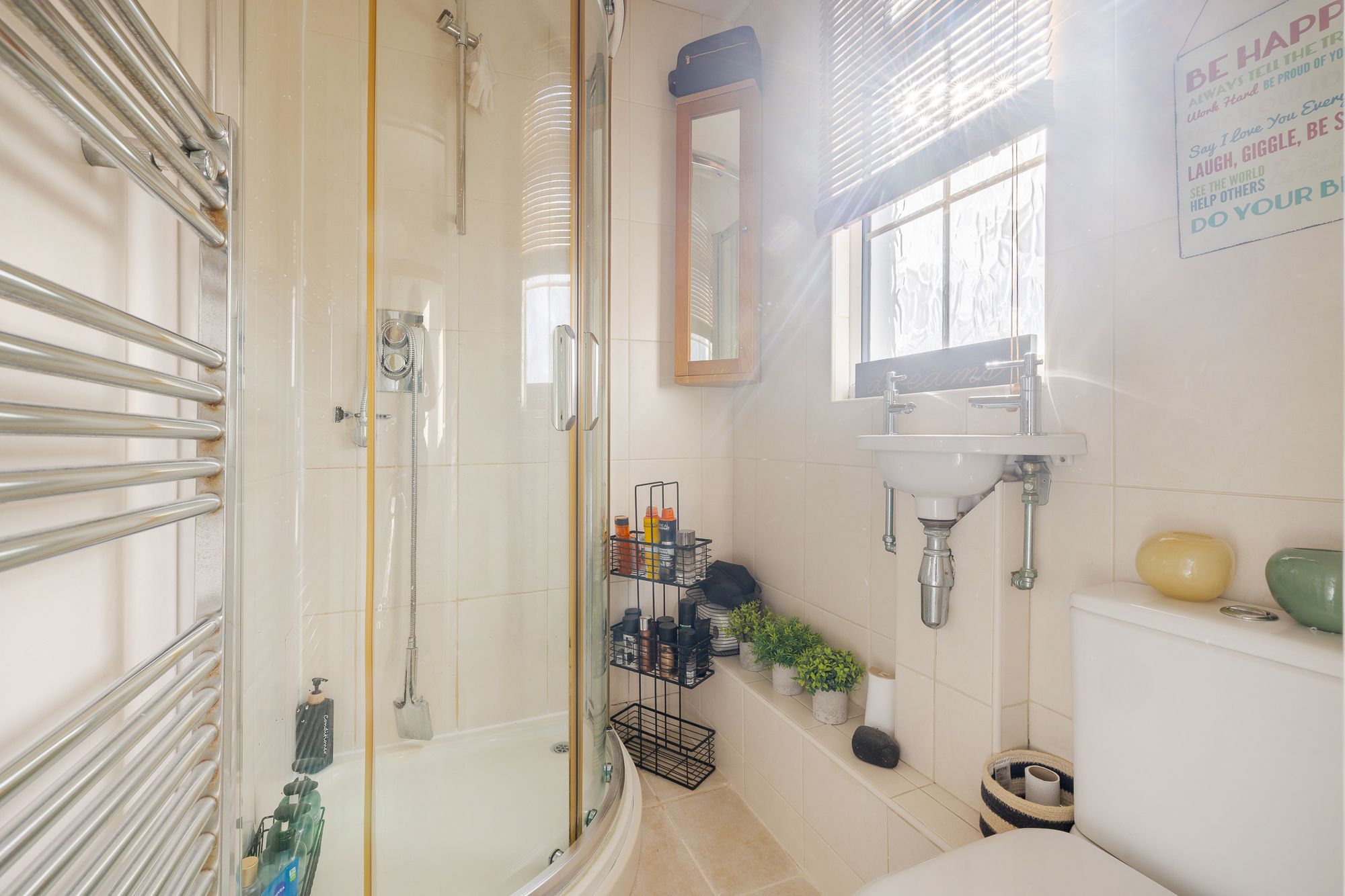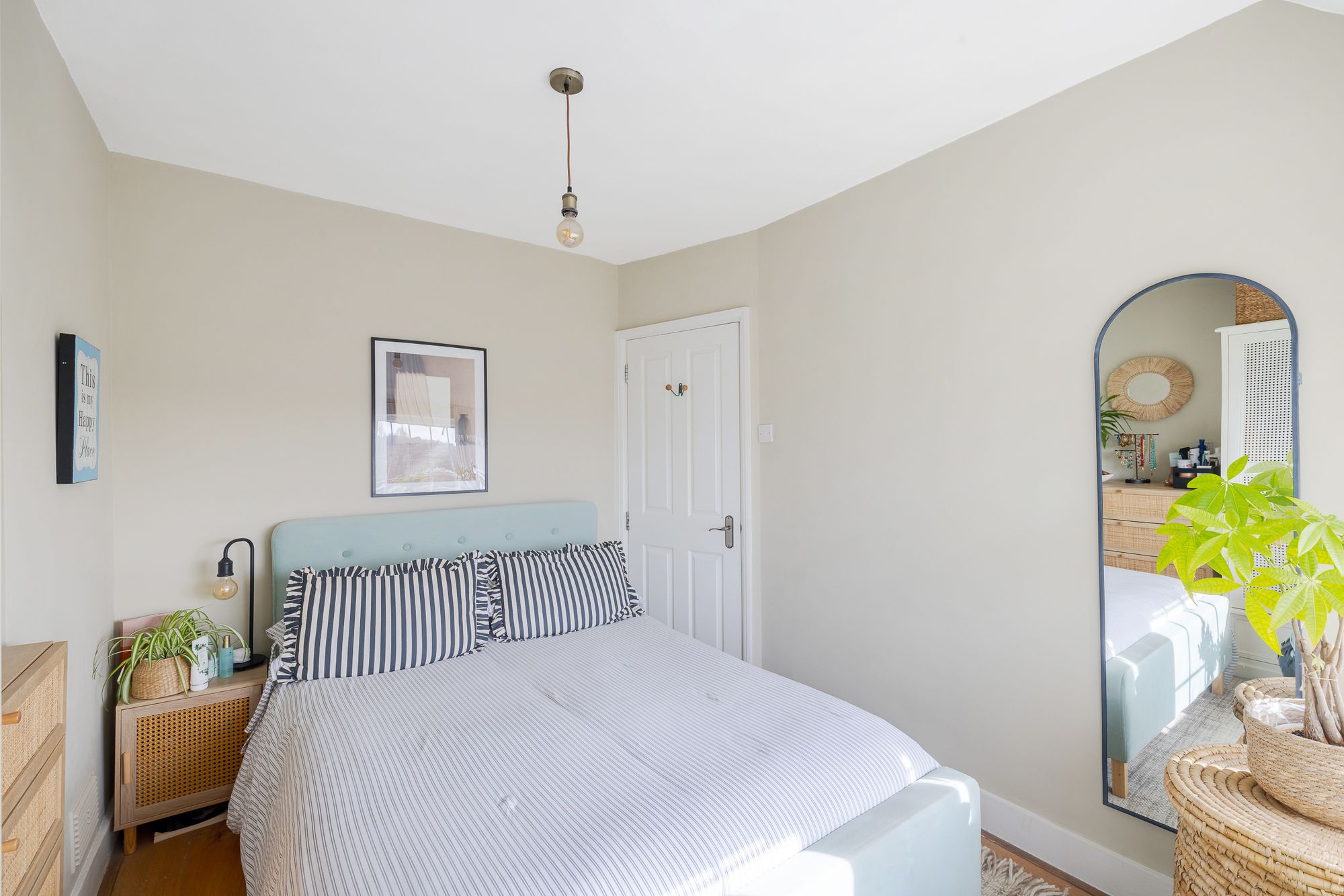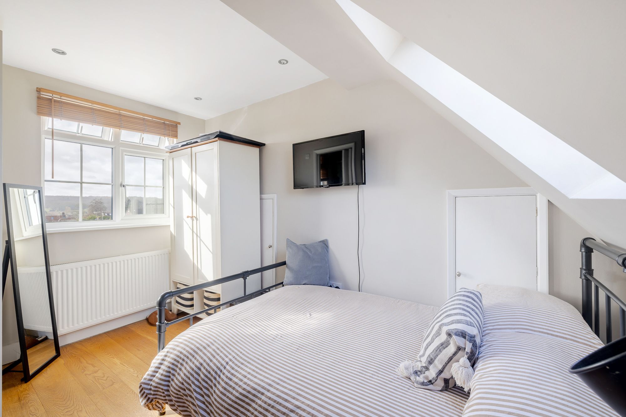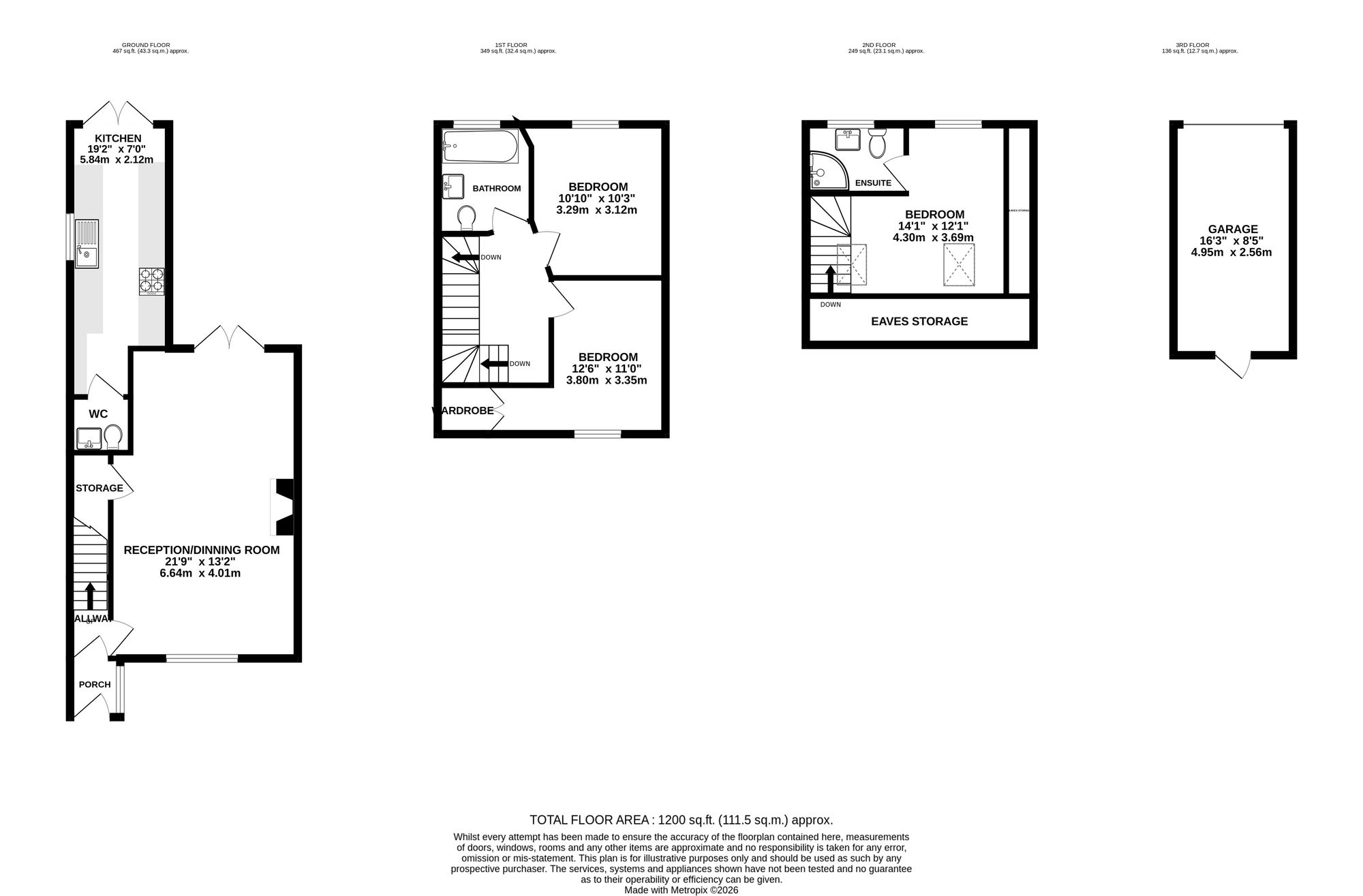 The property is entered via a front porch leading into the reception and dining room which spans the depth of the house and provides clearly defined living and dining areas. French doors open directly onto the rear garden creating natural light and connection to the outside space. The extended kitchen sits to the rear of the property and also provides access to the garden. A cloakroom and understairs storage complete the ground floor. The first floor provides two bedrooms arranged around a central landing together with a family bathroom and additional storage. The second floor forms a principal bedroom suite with en suite shower room and eaves storage, creating separation from the remaining accommodation.