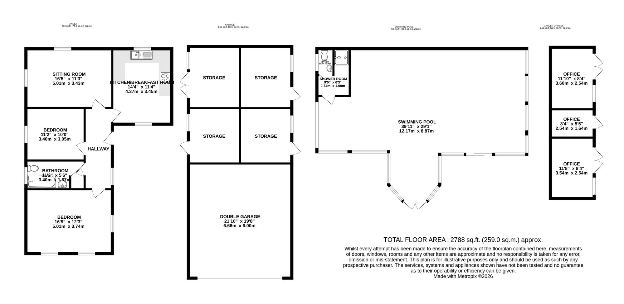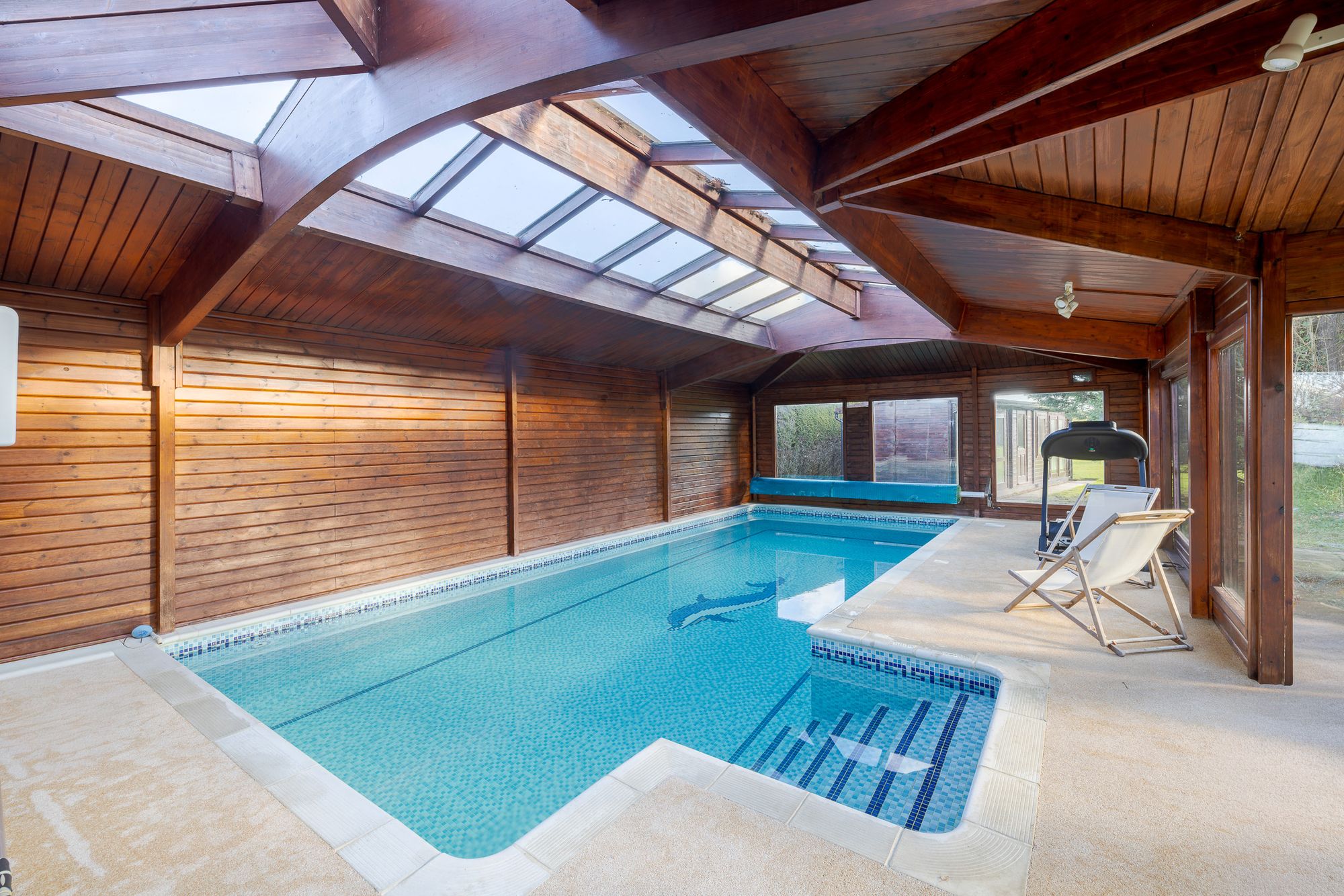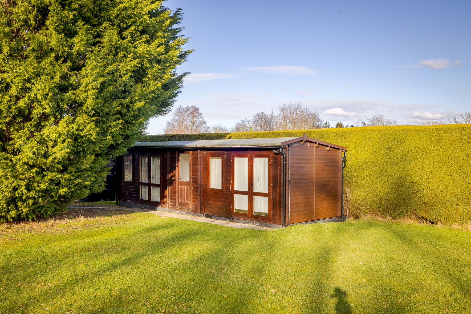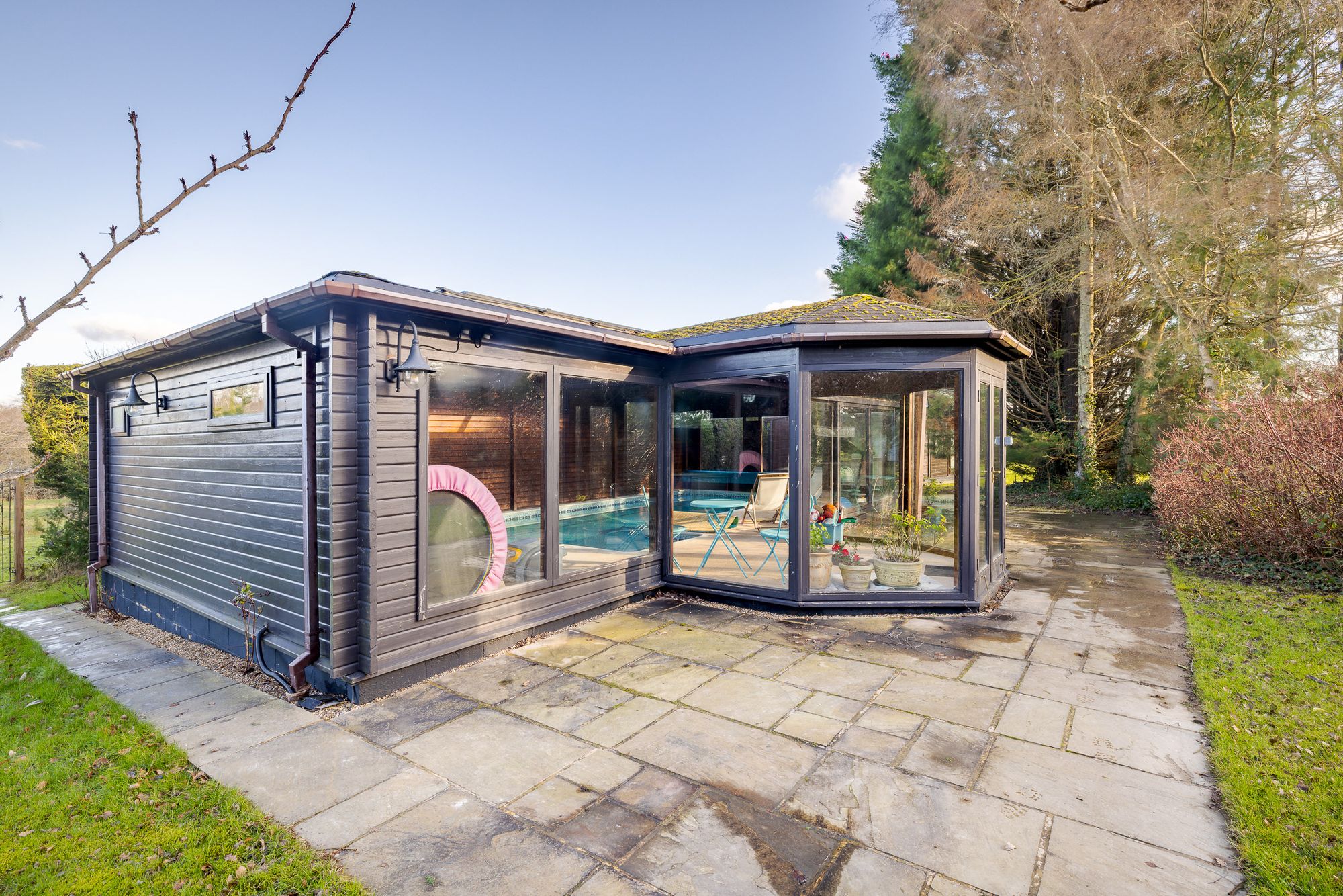 Externally, the property extends its versatility through beautifully landscaped gardens, including an orchard and expansive rear grounds, all meticulously maintained to provide a tranquil and private environment. A sunroom opens directly onto a spacious patio, ideal for al fresco dining and entertaining. The dedicated swimming pool room, with its heated pool and adjacent shower room, offers year-round leisure facilities, while an exterior cabin houses three fully equipped offices, presenting an ideal solution for those wishing to work from home or operate a business within the comfort of their own property.