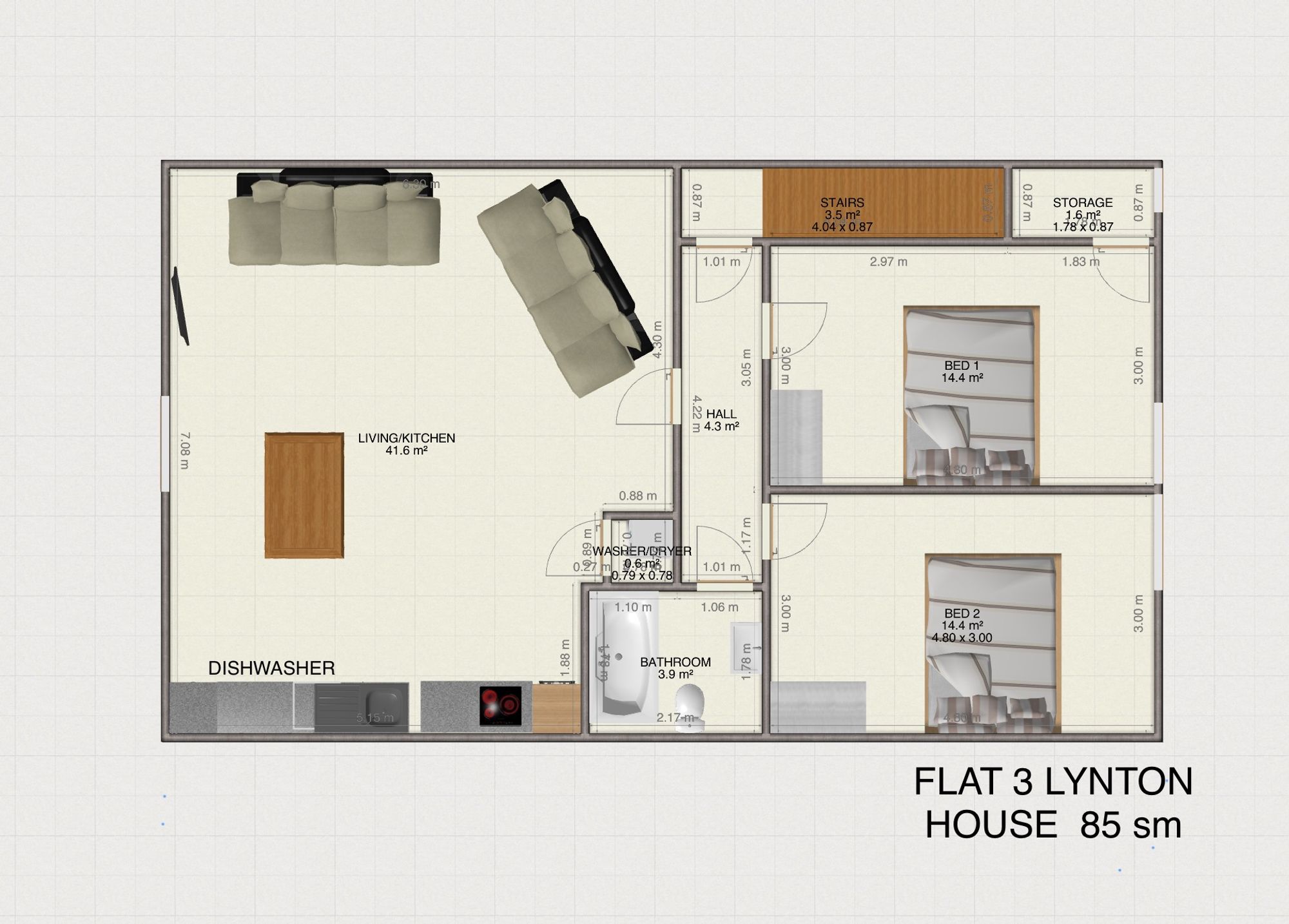 Dimensions: 13′ 04″ x 8′ 05″ (4.06m x 2.57m).
