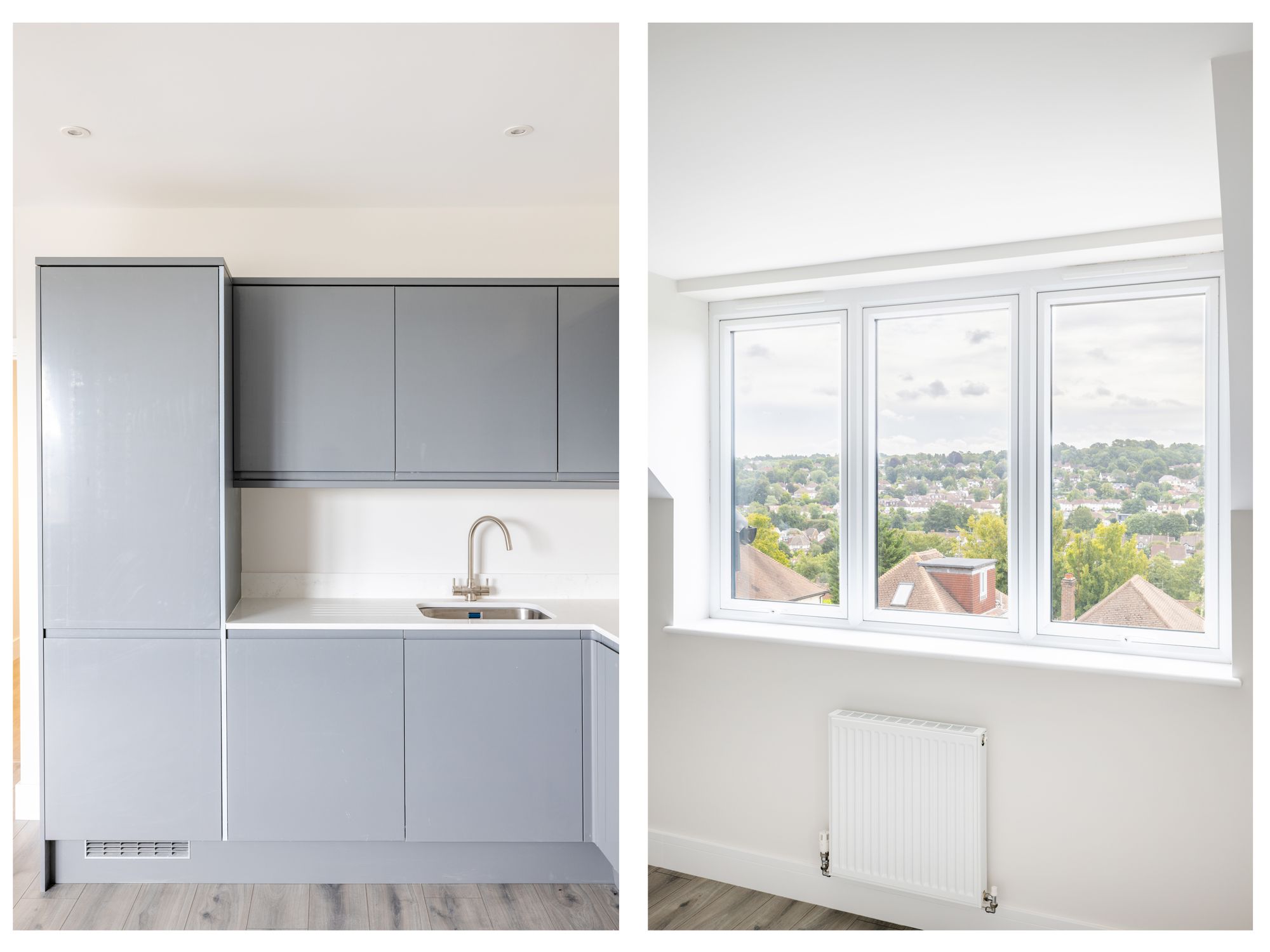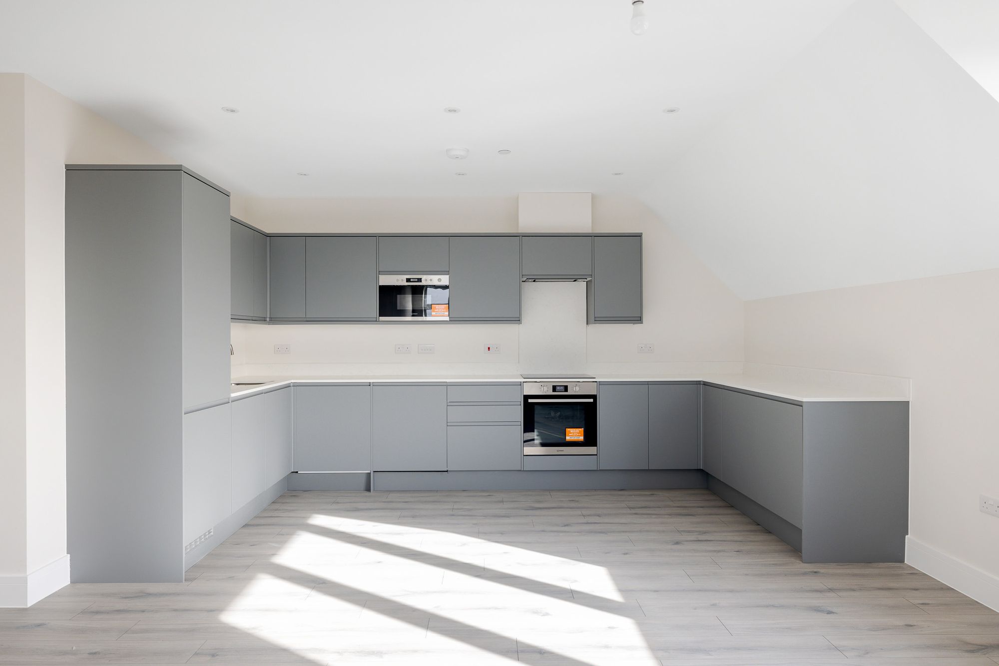 Step inside to a bright and airy open-plan living area that flows naturally into a sleek, modern kitchen. With quartz worktops, elegant cabinetry, and hardwearing porcelain tiled floors, the kitchen is both stylish and practical, ideal for everything from quiet breakfasts to evening entertaining.