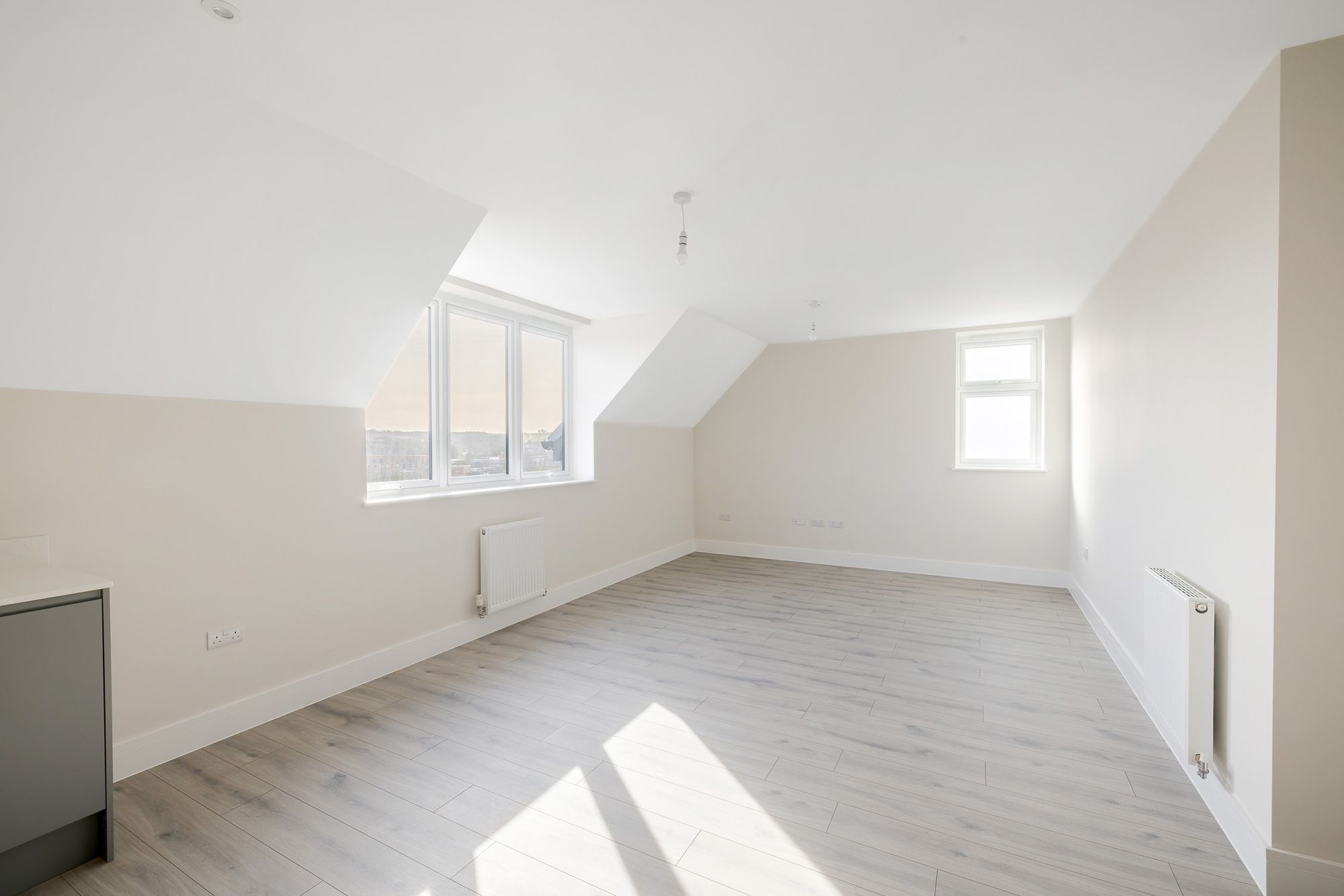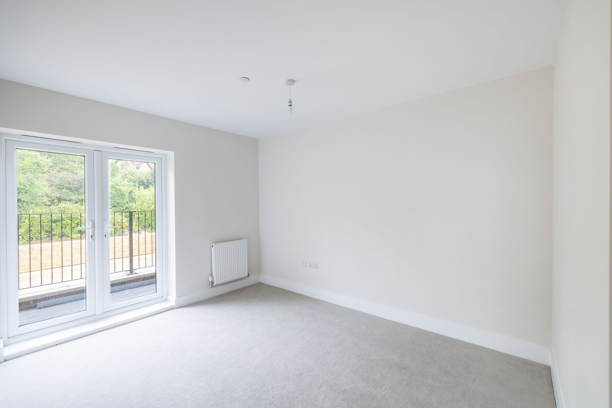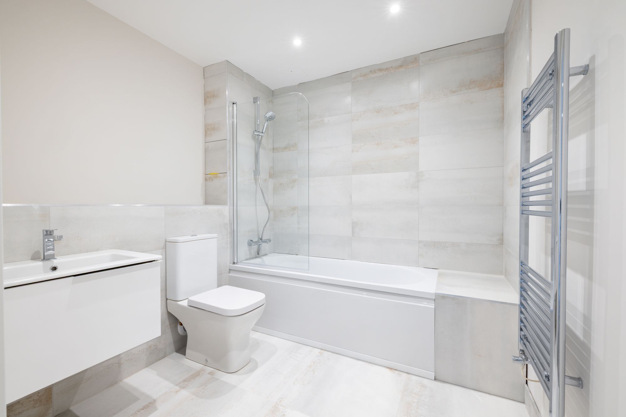 All three bedrooms are generously sized and offer a calm, restful feel. The main bedroom benefits from a private en-suite, while the family bathroom includes both a bath and a separate shower. Both spaces are finished with clean, modern lines, high-quality chrome fittings, and built-in vanity storage.
