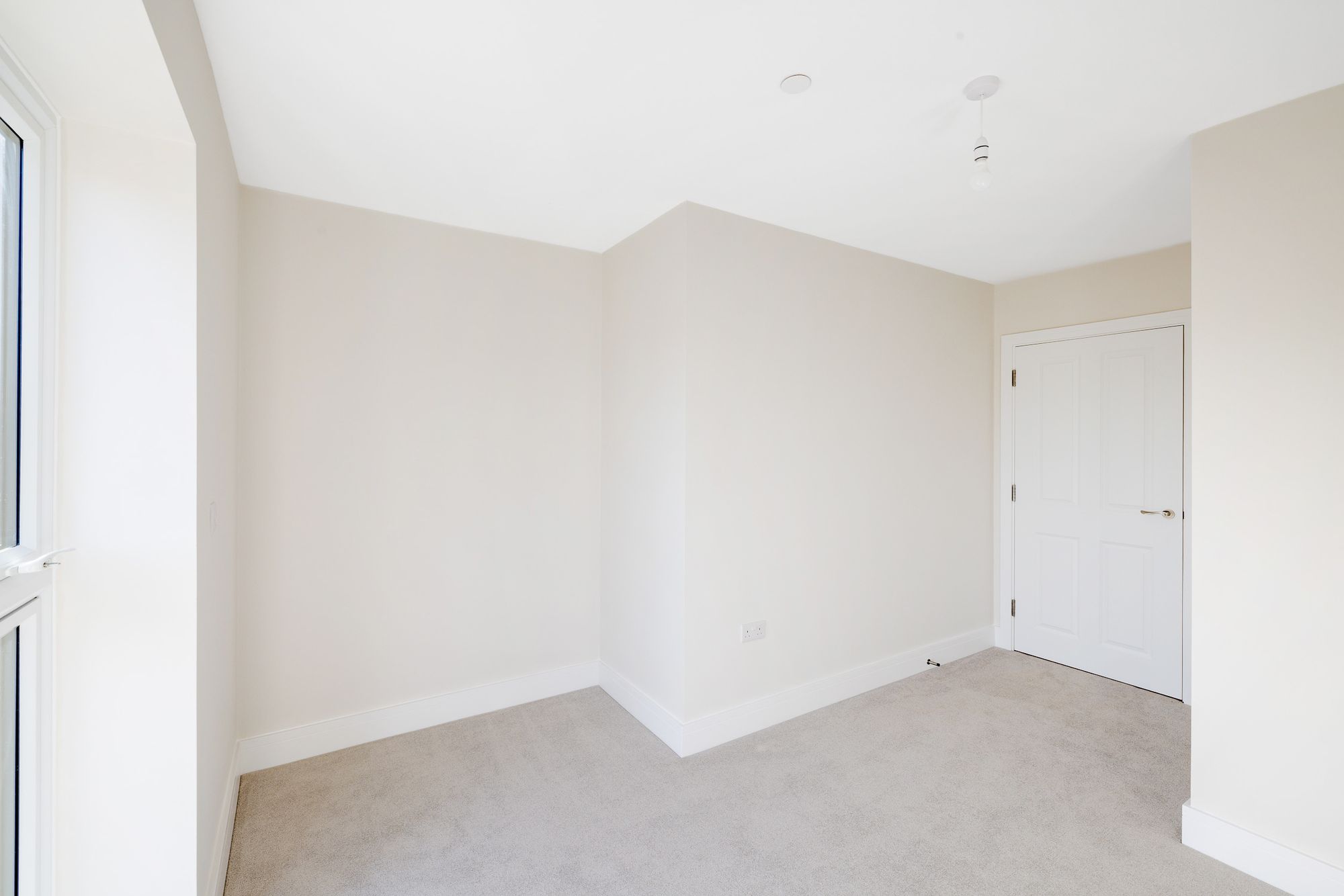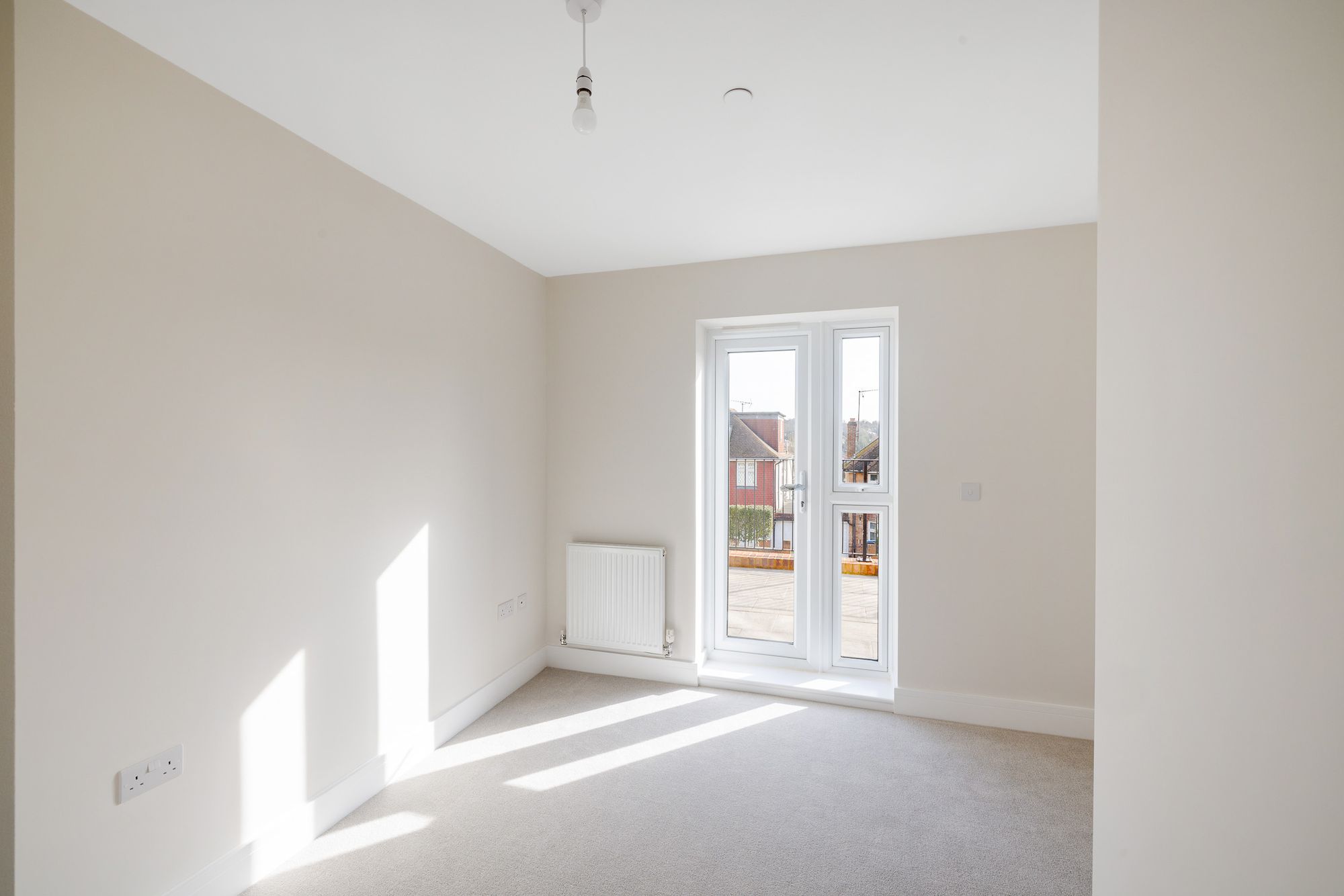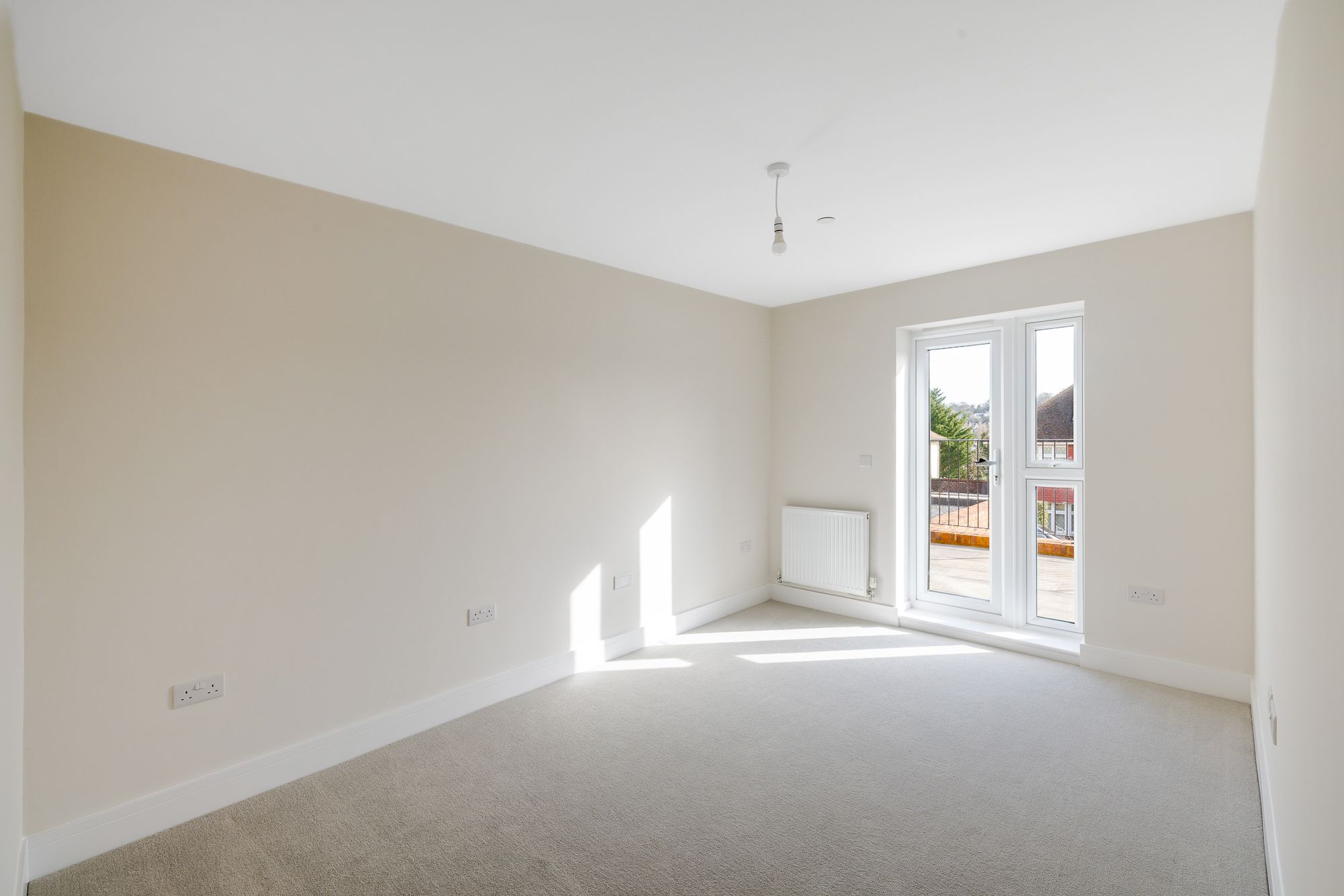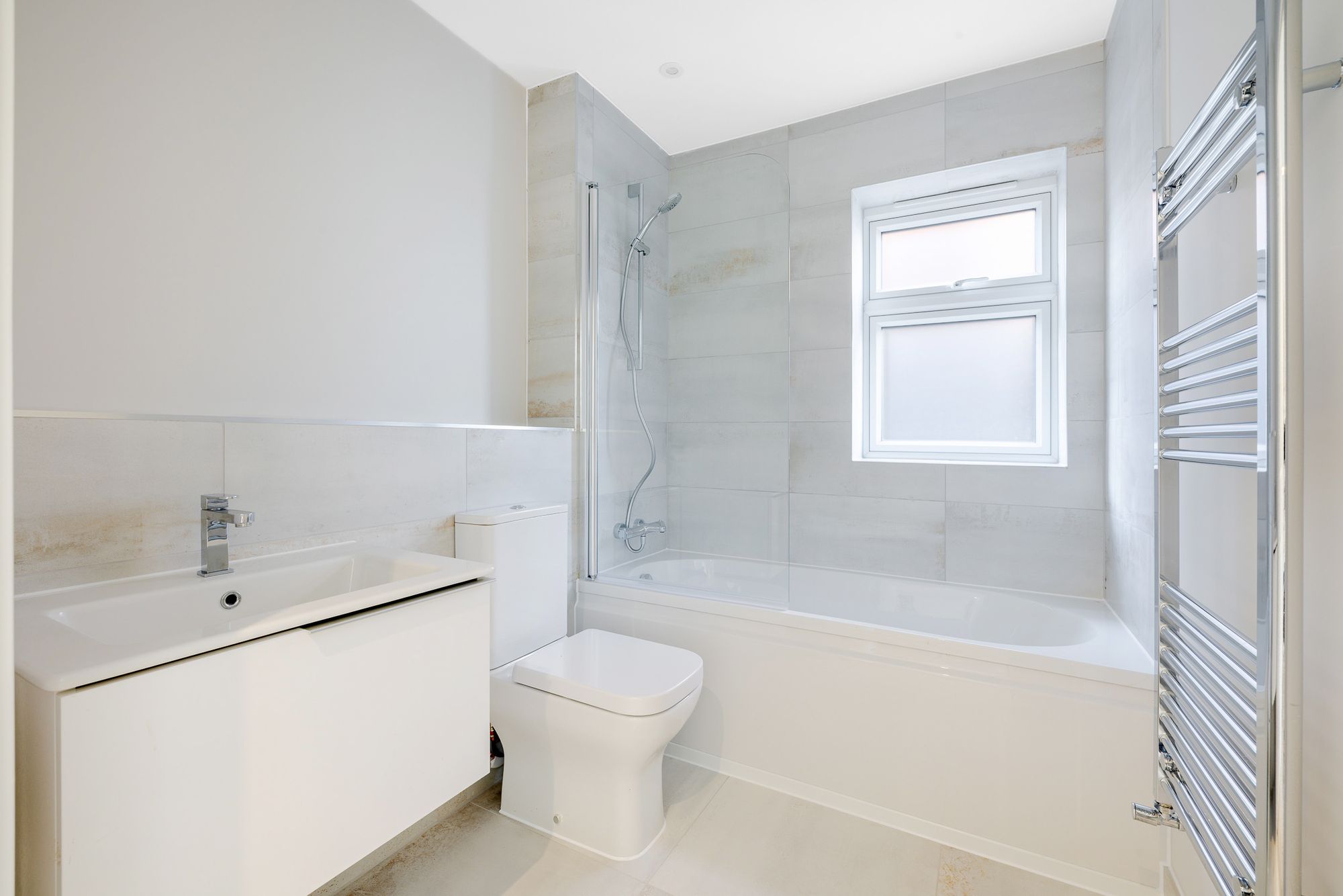 Both double bedrooms are generously proportioned, each offering a calm and restful retreat. The master bedroom enjoys the added benefit of a private en-suite, while the main bathroom features both a bath and a separate shower enclosure. Finished in a crisp contemporary white, both bathrooms are thoughtfully appointed with high-quality chrome fixtures, vanity units with storage, wall-mounted mirrors with integrated lighting, and durable, easy-maintenance surfaces.