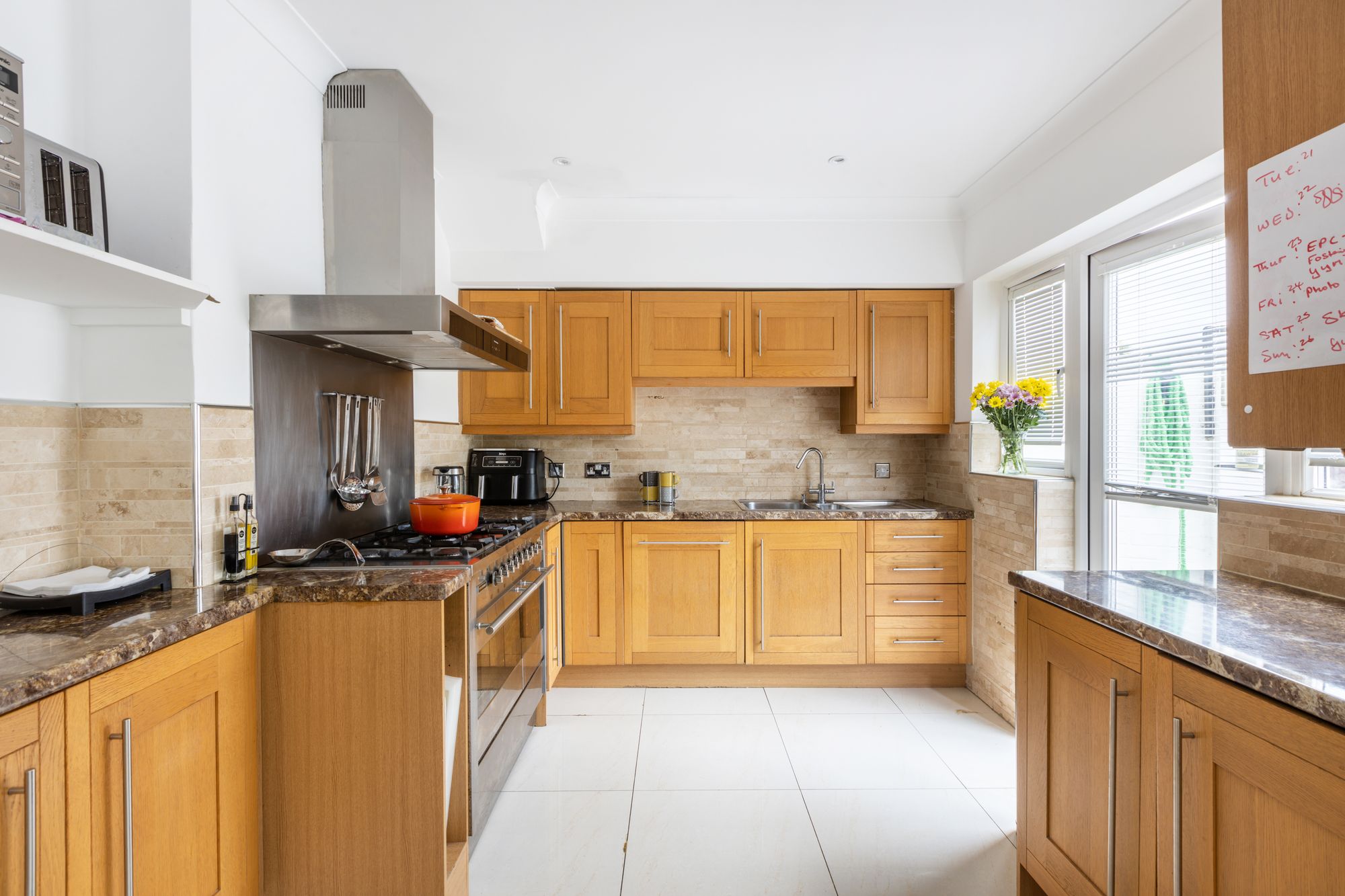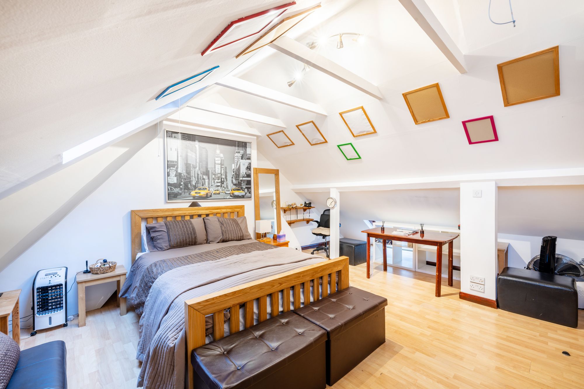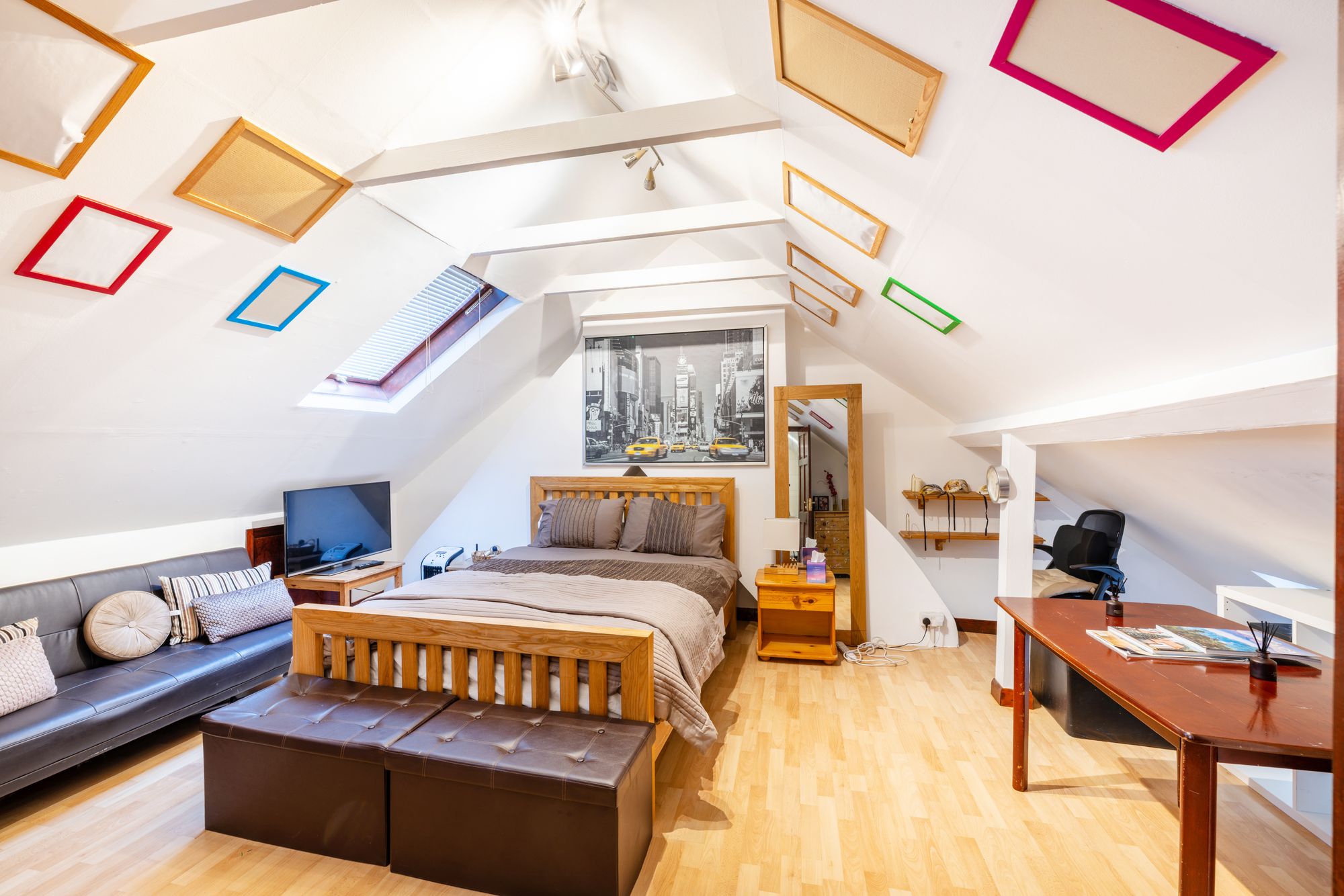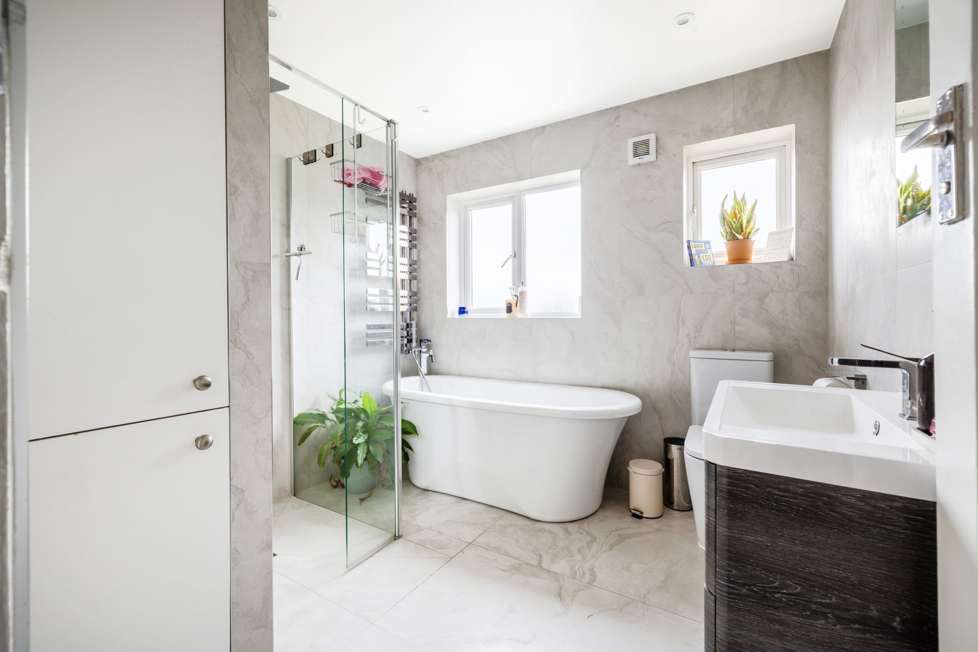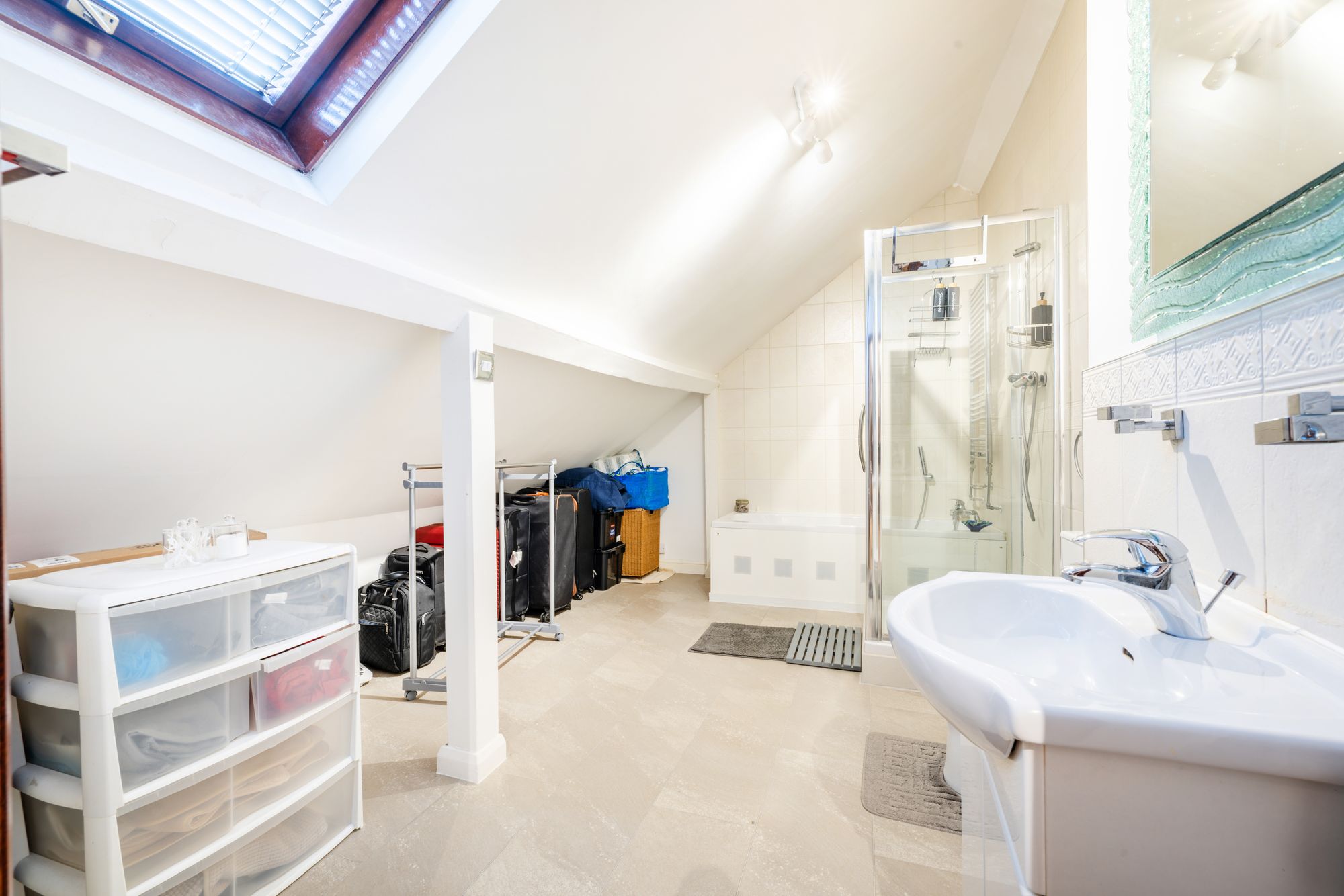 On the first floor, there are four well proportioned bedrooms and a recently installed contemporary family bathroom. The bathroom features a free-standing bath as well as a separate walk in shower, whilst two of the bedrooms benefit from newly fitted wardrobes. On the second floor, there’s a spacious double bedroom with VELUX windows and an abundance of eaves storage. The bedroom further benefits from a large en-suite bathroom with both a fitted bath and a separate shower cubicle.