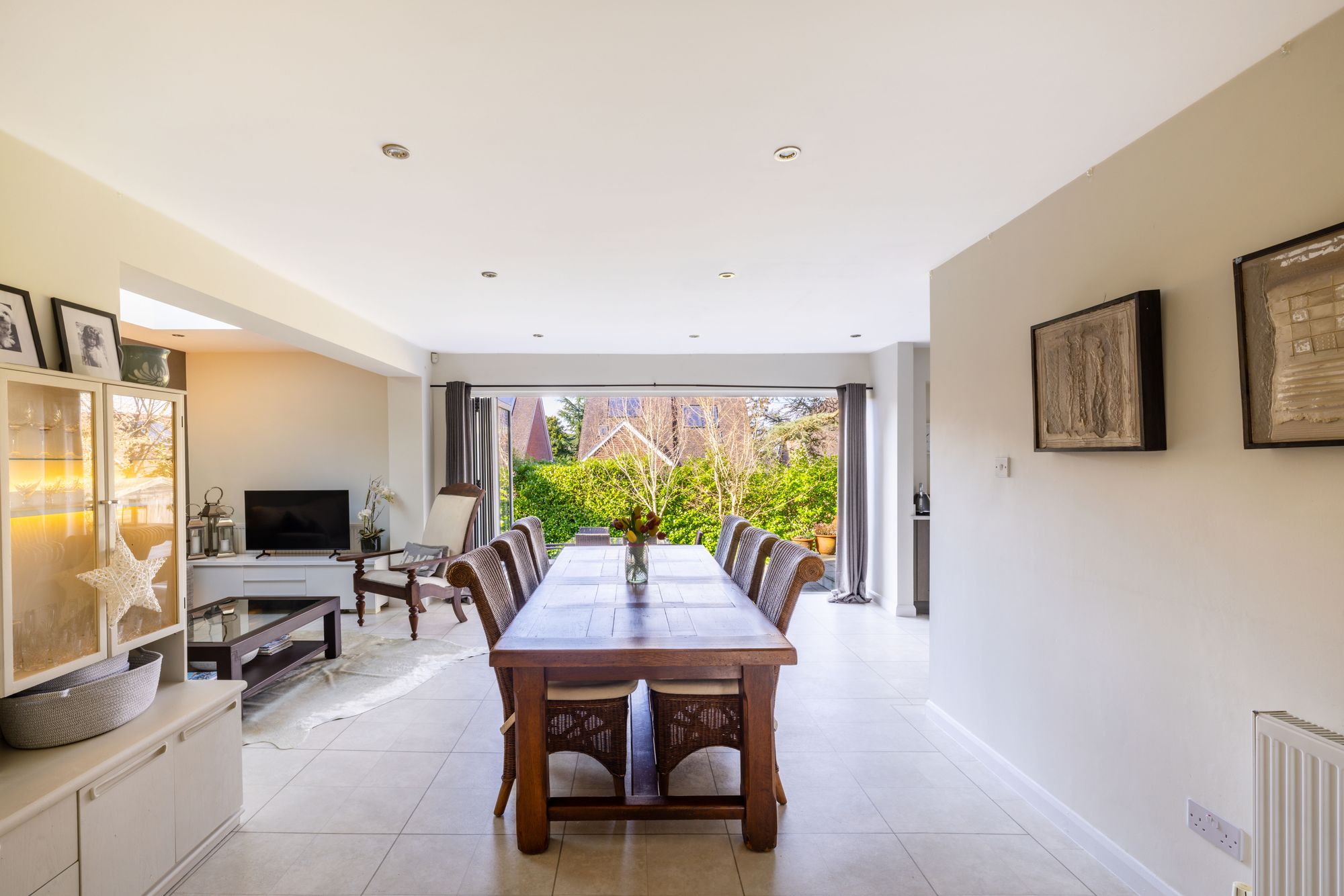 Continuing through, the dining room seamlessly extends the living space with bifold doors leading out to the patio area, flooding the room with natural light. Nestled within this open plan space is a cosy snug, creating the ideal setting for relaxation and social gatherings.