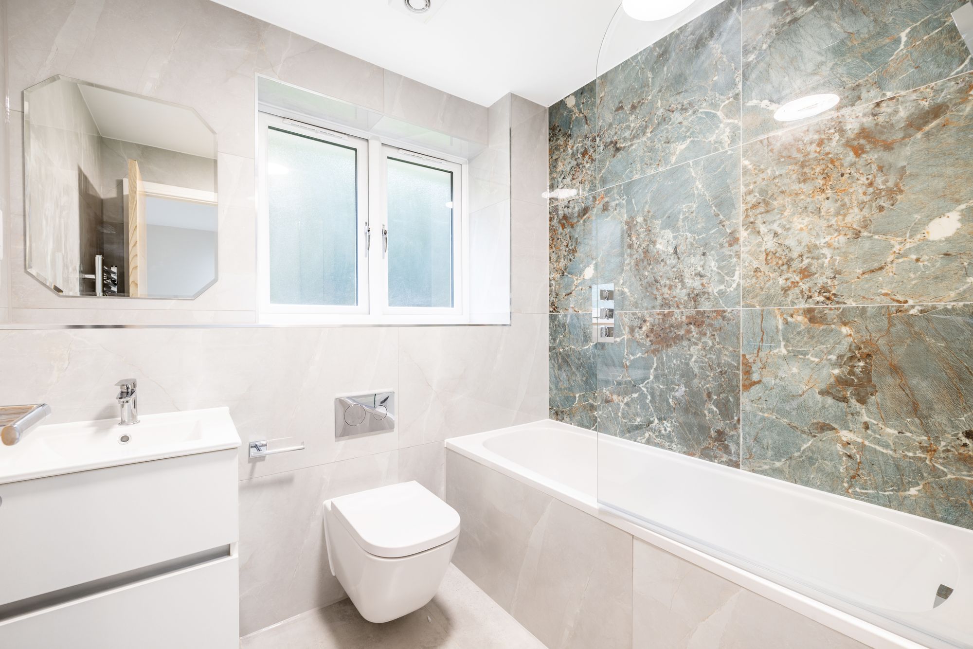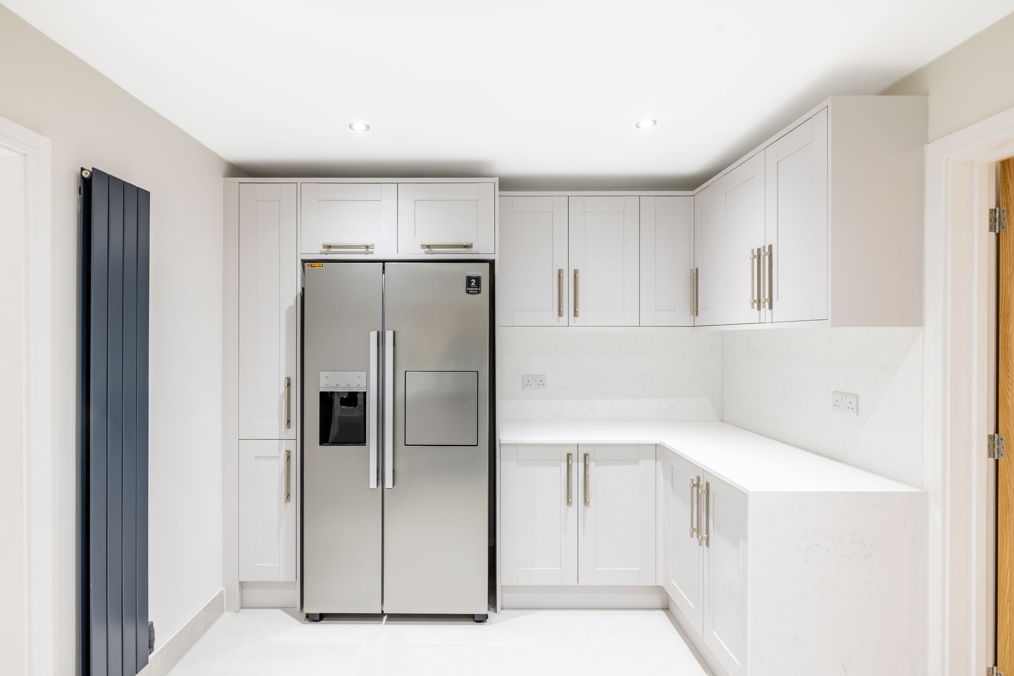 The main living room is a standout space, featuring a stylish fireplace, dual aspect windows, and French doors opening onto the rear garden, creating a bright and welcoming atmosphere. An archway leads through to the dining room, ideal for both family life and entertaining. The dining room connects to the separate kitchen, which benefits from quartz work surfaces, a full range of integrated appliances, and contemporary cabinetry. A separate utility room provides additional practicality. To the front of the property is a further reception room, currently used as a study/playroom, offering excellent flexibility.