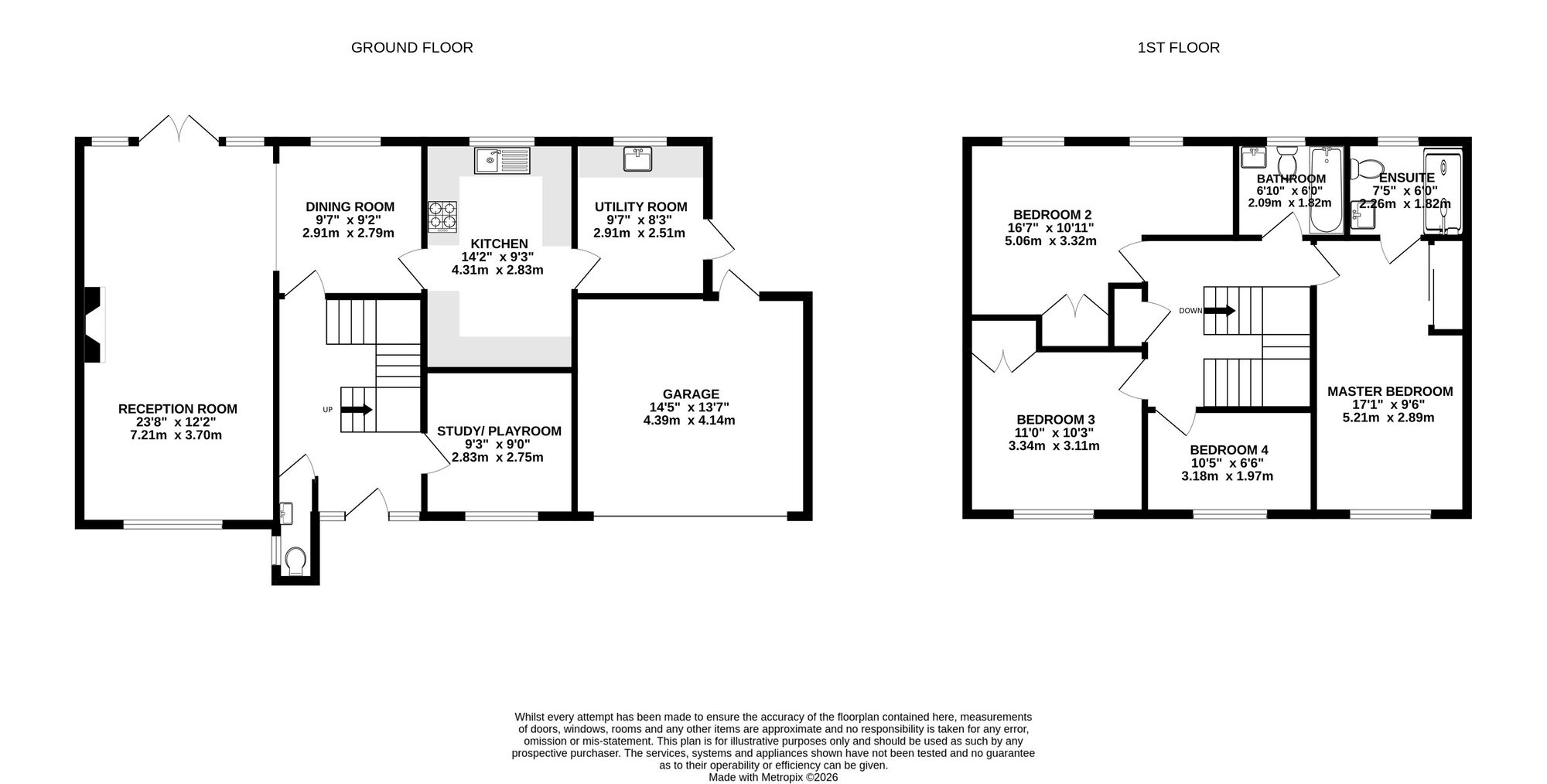 Upstairs, the property comprises four well proportioned double bedrooms. The principal bedroom benefits from built in wardrobes and a modern en suite shower room. A contemporary family bathroom and an additional storage cupboard are located off the landing.