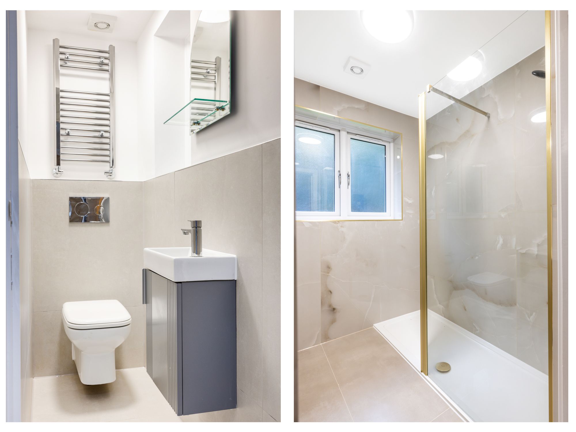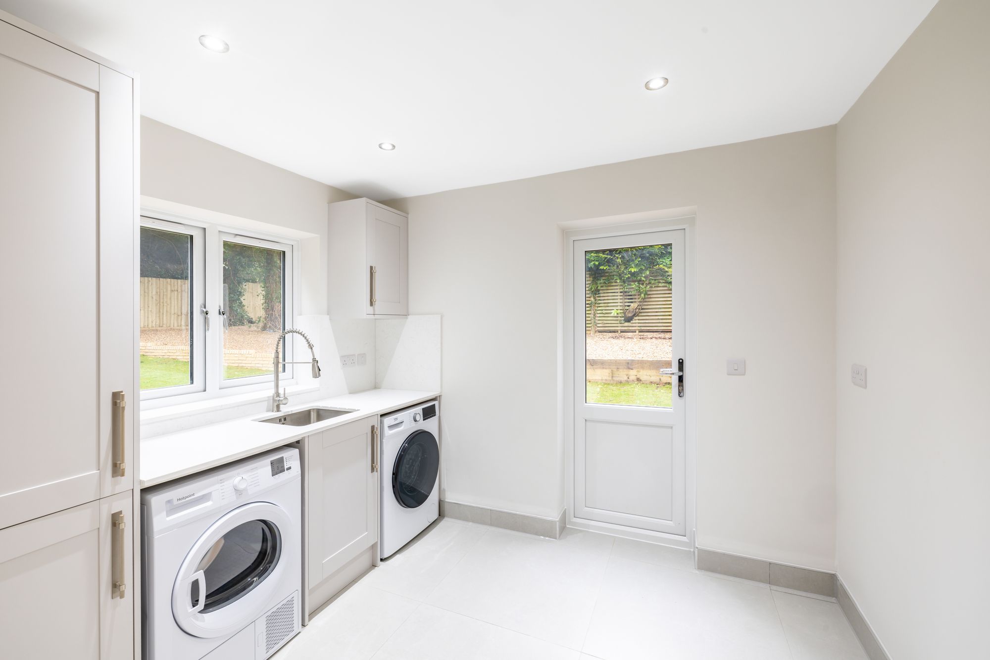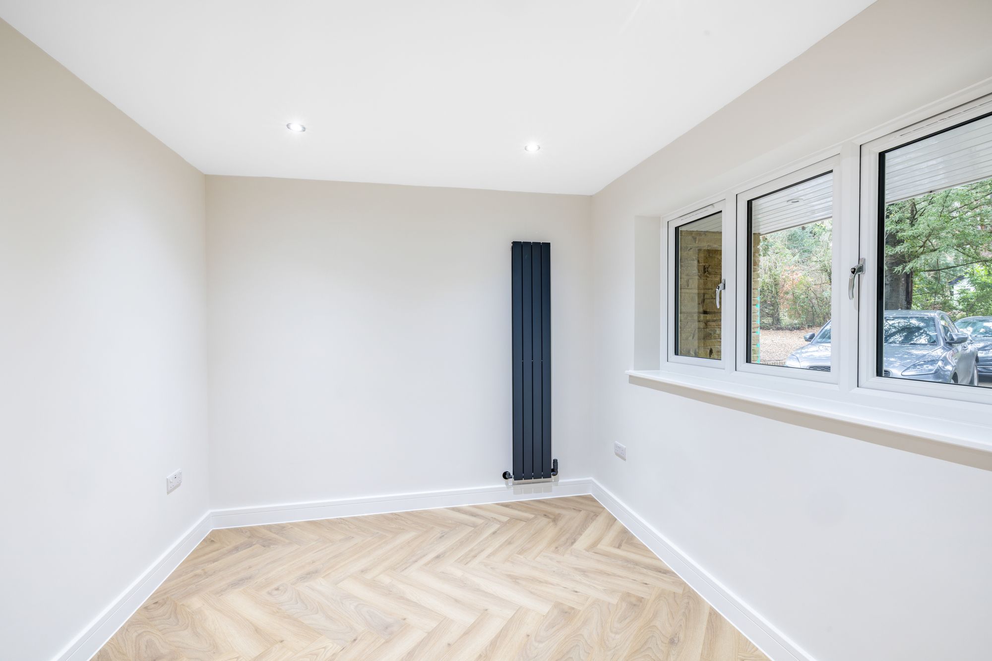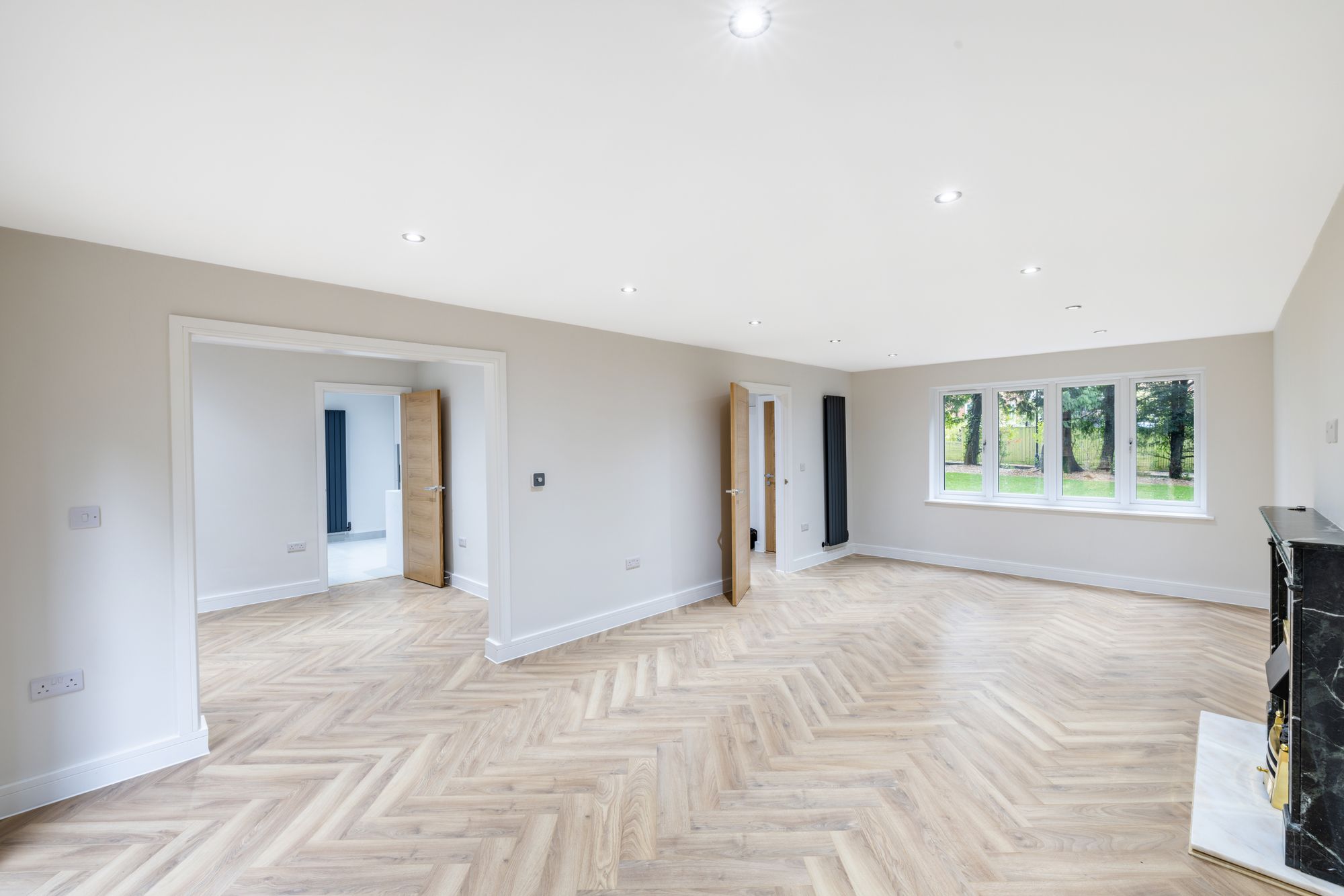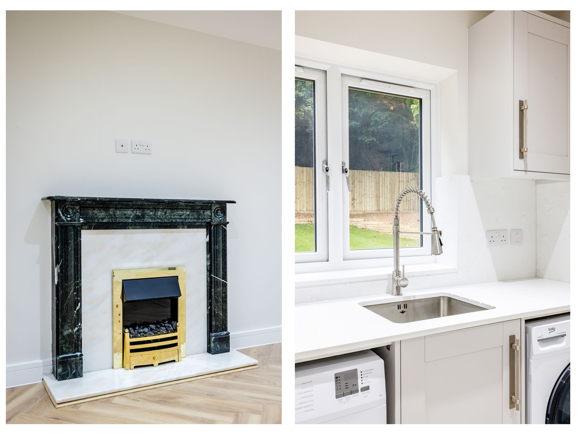 The main living room is a standout space, featuring a stylish fireplace, dual aspect windows, and French doors opening onto the rear garden, creating a bright and welcoming atmosphere. An archway leads through to the dining room, ideal for both family life and entertaining. The dining room connects to the separate kitchen, which benefits from quartz work surfaces, a full range of integrated appliances, and contemporary cabinetry. A separate utility room provides additional practicality. To the front of the property is a further reception room, currently used as a study/playroom, offering excellent flexibility.