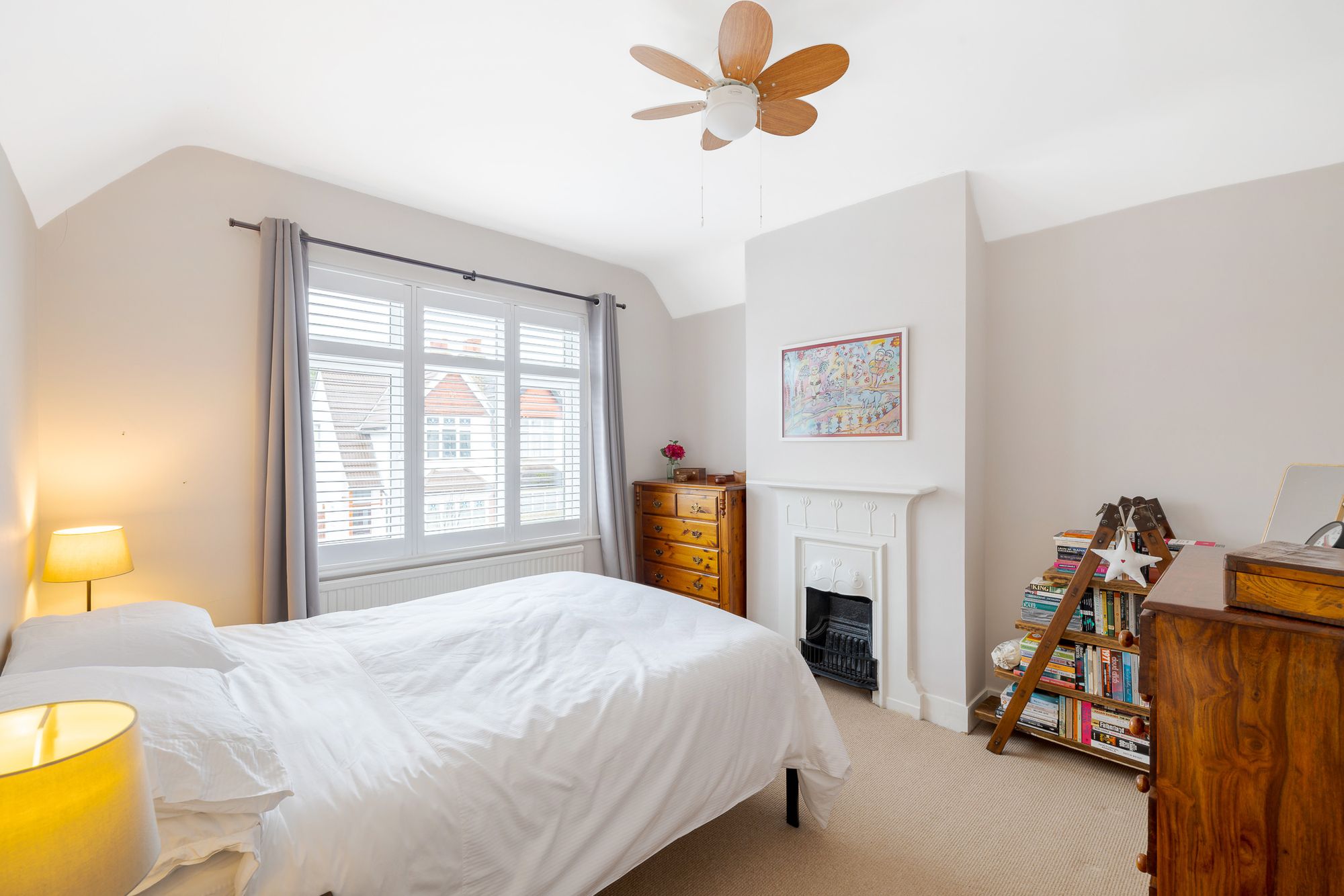 The larger than typical property is approached via a charming front garden and opens into a welcoming hallway. To the front, the inviting open-plan living and sitting room area is a real highlight, boasting a striking square bay window and a feature fireplace. Wooden shutters add both style and privacy, making the whole space ideal for both everyday living and entertaining, while a door provides direct access to the rear garden from the sitting room.